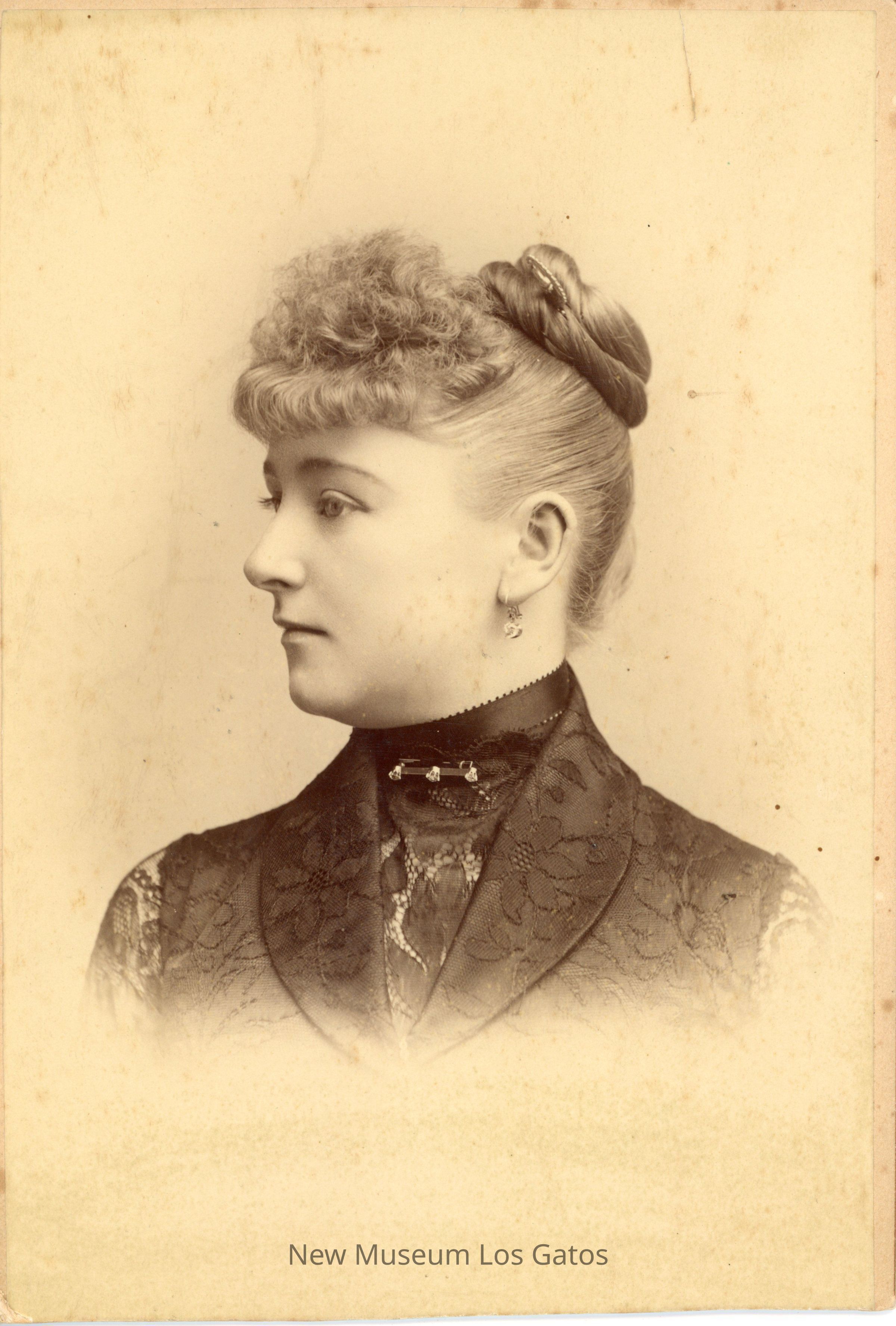 A black and white photograph of a portrait of one of Charles McKiernan's daughters. She has her head turned towards the left, and has her hair twirled up into a bun. She is wearing a dark colored dress with lace detailing, and a dangly earring. The photograph is surrounded by a white border.