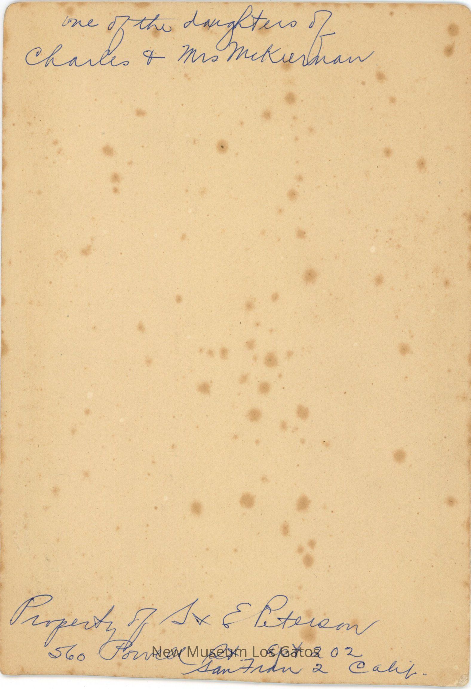 one of the daughters of Charles & Mrs. McKiernan Property of S & E Peterson 560 Powell St. Apt 202 San Fran 2 Calif.