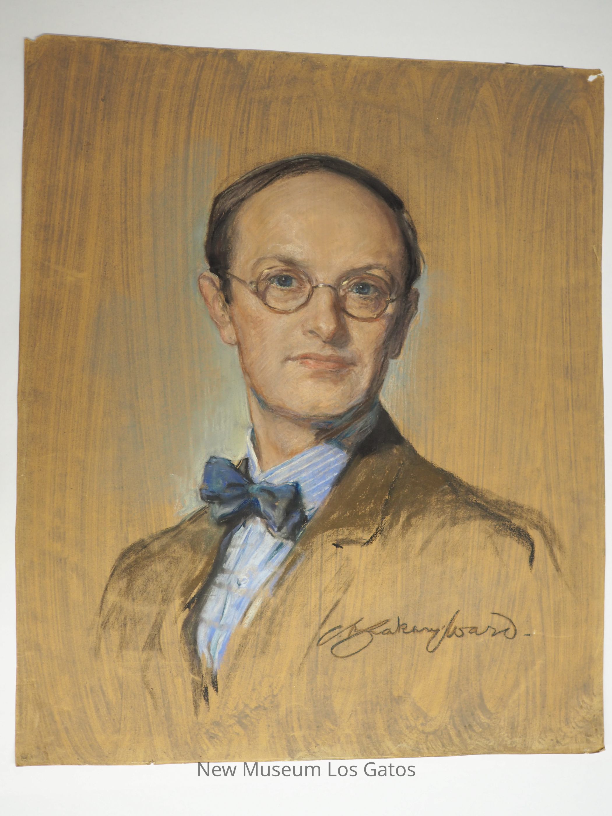A portrait painting of Frank Ingerson. The subject has blue eyes and dark hair, and wears round gold rimmed glasses, a brown suit jacket, a blue and white collared shirt and dark blue bowtie. The gray background is painted with watercolor and the portrait is drawn with color pastels.Artwork Details