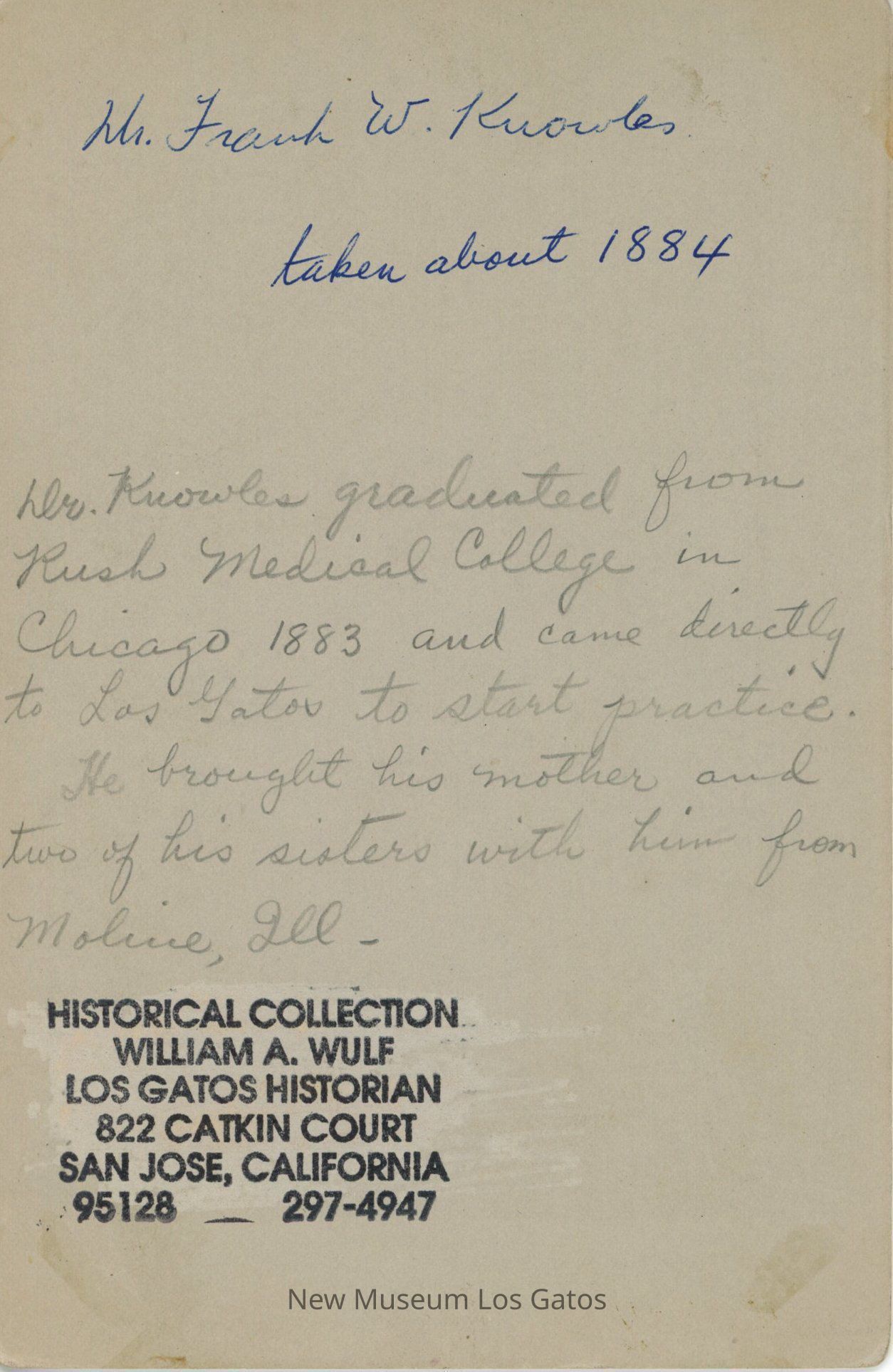 Dr. Knowles graduated from Rush Medical College in Chicago in 1883 and came directly to Los Gatos to start practice. He brought his mother and two of his sisters with him from Moline, Ill.Language