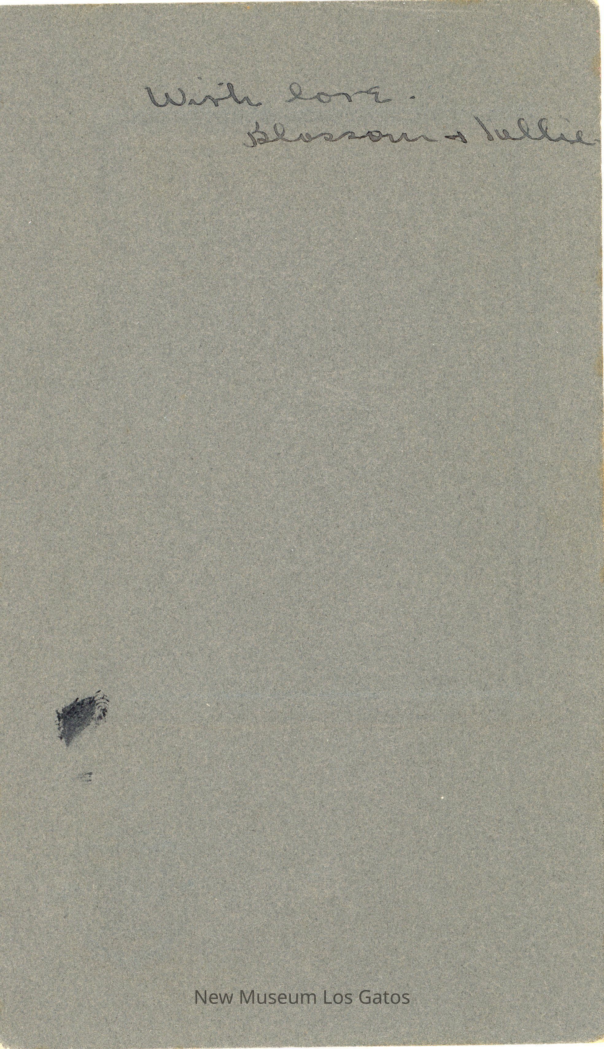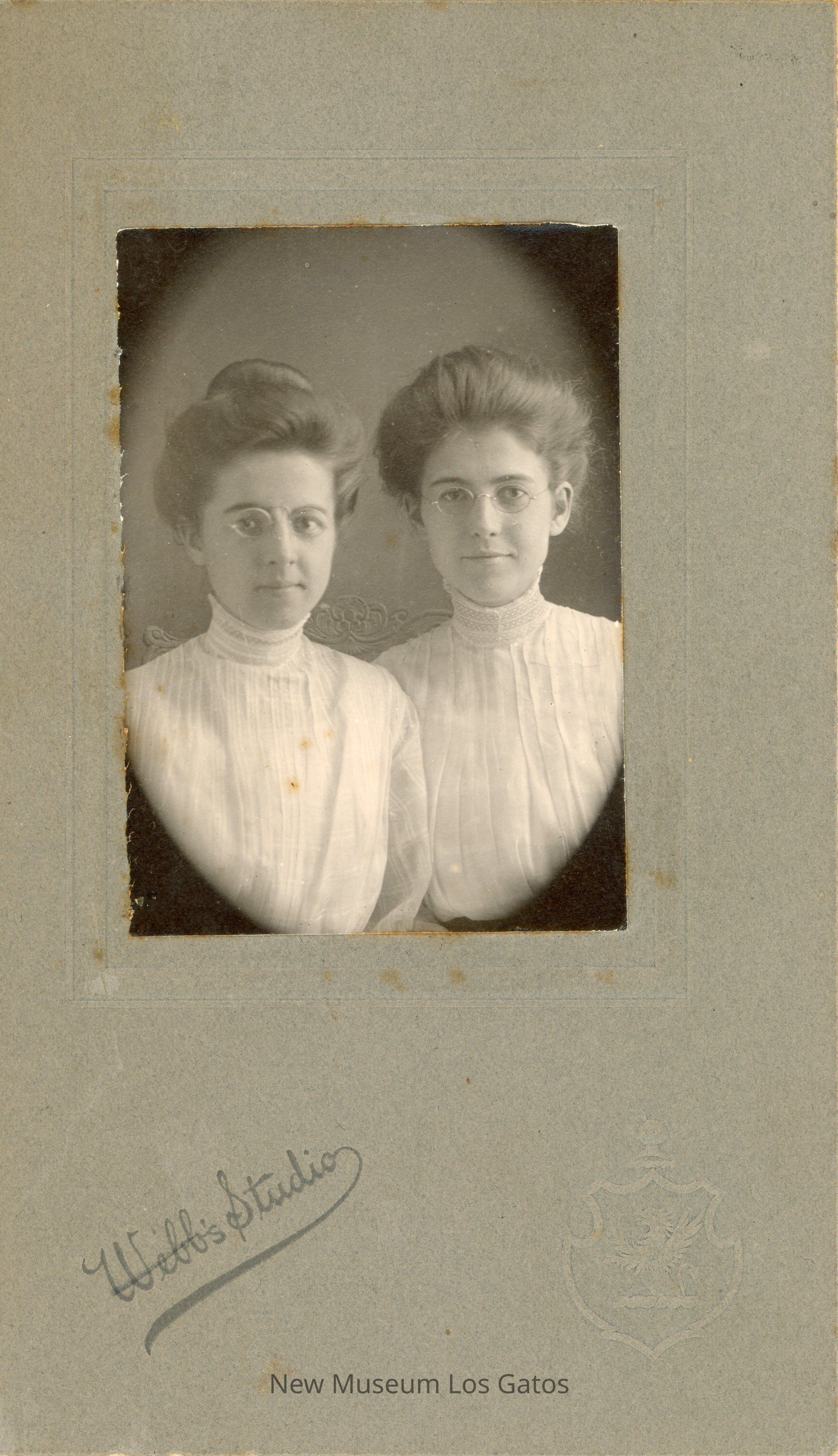 A black and white photograph of a portrait of two unidentified women. Both women are wearing plain white tops that cover the neck, as well as glasses. Both women have their hair up. The photograph is surrounded by a light gray border, with vendor inscriptions and an embossed logo below the image.
