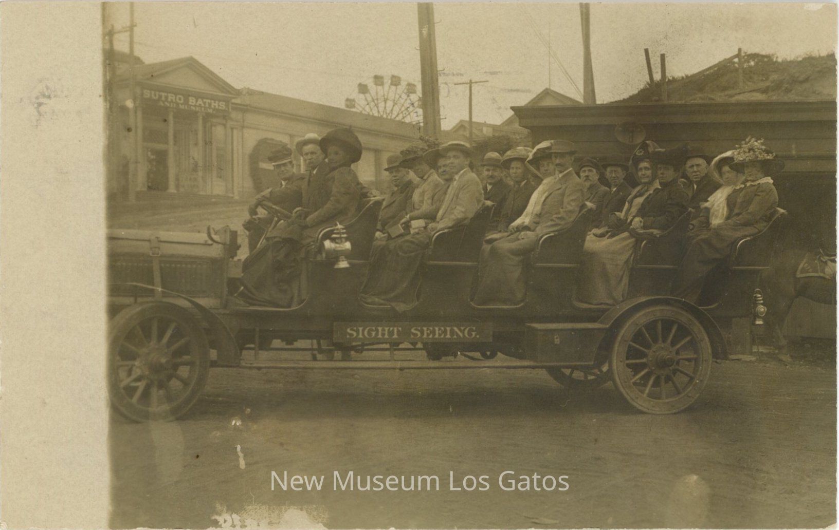 A postcard featuring a black and white photograph of a large group of people in a sightseeing car. The postcard has been mailed, and includes an addressee, a stamp, and a message written in pencil.Collection