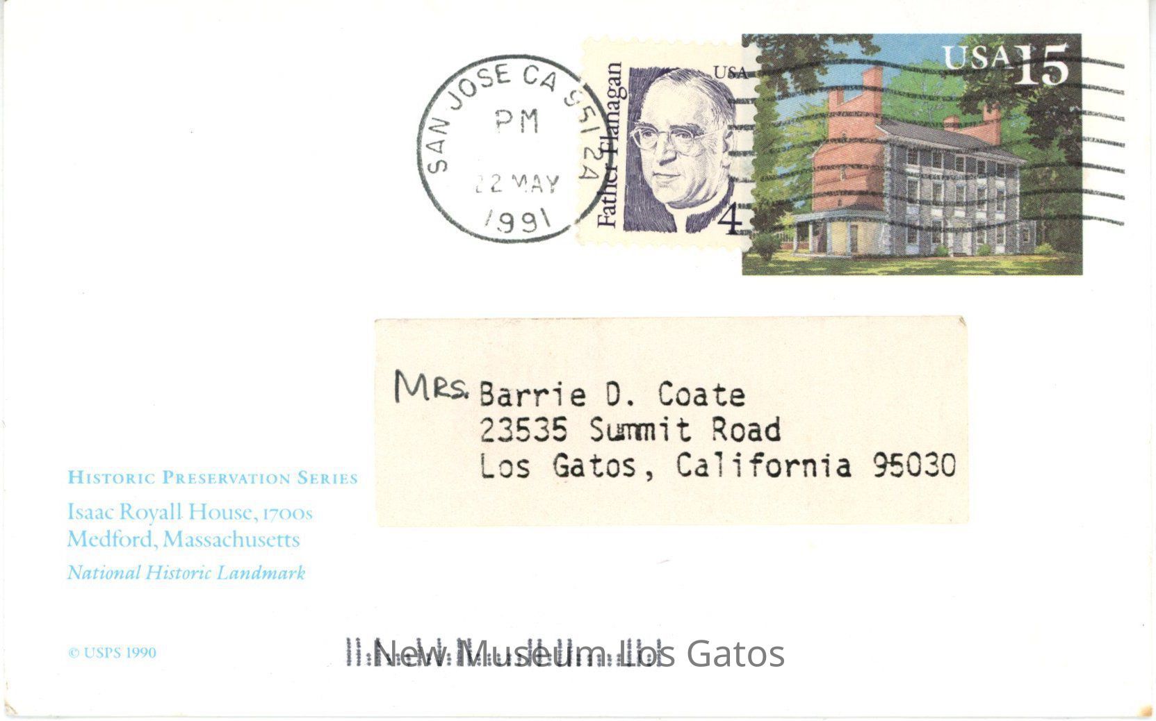 Small white postcard, addressed to Carol Coate, from unknown sender. There is a small illustration of the Isaac Royall House in Medford, Massachusetts, National Historic Landmark on the front. The back has a series of handwritten questions and answers.Collection