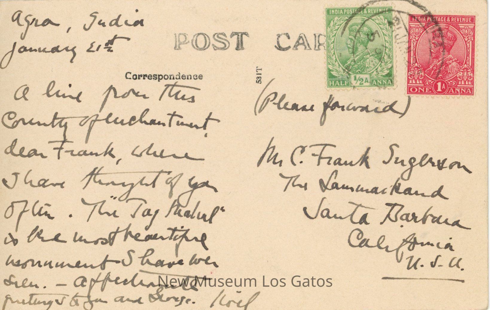Photograph postcard addressed to Frank Ingerson. The photograph is of the Taj Mahal. It is not clear who the postcard is from. The postcard is dated January 21st, 1923, and addressed to the Samarkand Hotel in Santa Barbara, where Frank and George were working on the landscaping for the hotel.Subject Place