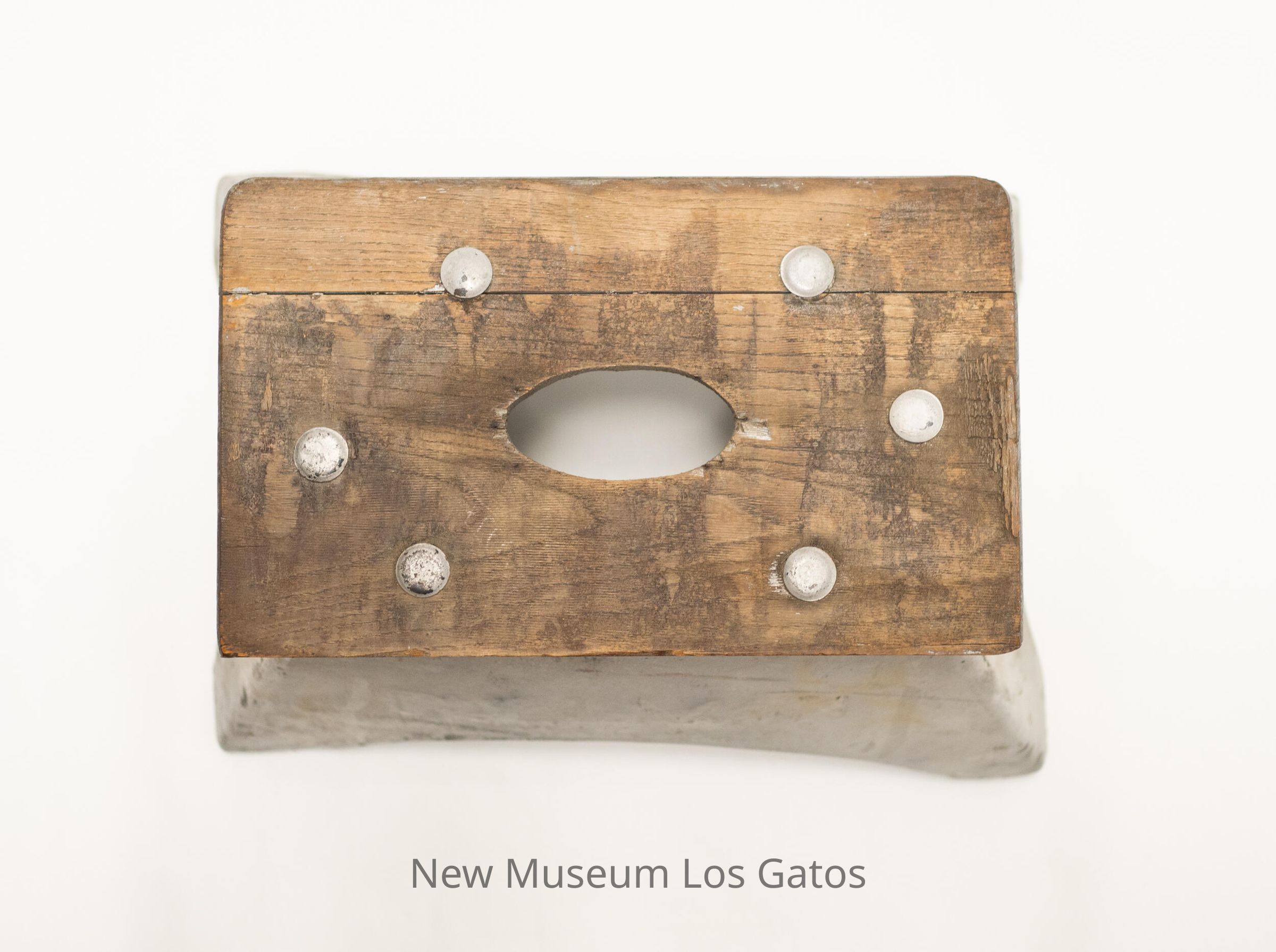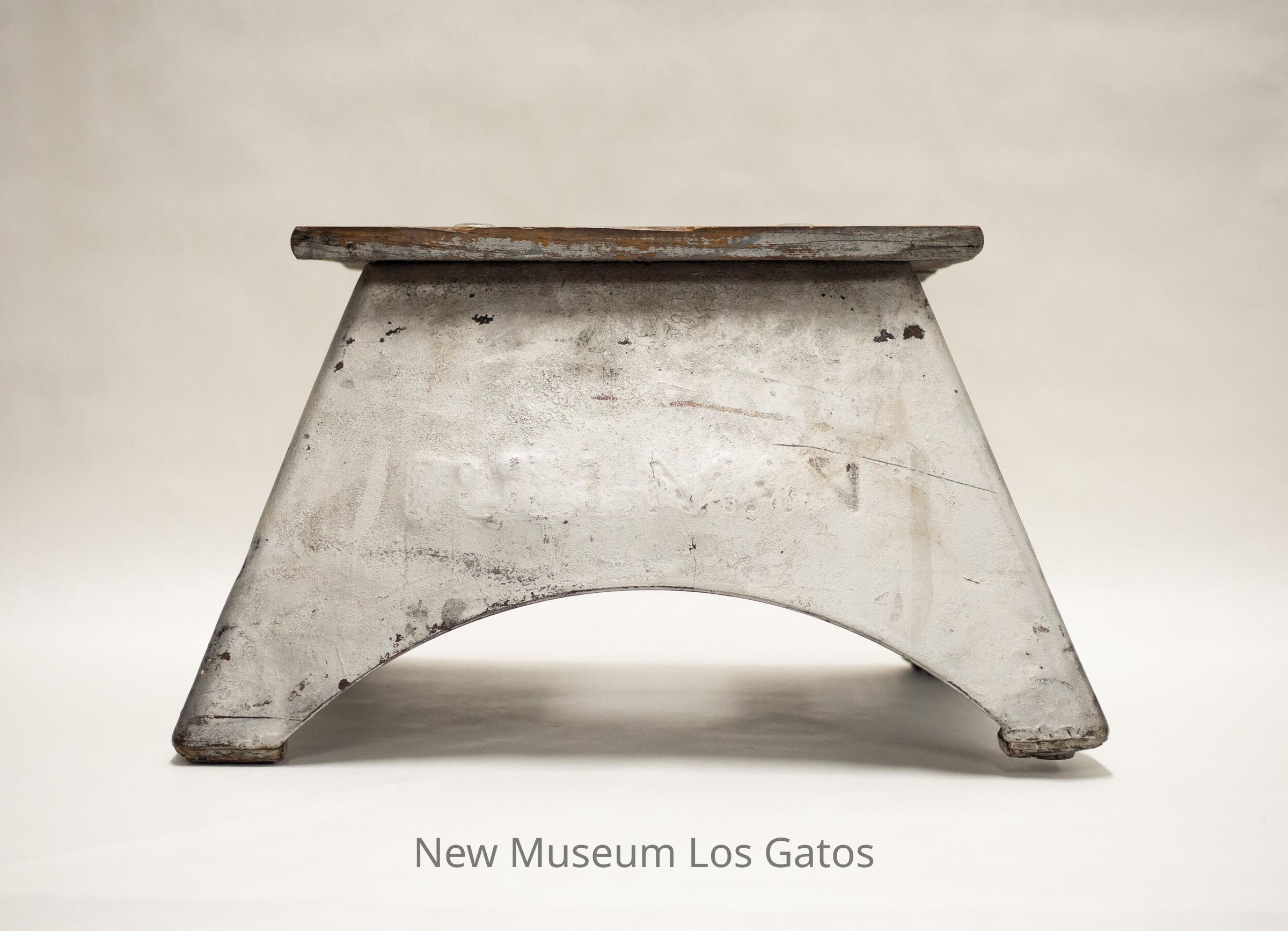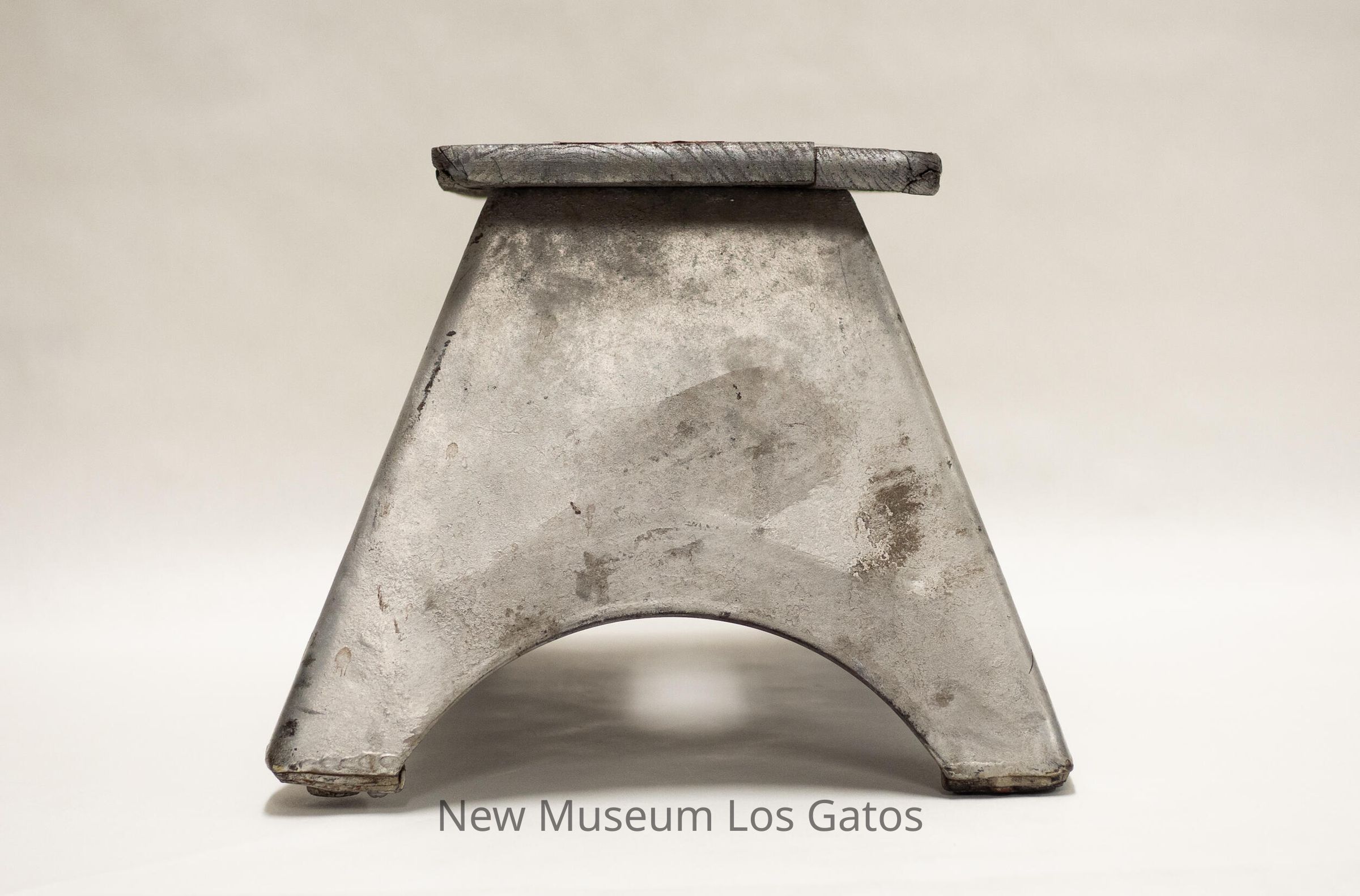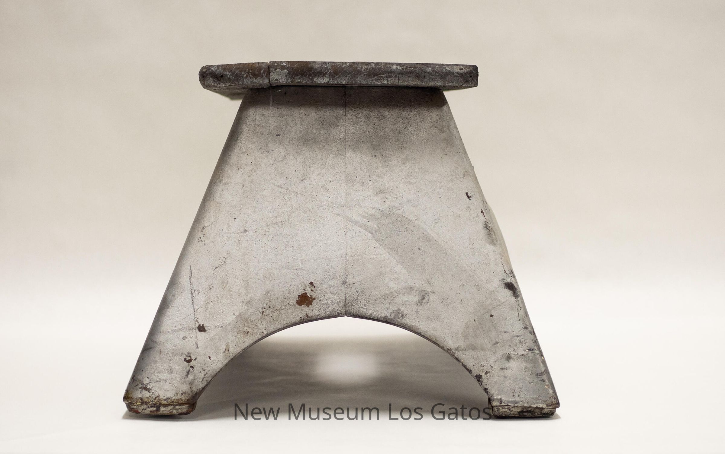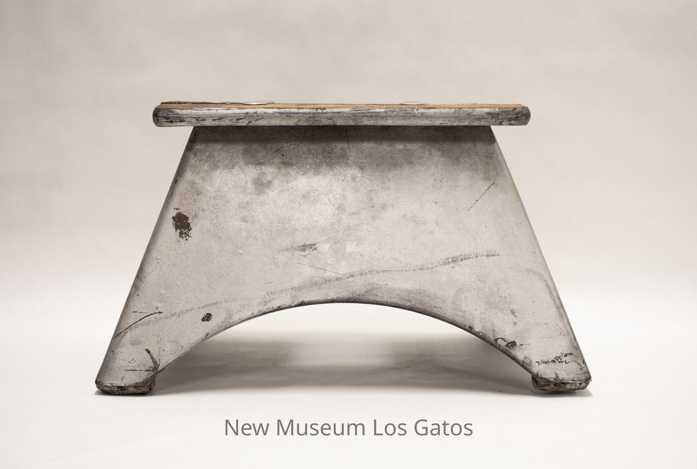 A pressed steel stool with a wooden top, that has been painted silver. The wood top has an oval hole in the center with six silver bolts surrounding it.
