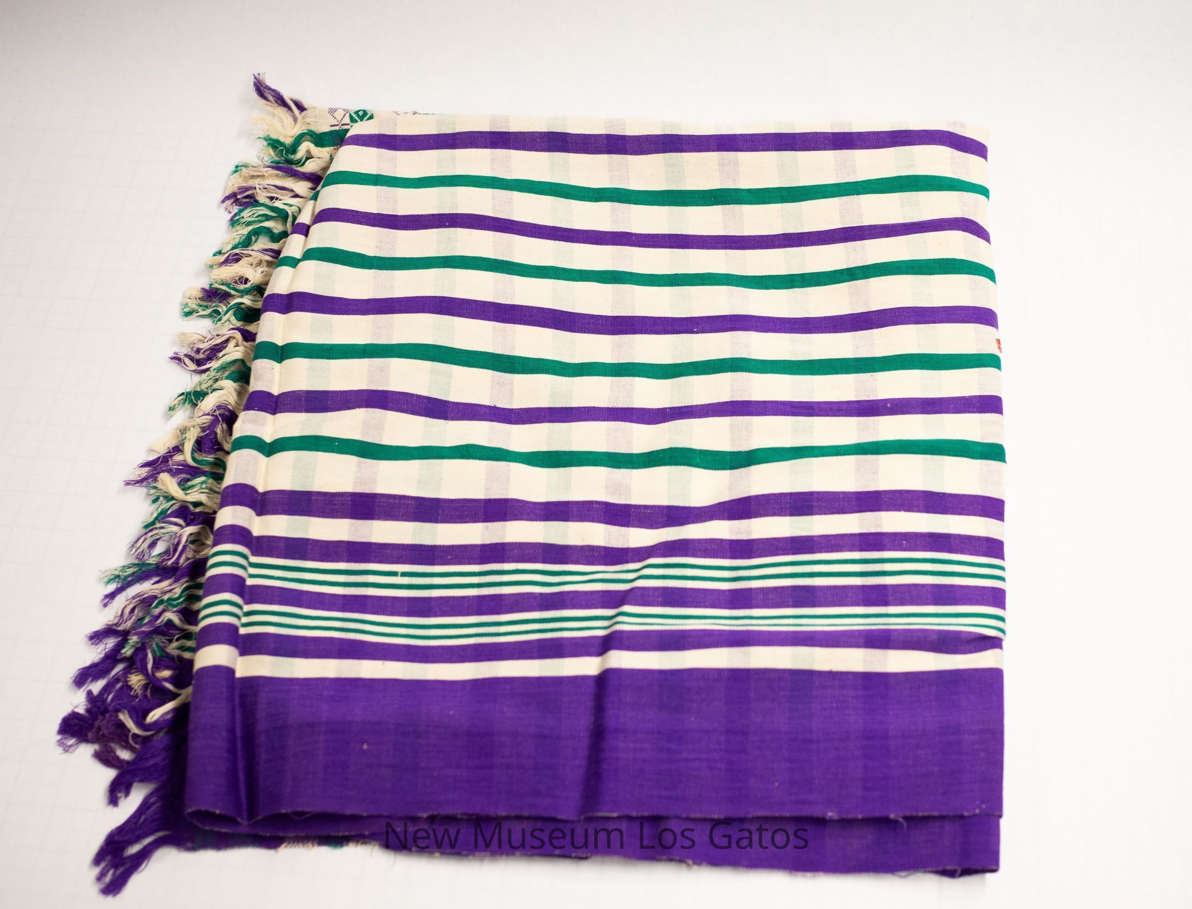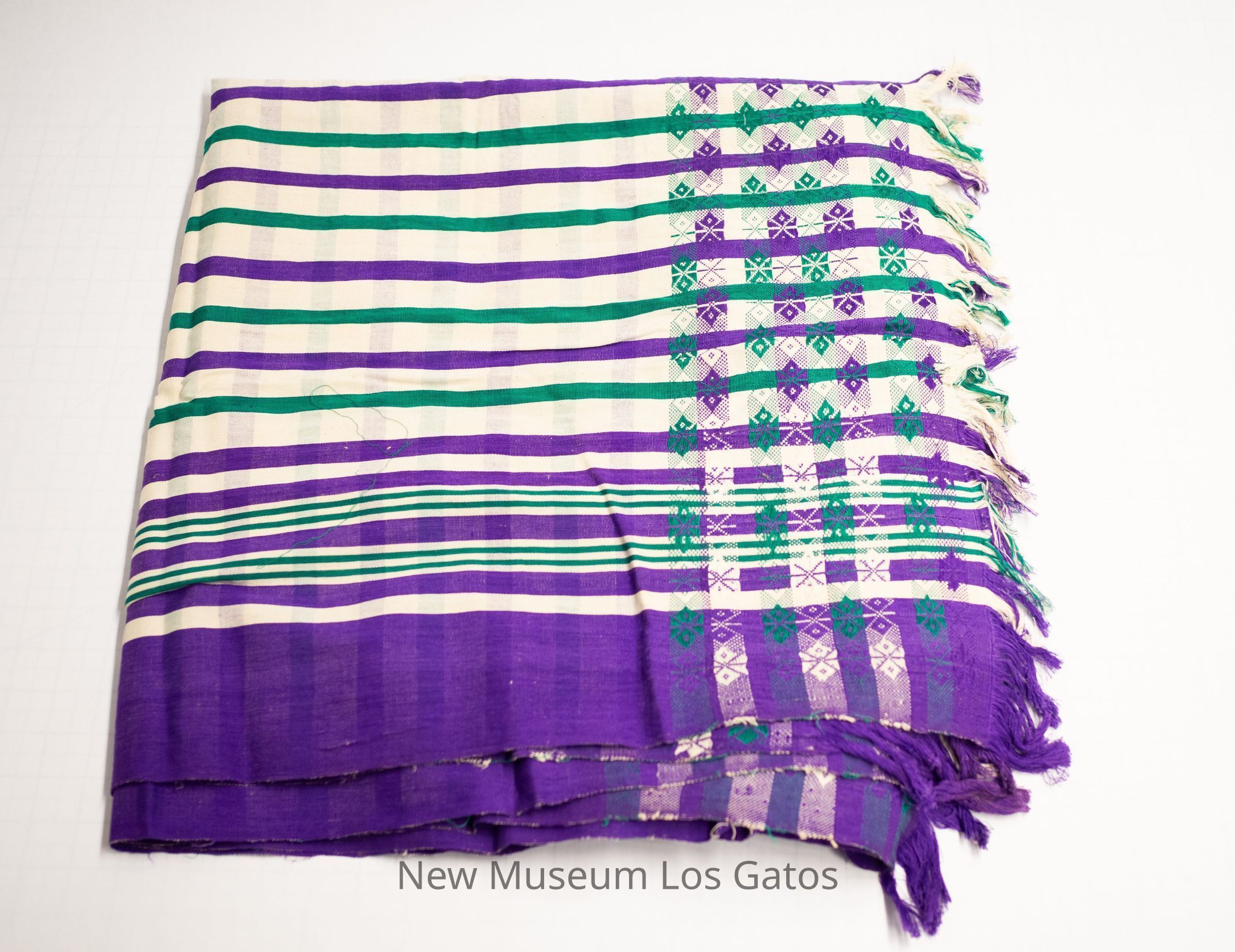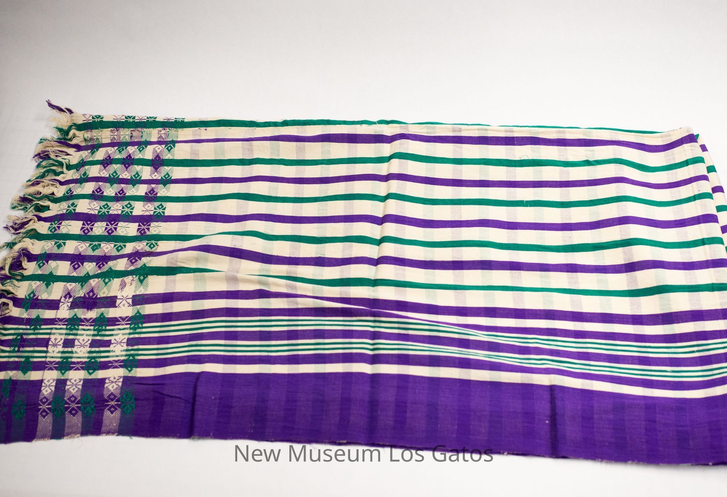 A large purple tapestry with geometric patterns stitched on the sides. There are also multiple purple and green lines throughout, with fringe at the ends.
