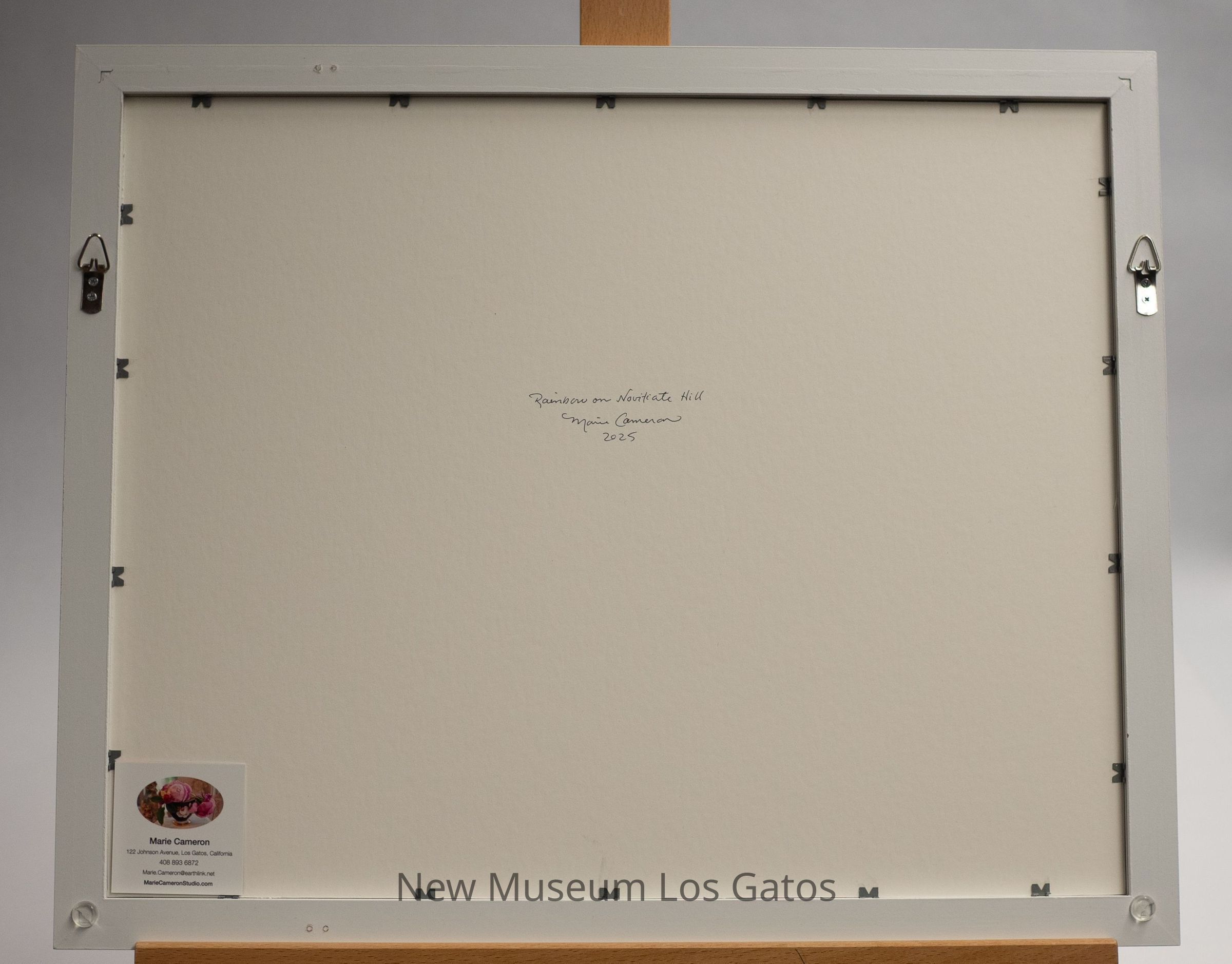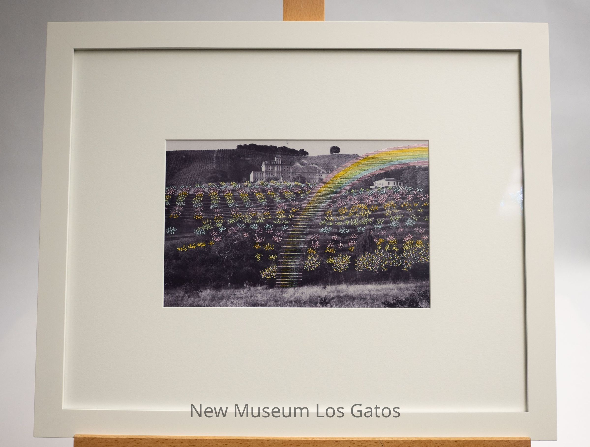 I began embroidering silk rainbows onto vintage photographs and postcards at the beginning of the pandemic as a meditation on how to remain grateful as I focused on wonder, awe, and hope on challenging days. I like to look to the past to remind myself of the long perspective where we as individuals, as a community, as a people, and as a place have endured and blossomed and continue to grow. In this series, that I have created especially for NUMU and its Director’s Circle, I hope to honor the love that we have for Los Gatos; infusing the feeling and the promise of a rainbow into these worn fragments of the past – a reminder to always strive to make our future bright as well.