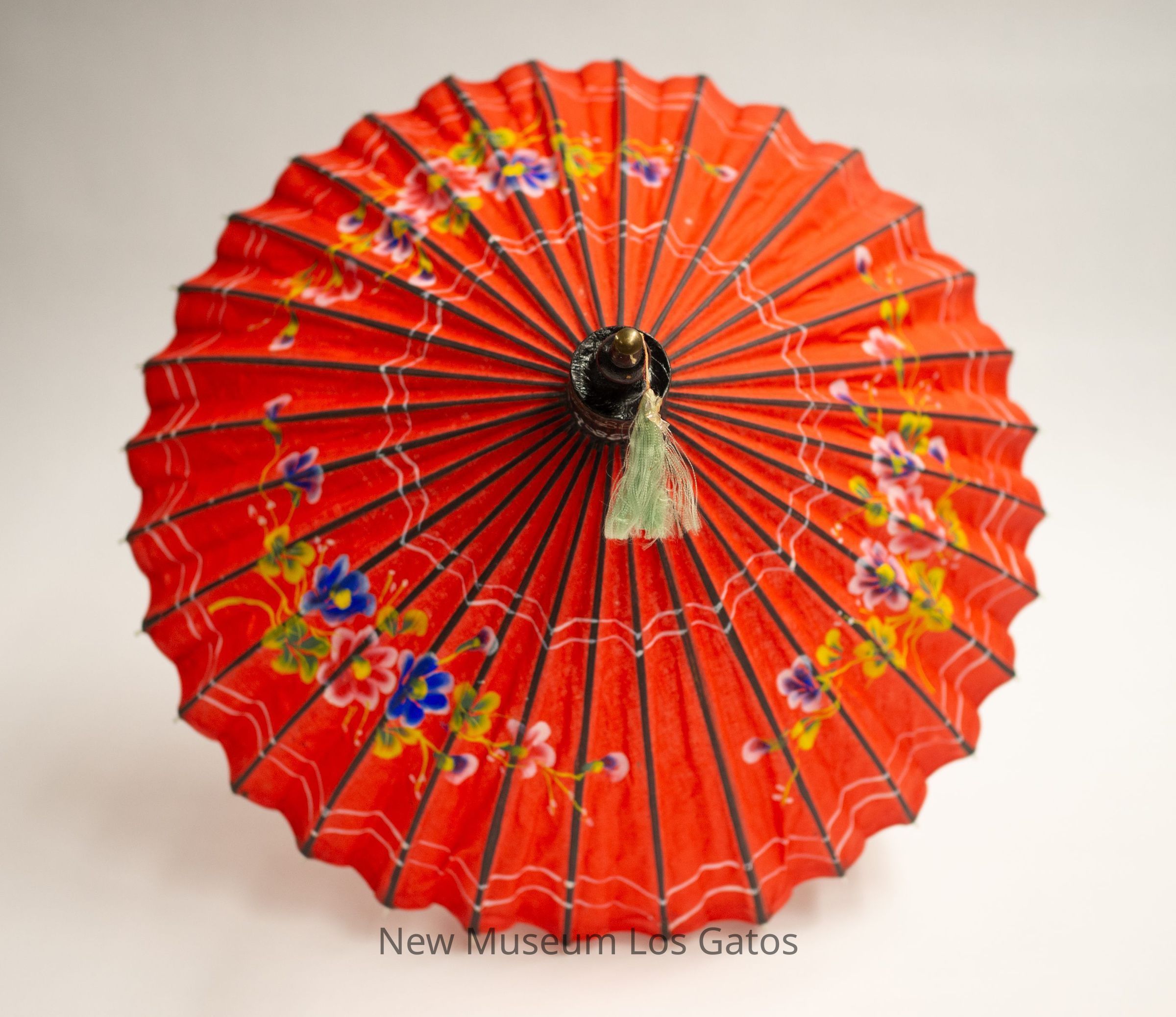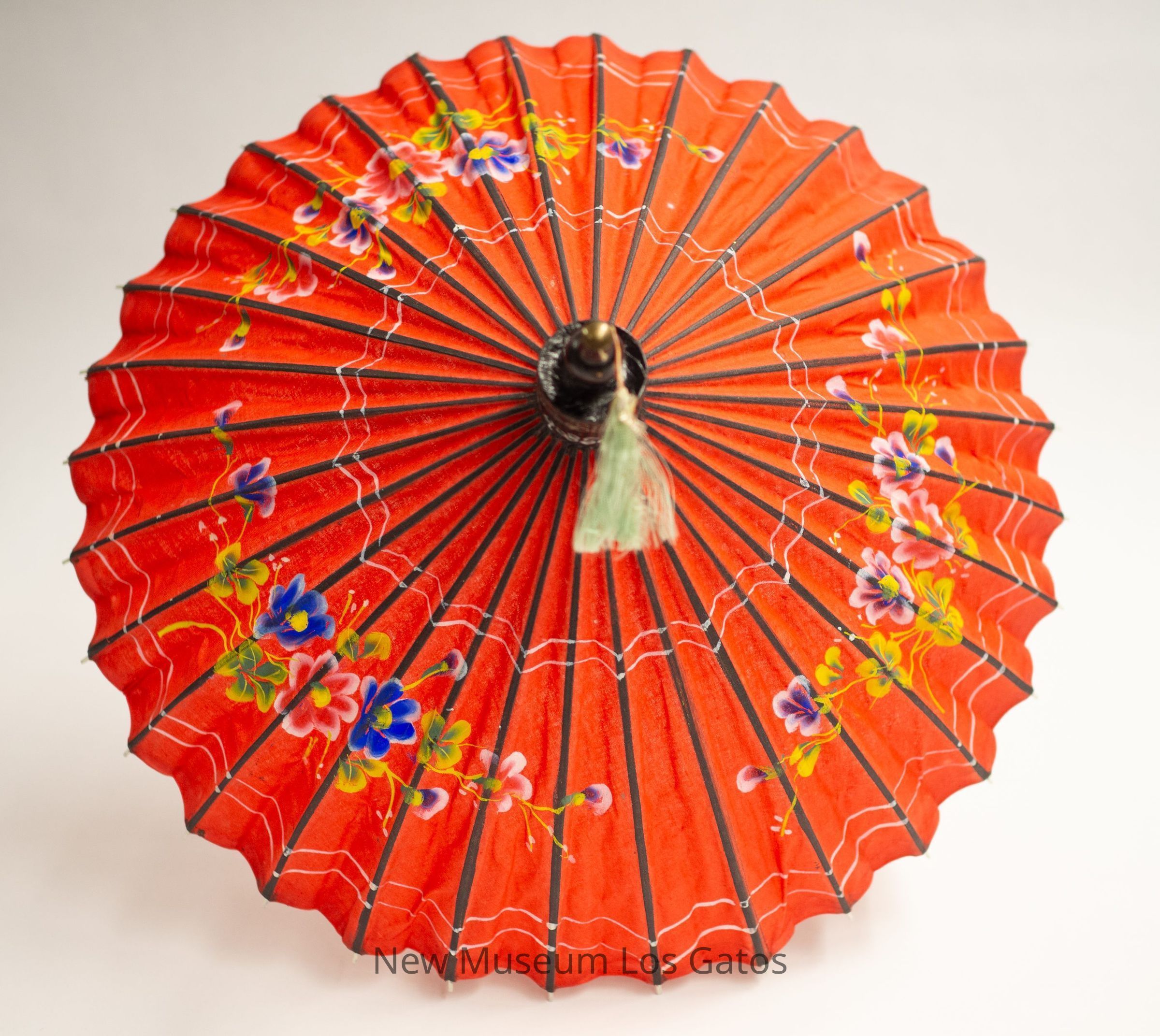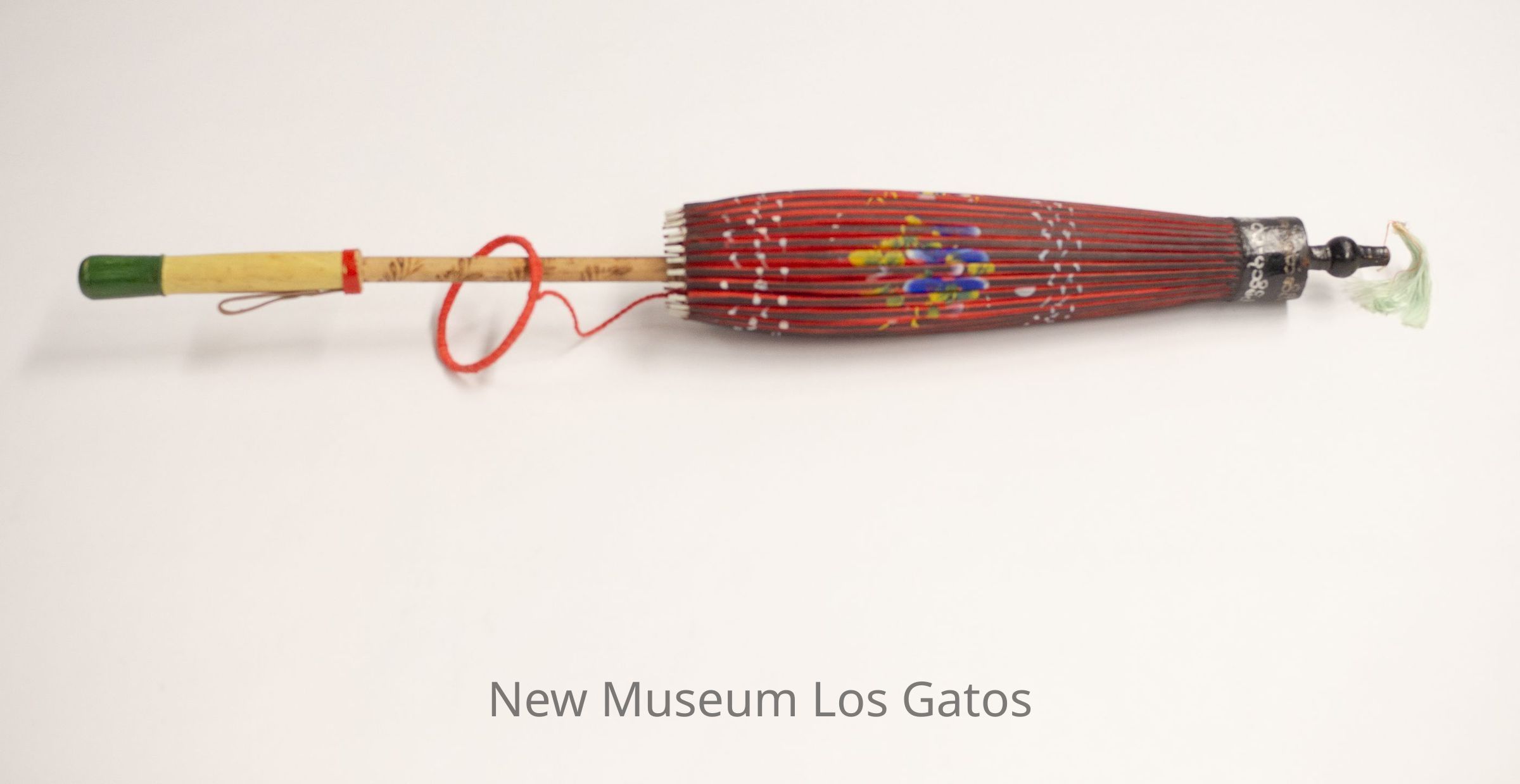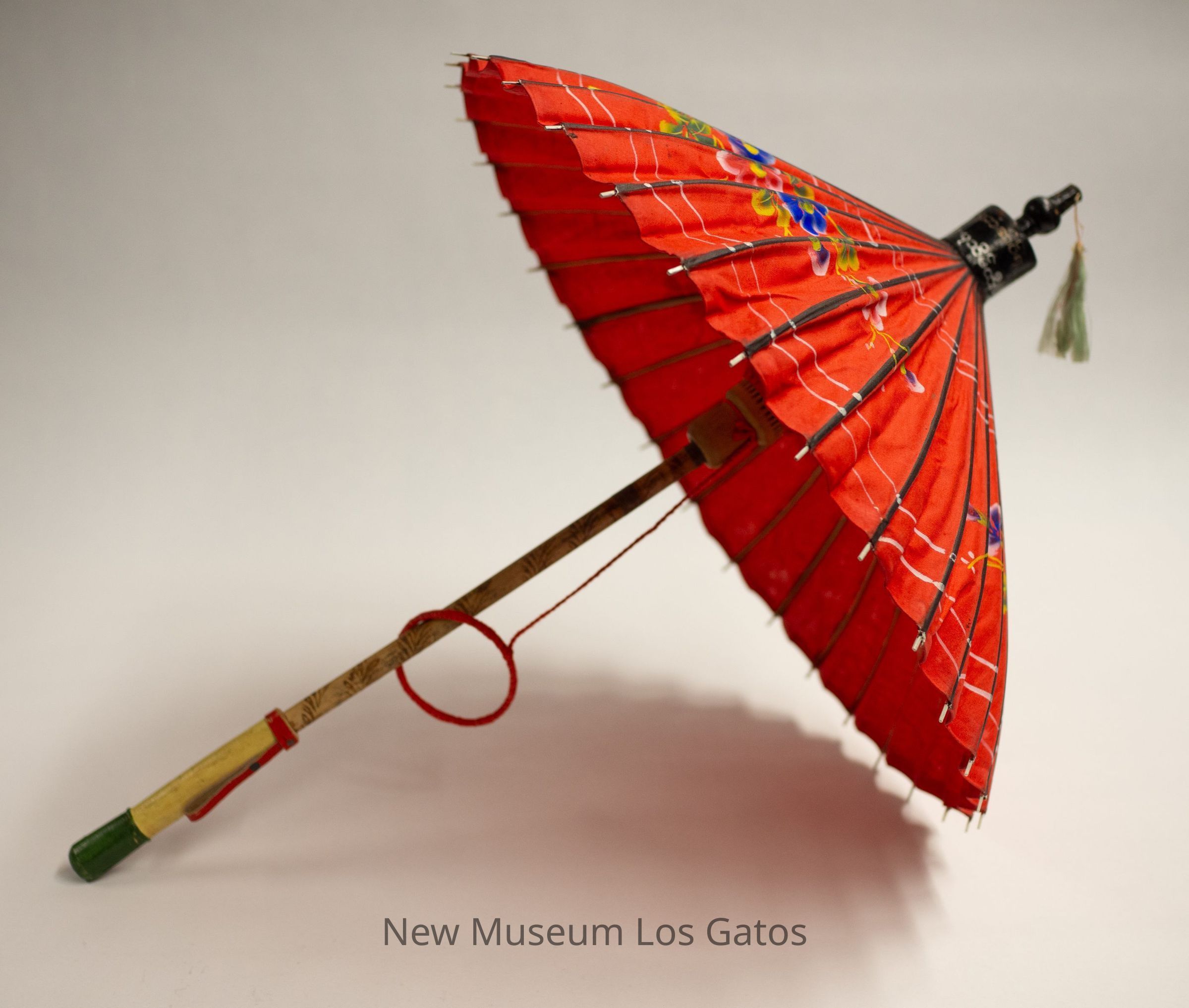 A small red parasol with colorful floral print throughout and white geometric patterns. The tip is black with a light green tassel at the end. The shaft is made from bamboo, with a floral print throughout. The handle is wood with a red and green strip at the ends. There is a circular red pulling device connected with fabric to the shaft of the umbrella.Collection