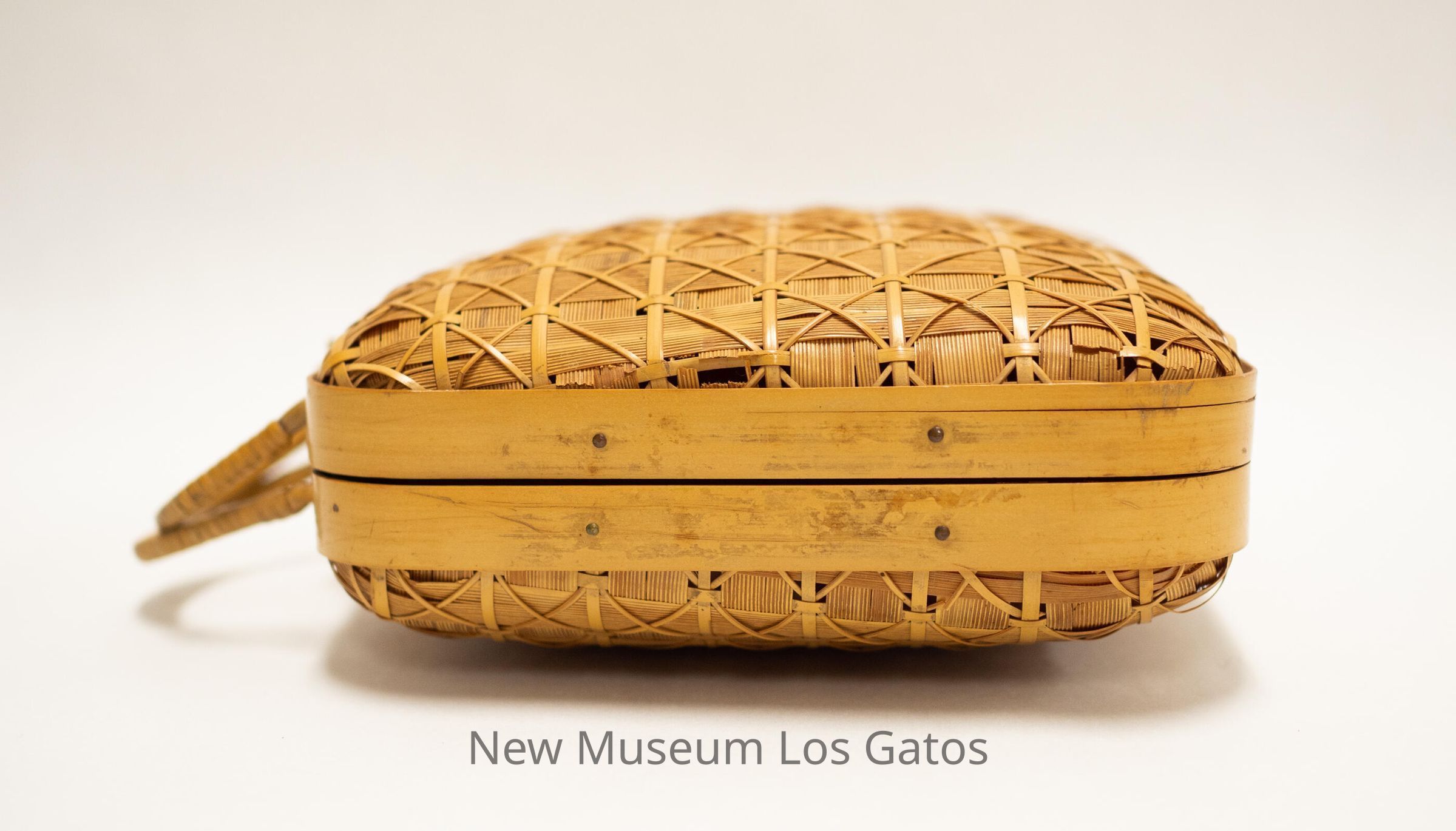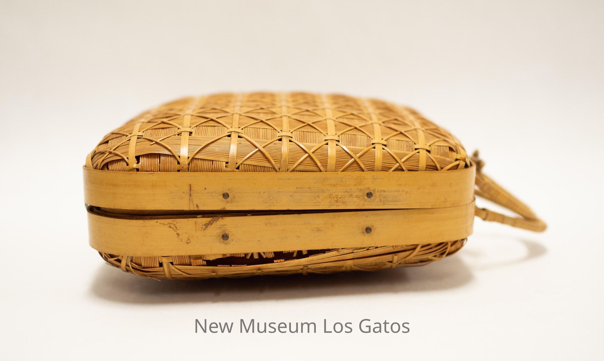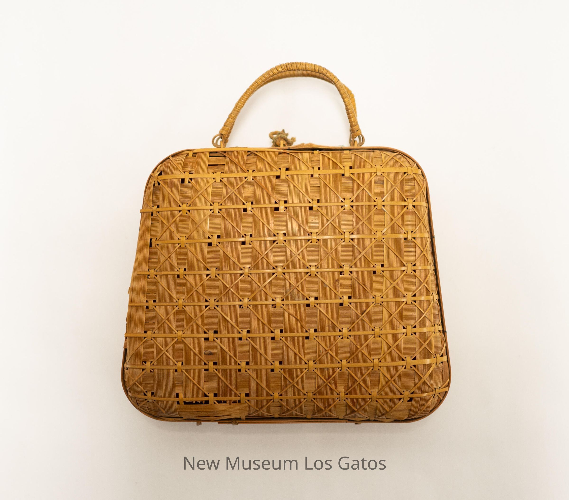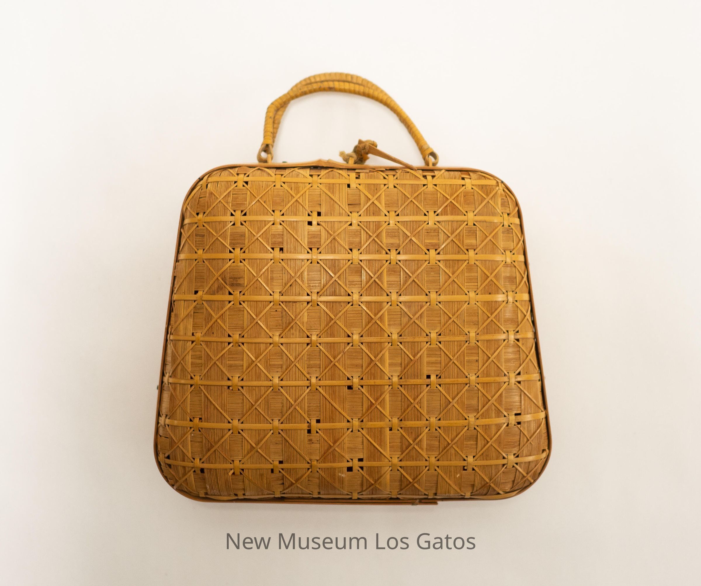 A small, square, light brown/tan reed handbag, with two handles at the top. The handbag has an intricate, diamond-shaped pattern throughout, with thicker, solid reeds forming the edge of each side. There is also a loop and string attached to a small wooden pick on the top of the handbag, which serves as a locking mechanism.Collection