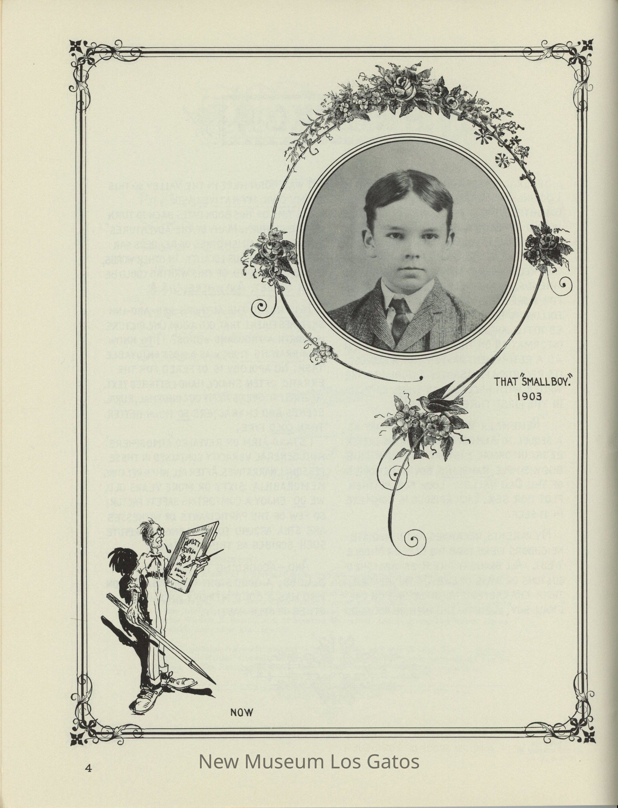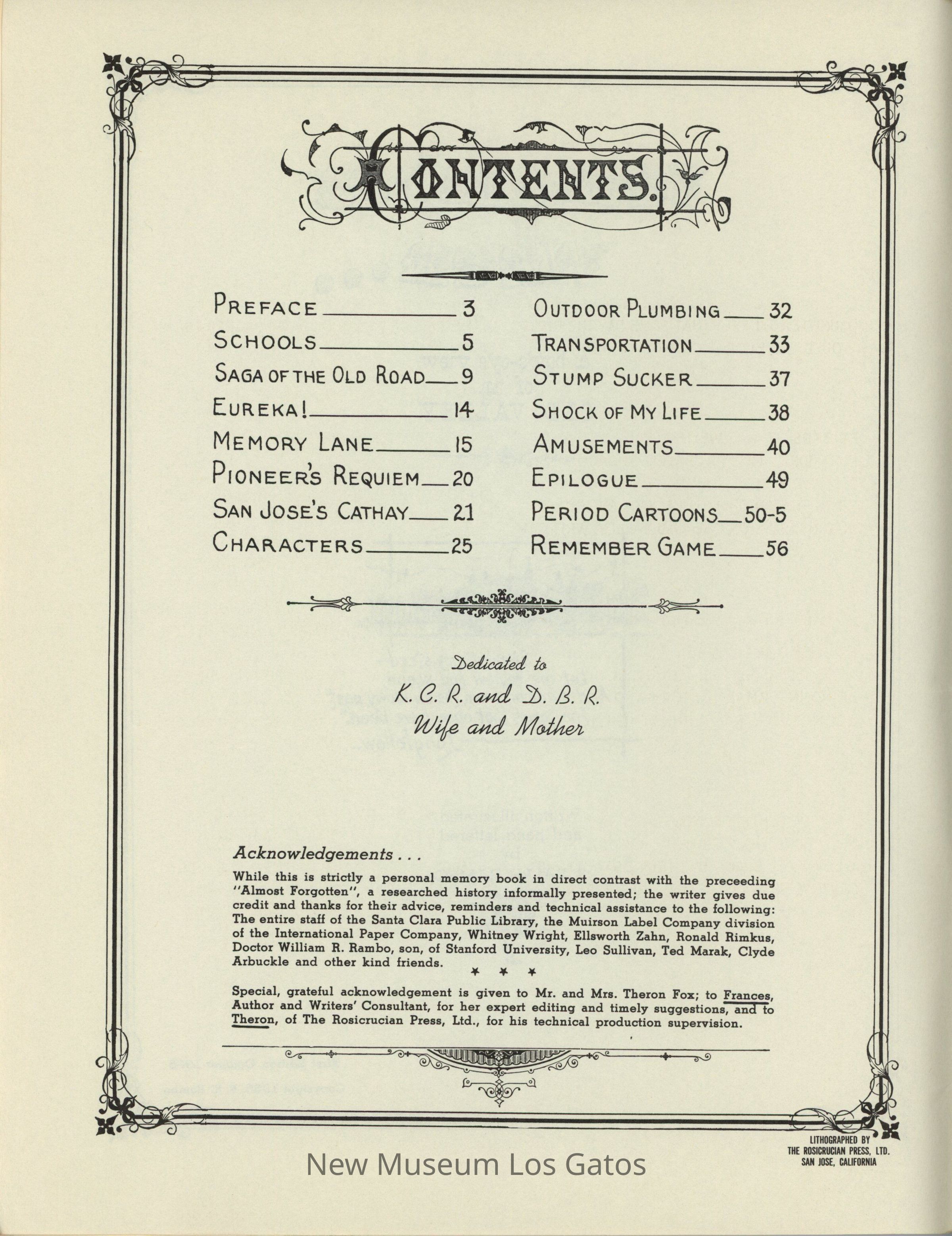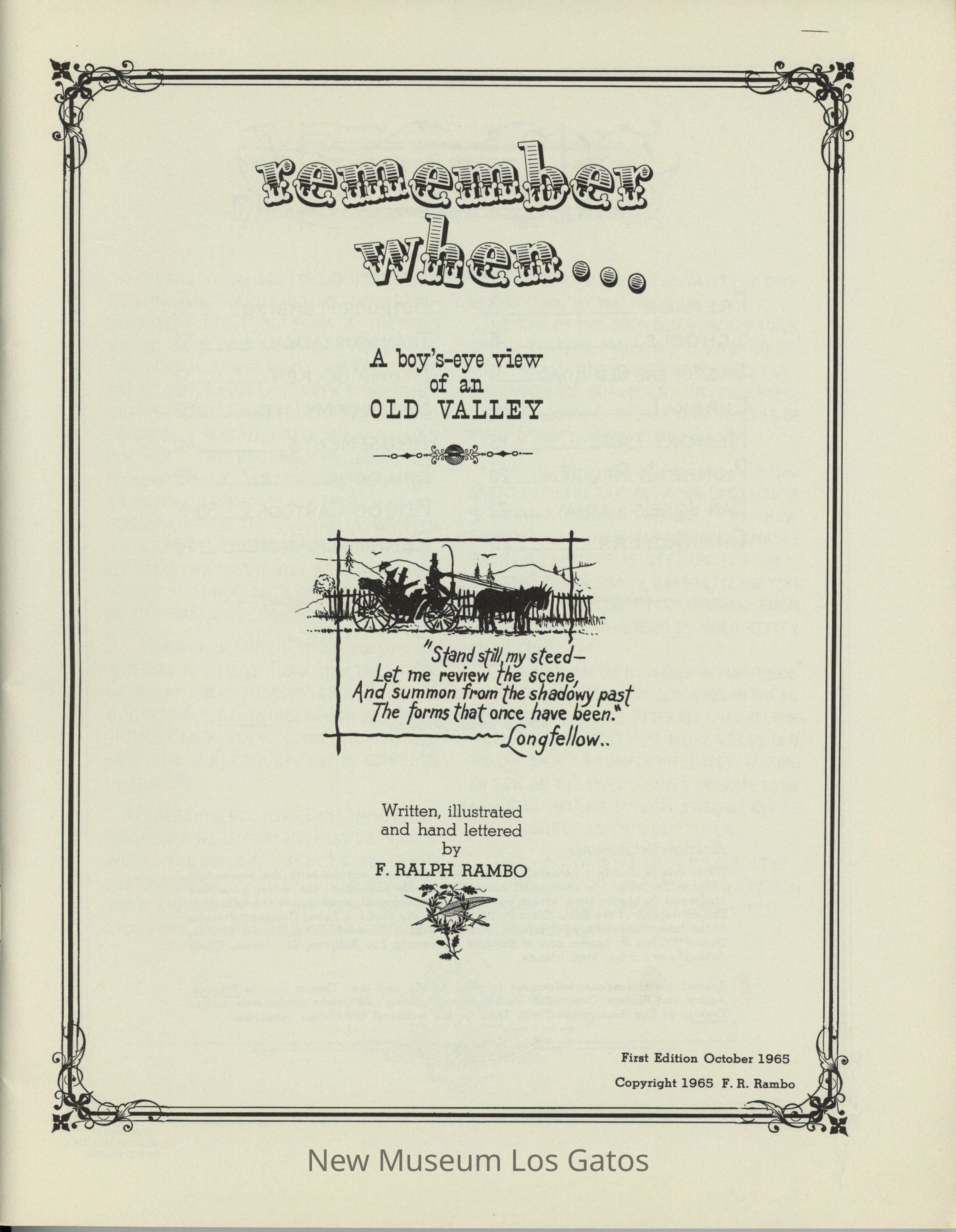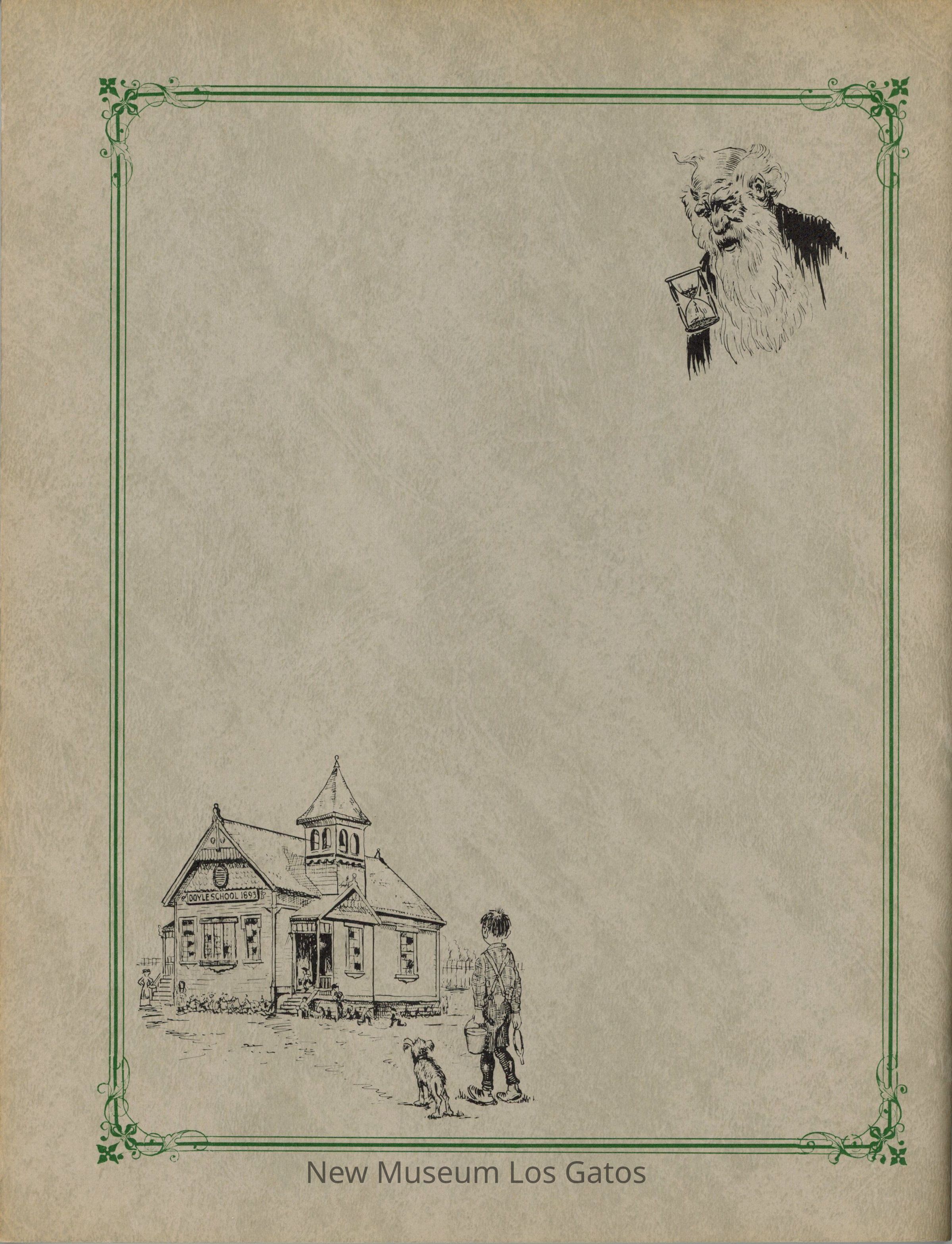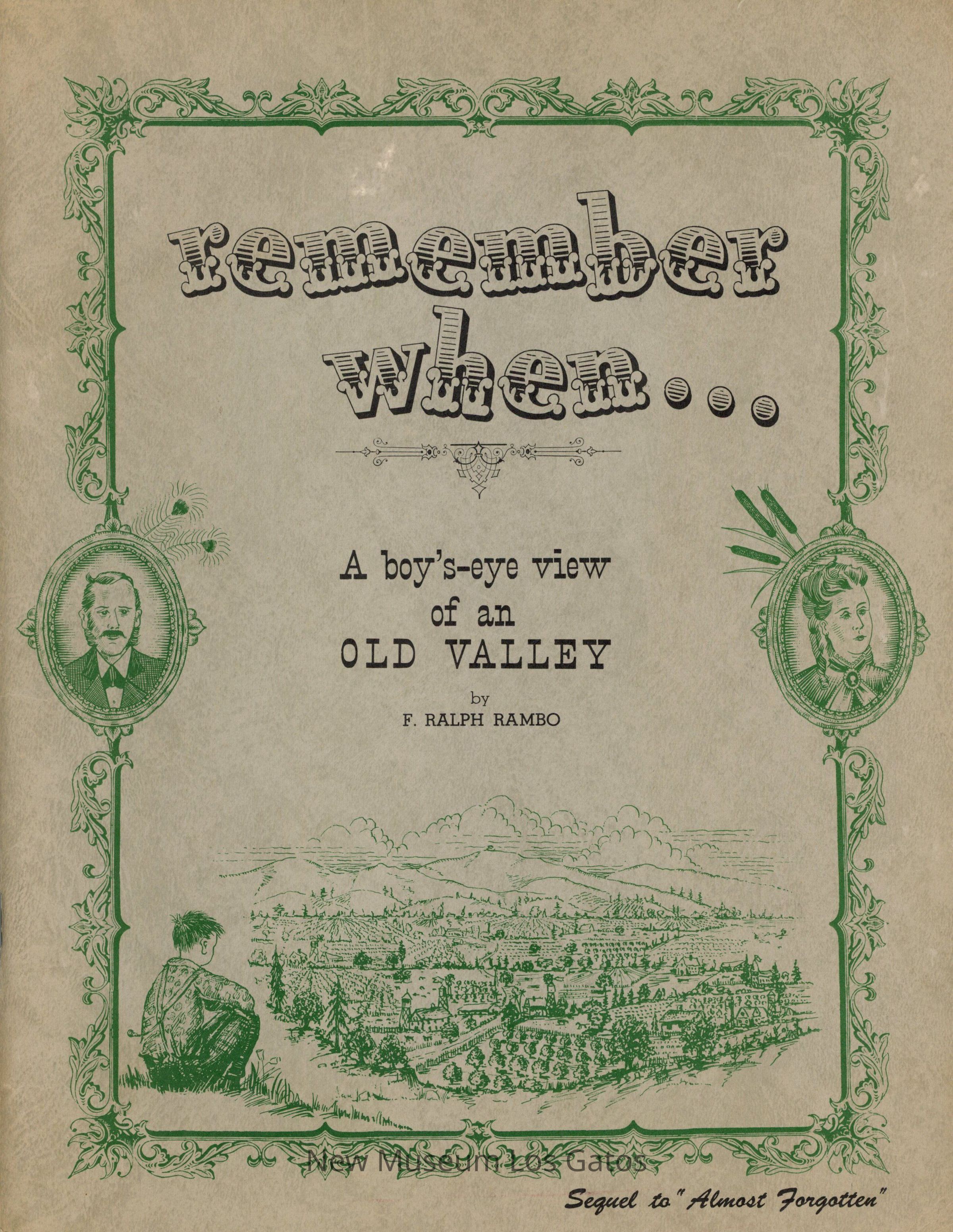A green-grey booklet with a dark green border, two cameos, and an illustration of a boy sitting at a hilltop, overlooking a valley and town. The text is in country-style font, in black. The back has two illustrations in black, within a dark green border. The book contains stories and cartoons about the Santa Clara Valley, during the author's childhood.Collection
