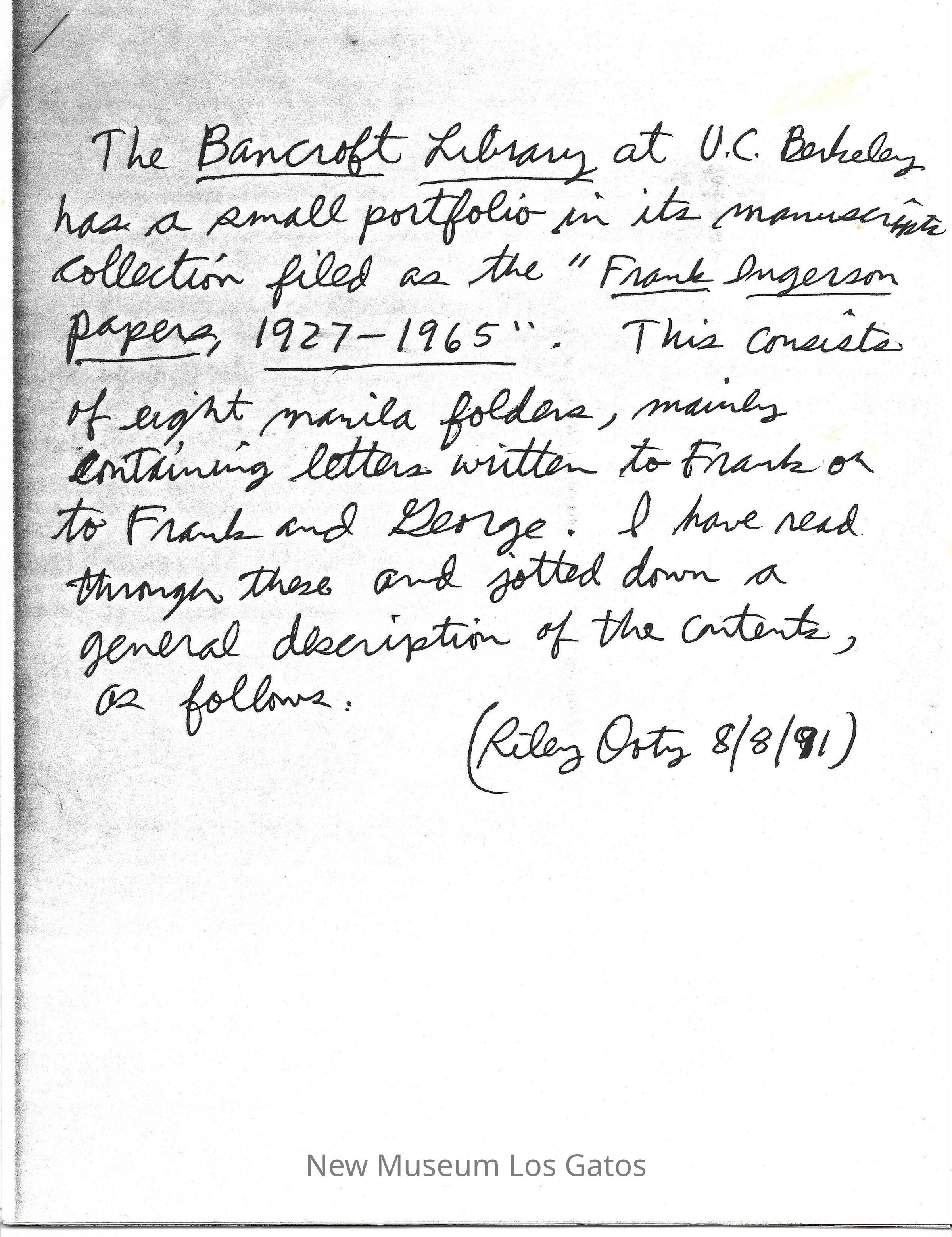 Eleven pages of handwritten notes summarizing the contents of the "Frank Ingerson Papers, 1927-1965" in the Bancroft Library at UC Berkeley.