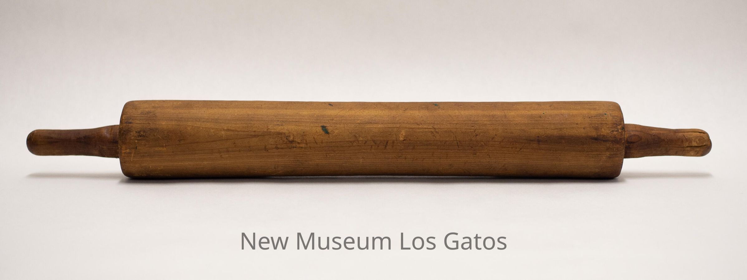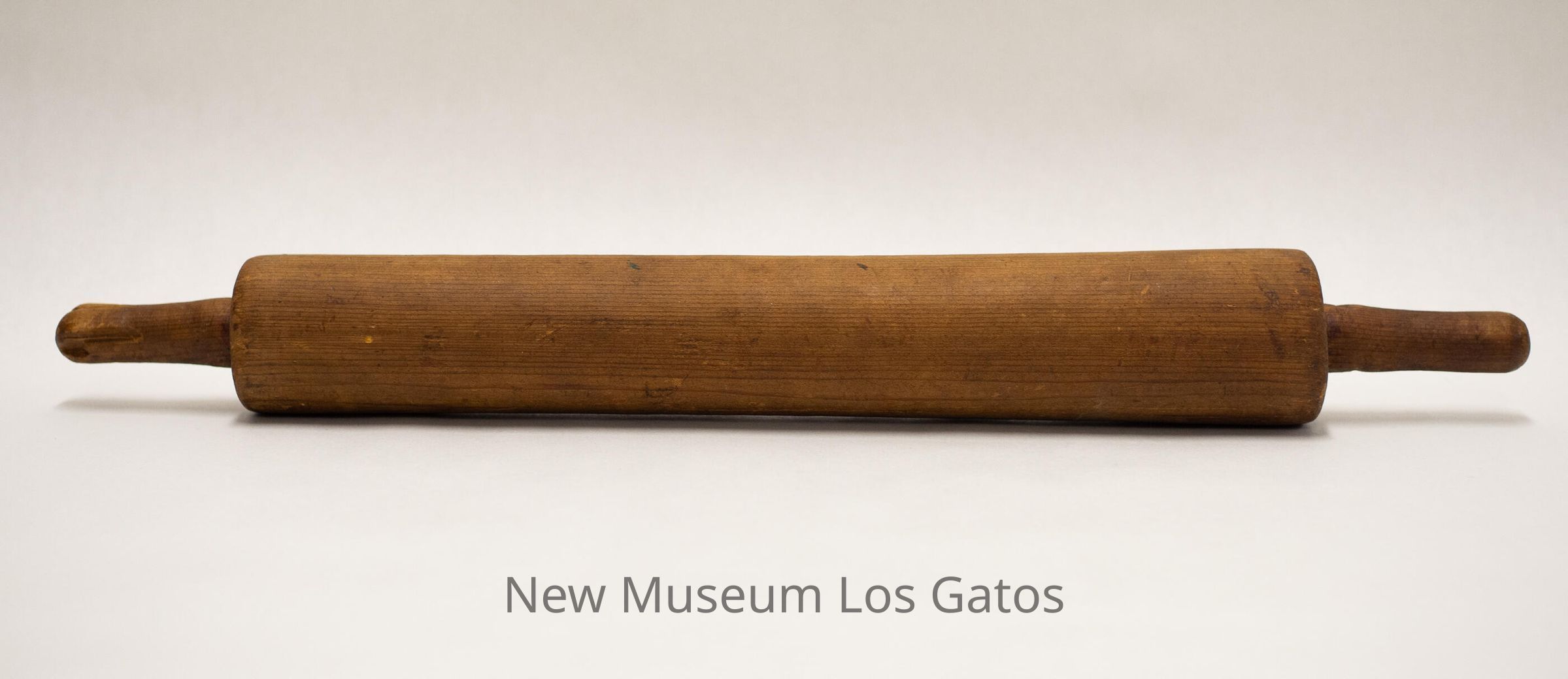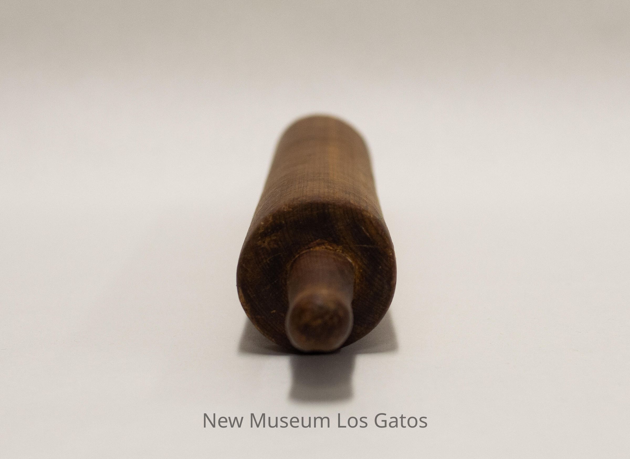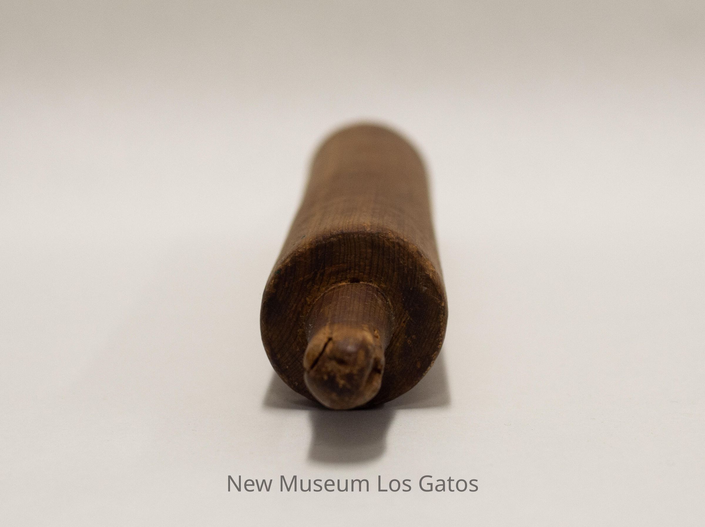 A wooden rolling pin, consisting of a long cylindrical piece of wood with two small cylindrical wooden handles attached to each end.Collection