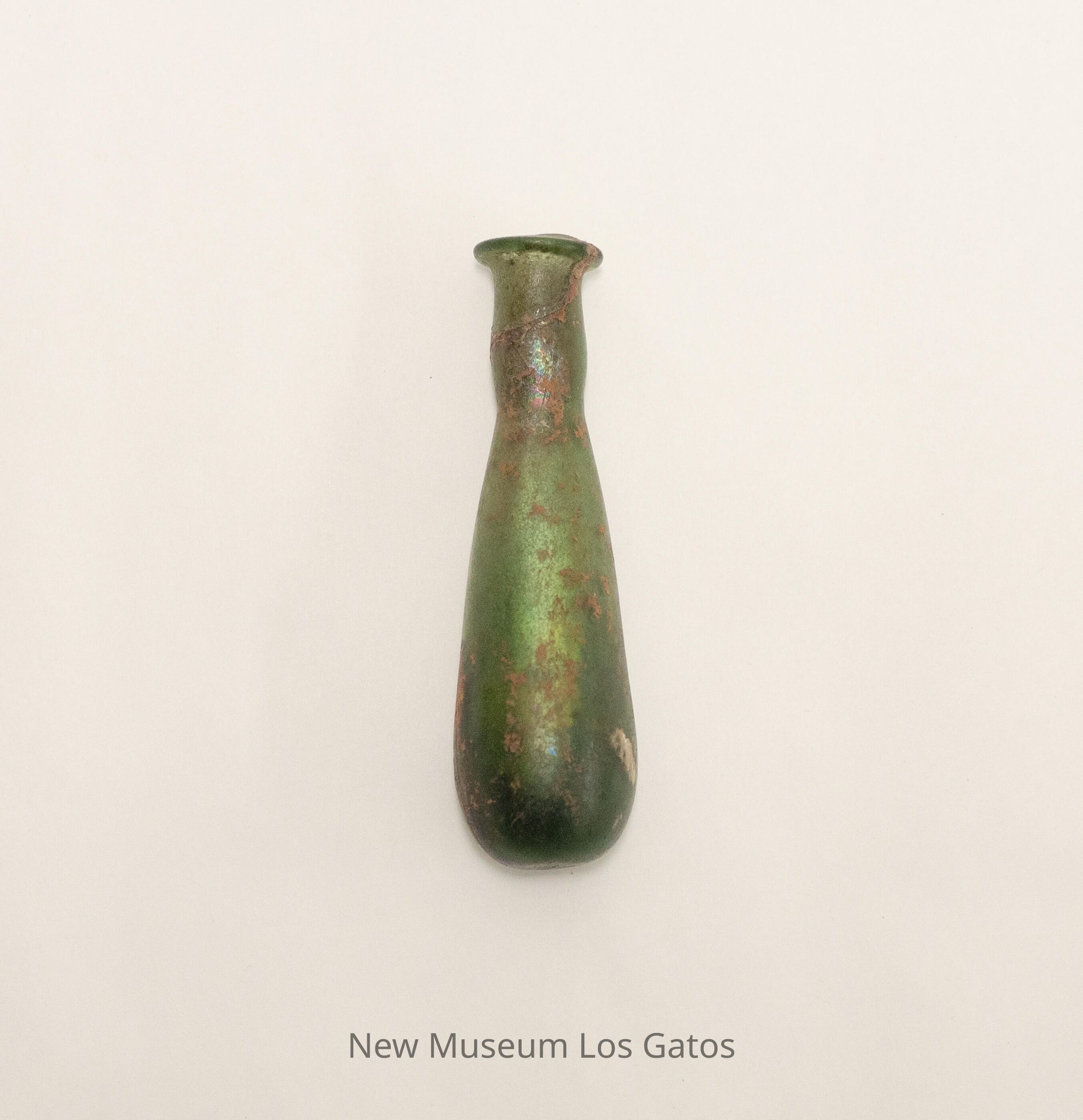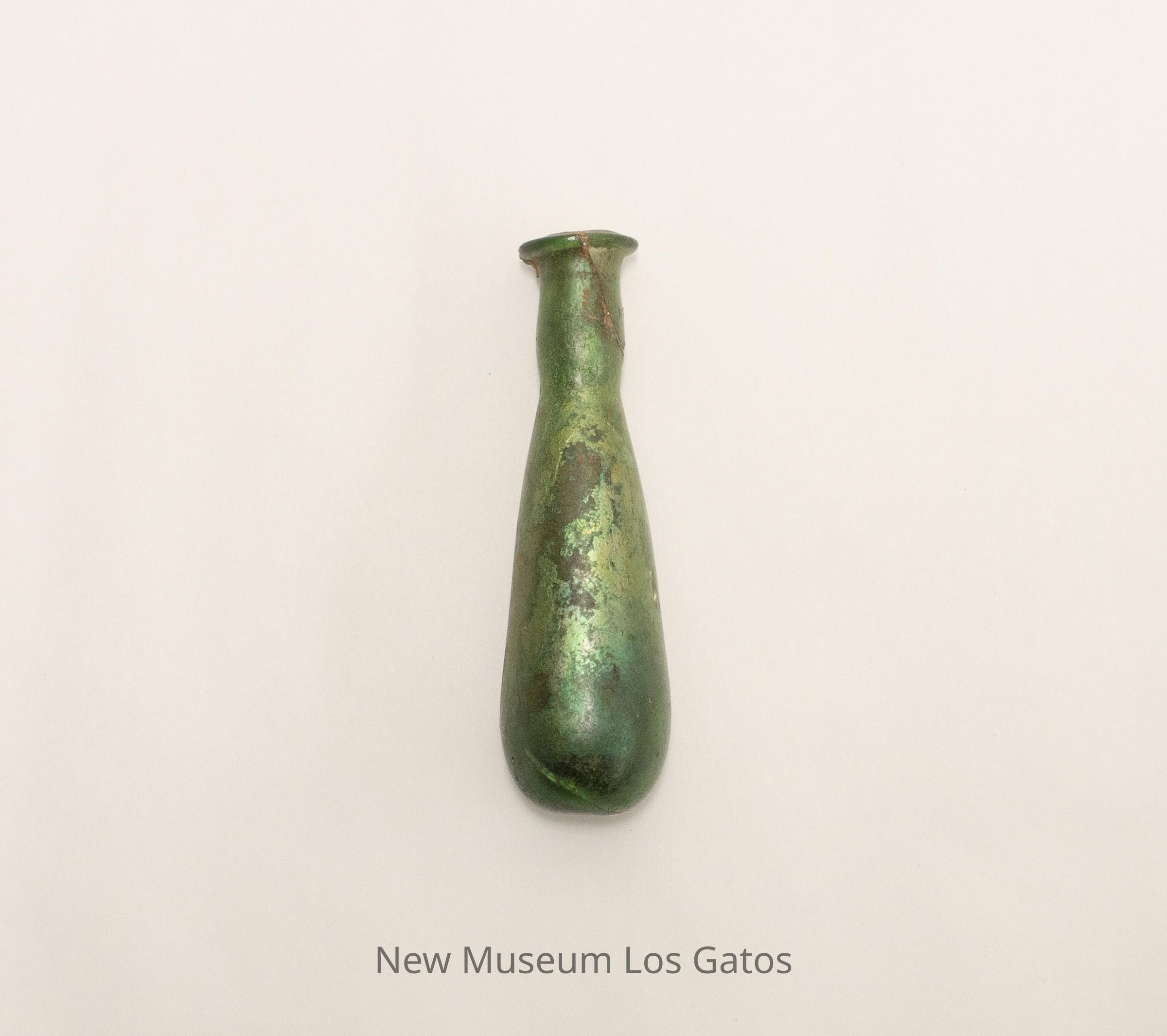 A small, green glass vase. The body of the vase is teardrop-shaped, and there is a short neck leading to a lip around the rim of the vase.Collection