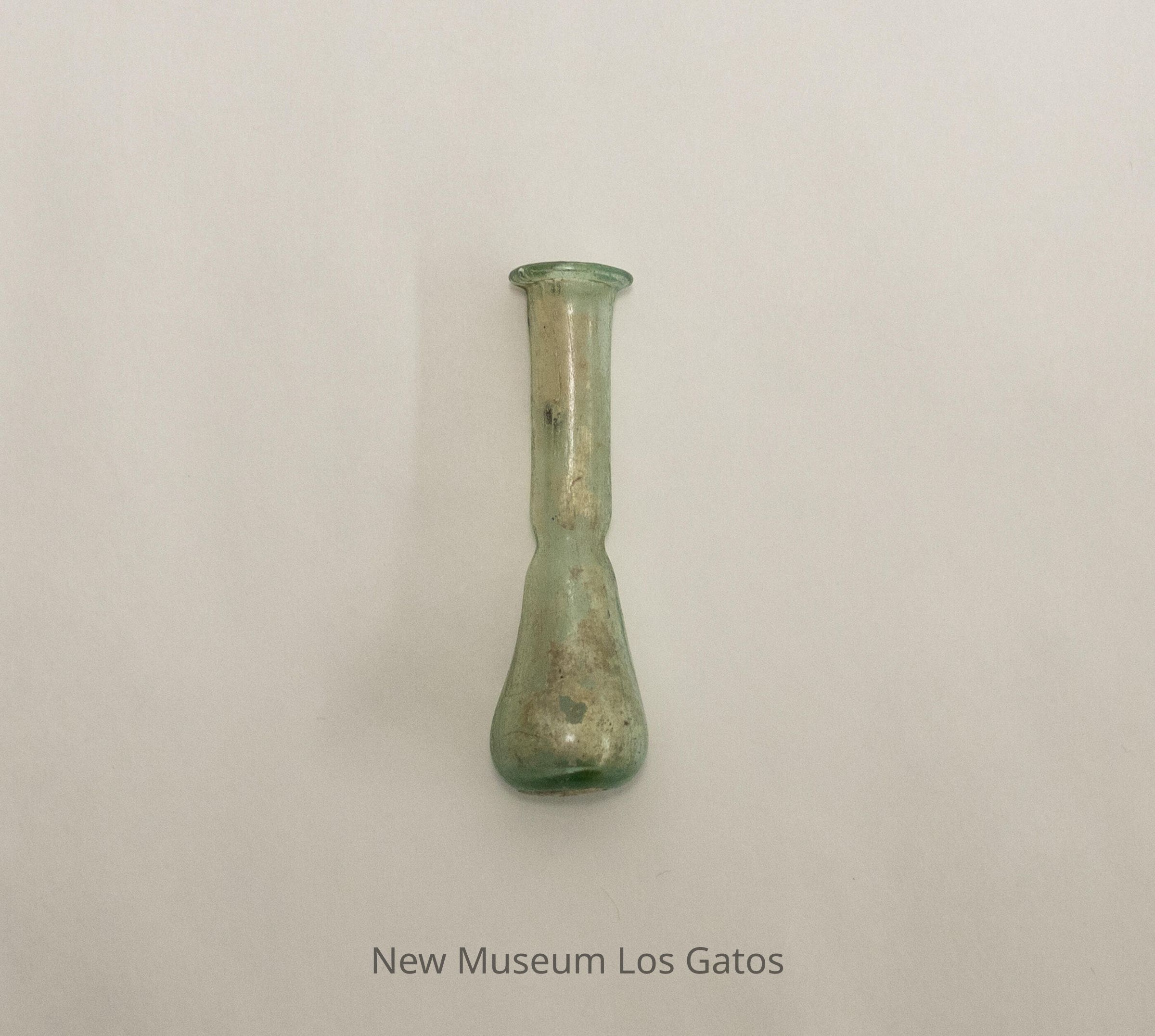 A small, light green glass vase. The base of the vase is flat, and body of the vase is slightly teardrop-shaped. There is a long neck leading to a lip around the rim of the vase. There is a faint, etched teardrop shape on the body of the vase, and a dip in the glass, where the body meets the neck.Collection
