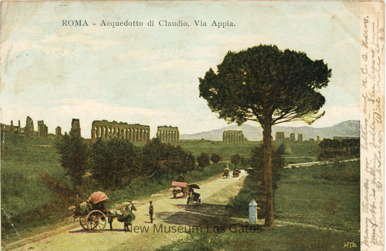 A postcard with a colorized illustration of the Aqua Claudia and the Appian Way in Rome. The postcard has been mailed, and includes an addressee, a stamp, and a message written in pen on the front of the postcard.Subject Place