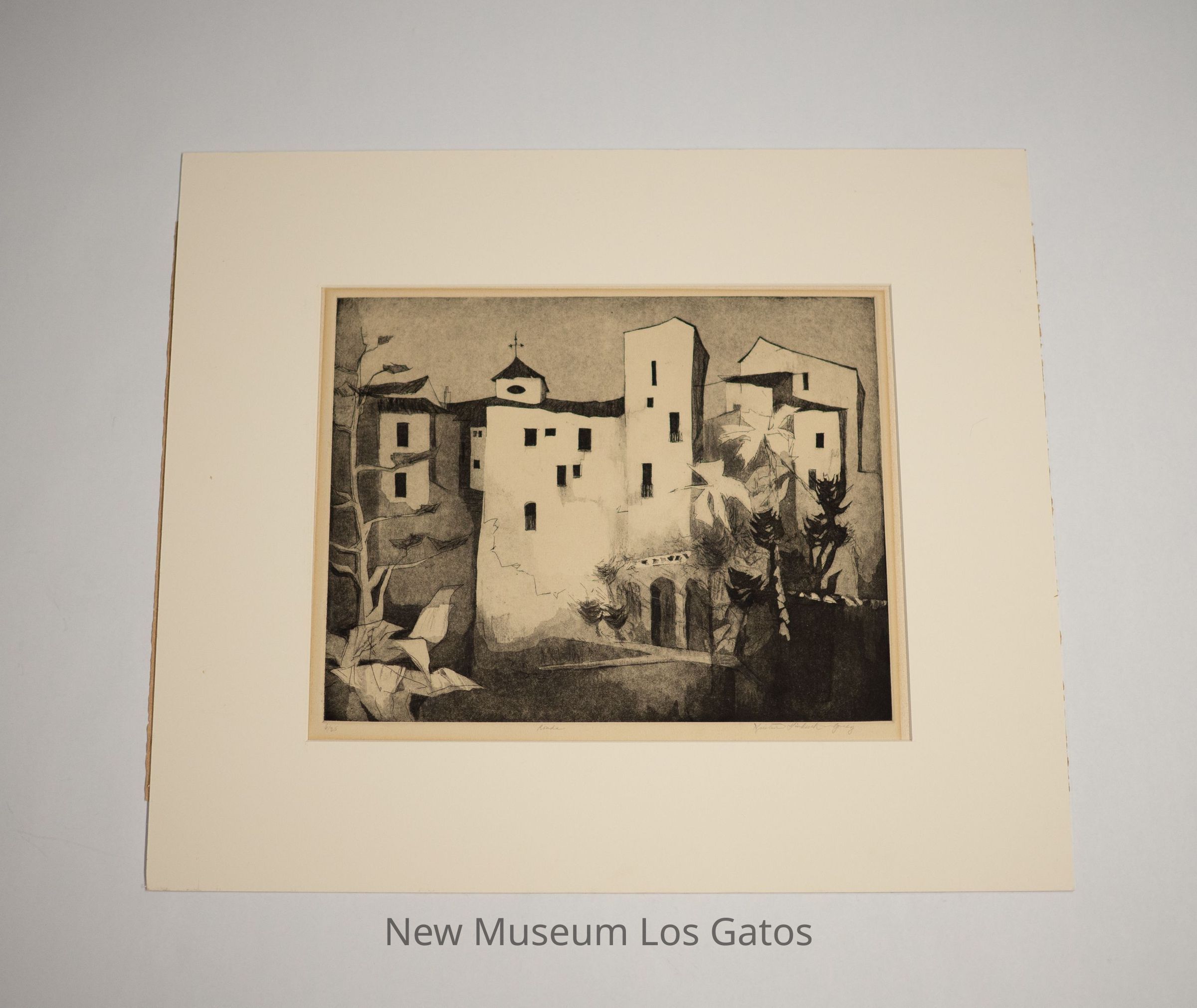 A matted etching and aquatint print featuring an urban scene. There are numerous tall Spanish-style buildings, with arched walkways at the bottom of the central building, and trees to the left and right of the image.