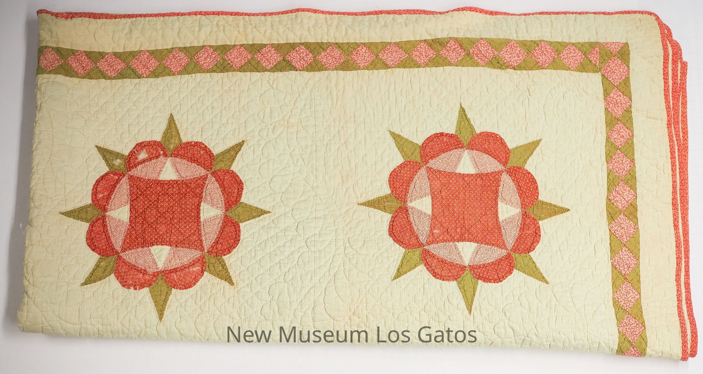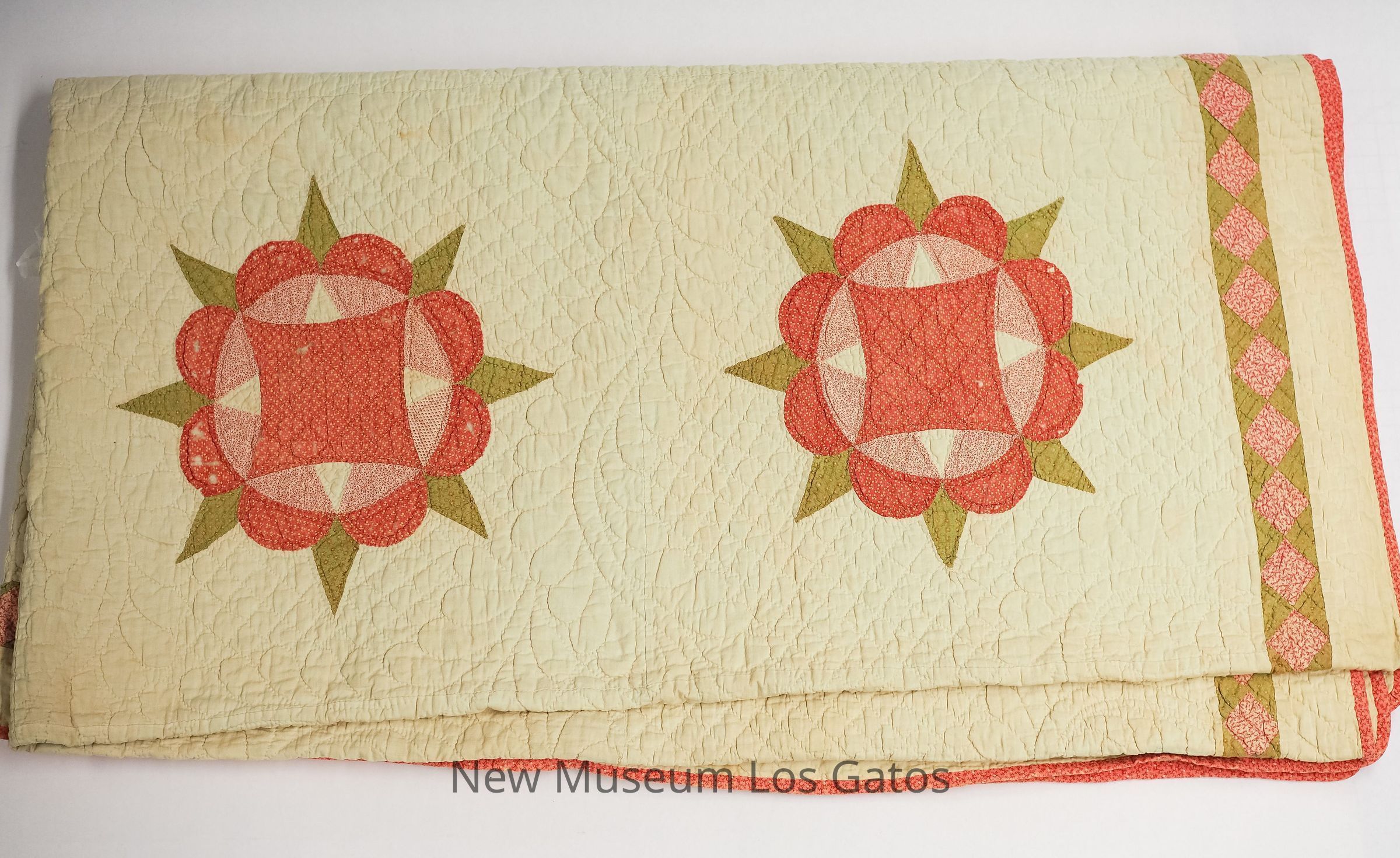 A quilt with large patchwork designs that resemble roses, on a white background. The quilt has a red border.Collection