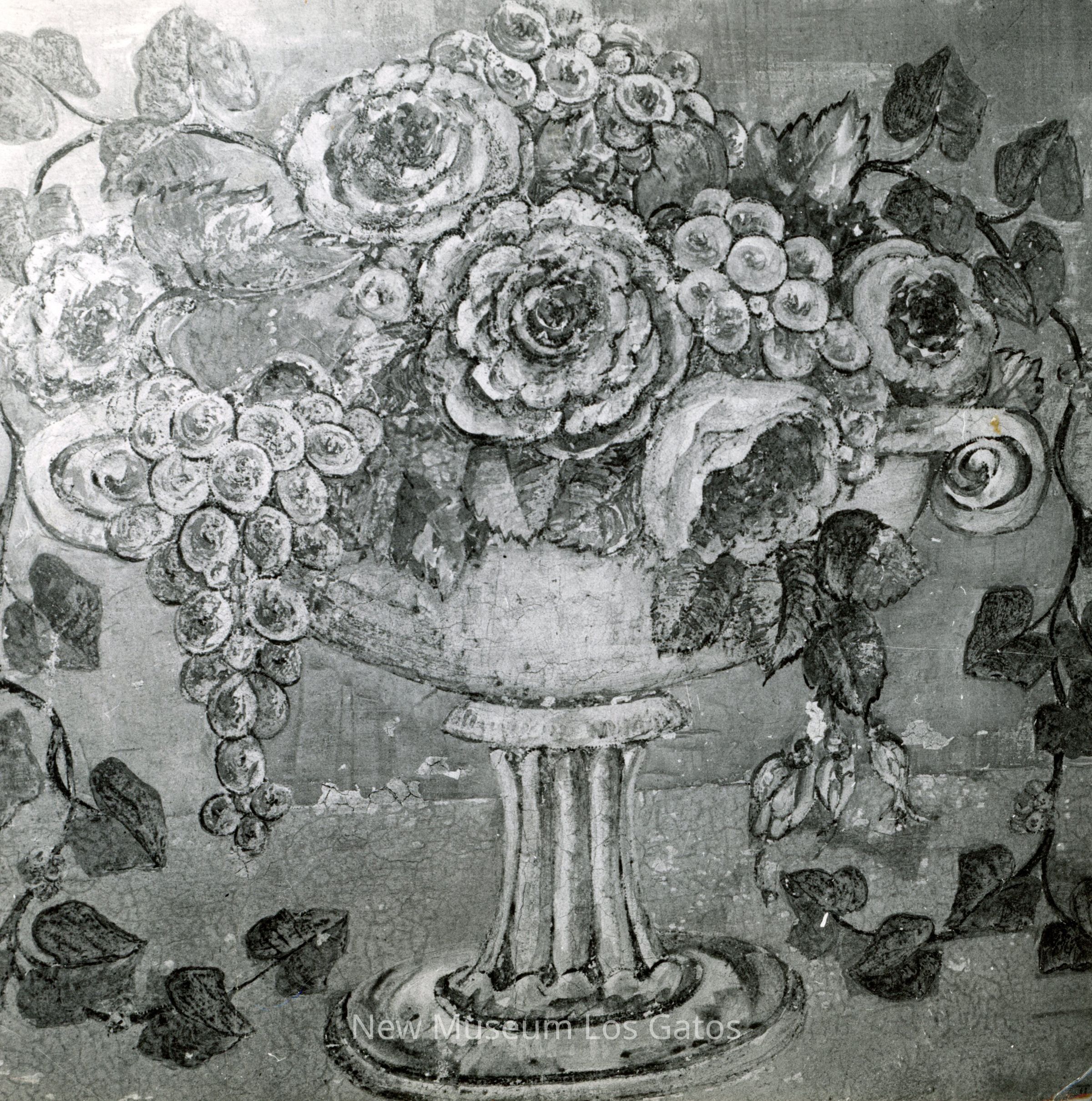 Black and white photo of a fresco by Frank Ingerson and George Dennison. The fresco depicts a bundle of roses and grapes in a goblet.
