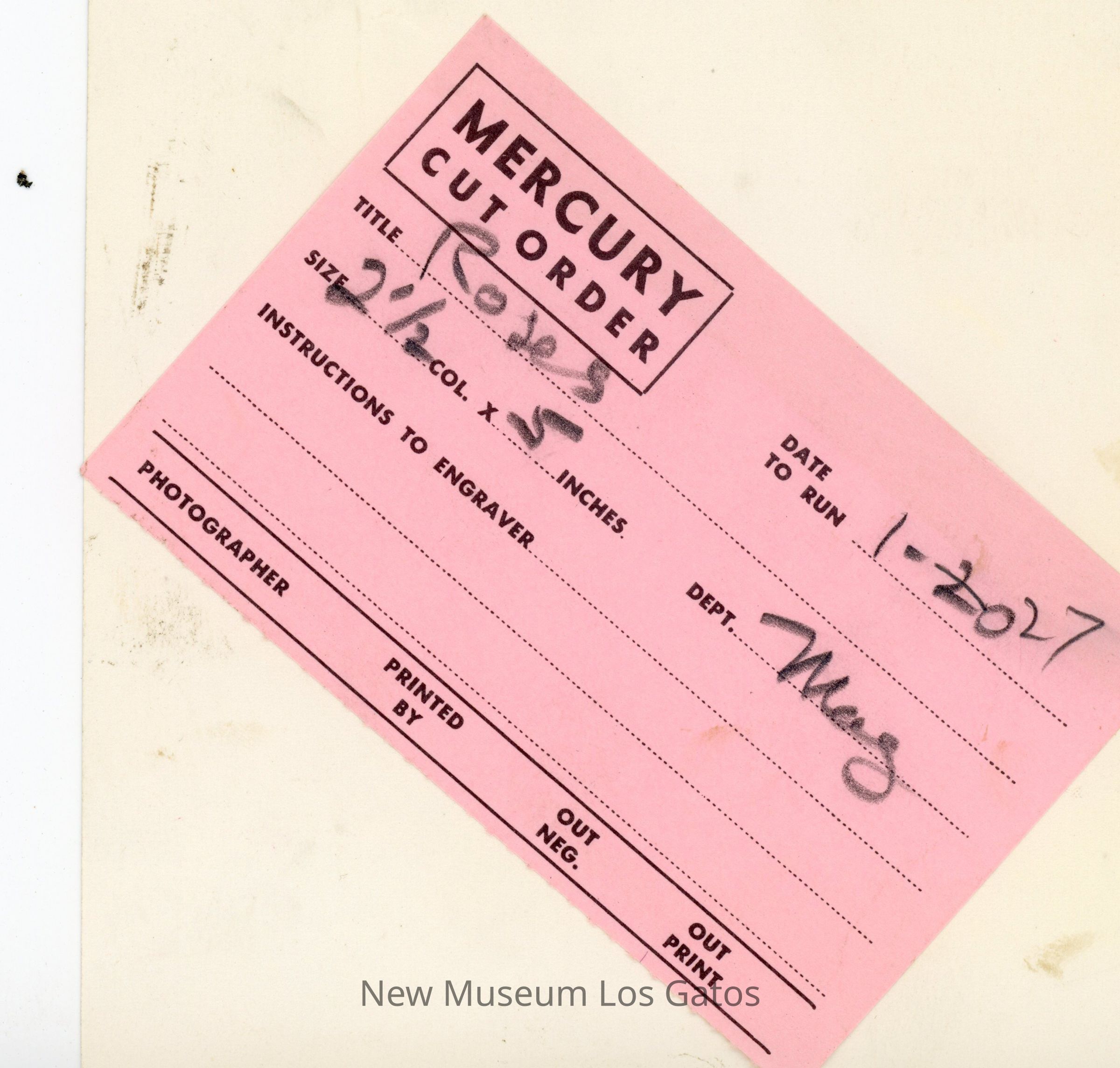 MERCURY CUT ORDER DATE TO RUN 1-27 TITLE Roses SIZE 2 1/2 COL. x 5 INCHES DEPT. Mag INSTRUCTIONS TO ENGRAVER