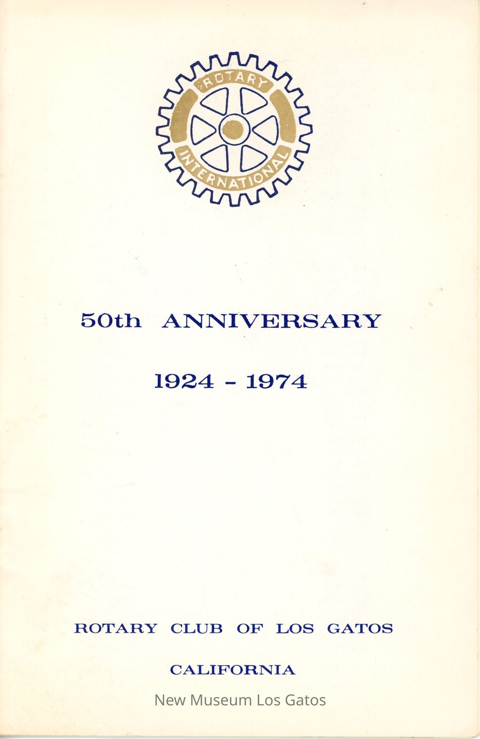 A white program with blue and gold lettering, for the Golden Anniversary celebration for the Rotary Club of Los Gatos. The booklet contains a brief program, a story about the formation of the club, as well as a roster of current members.Collection