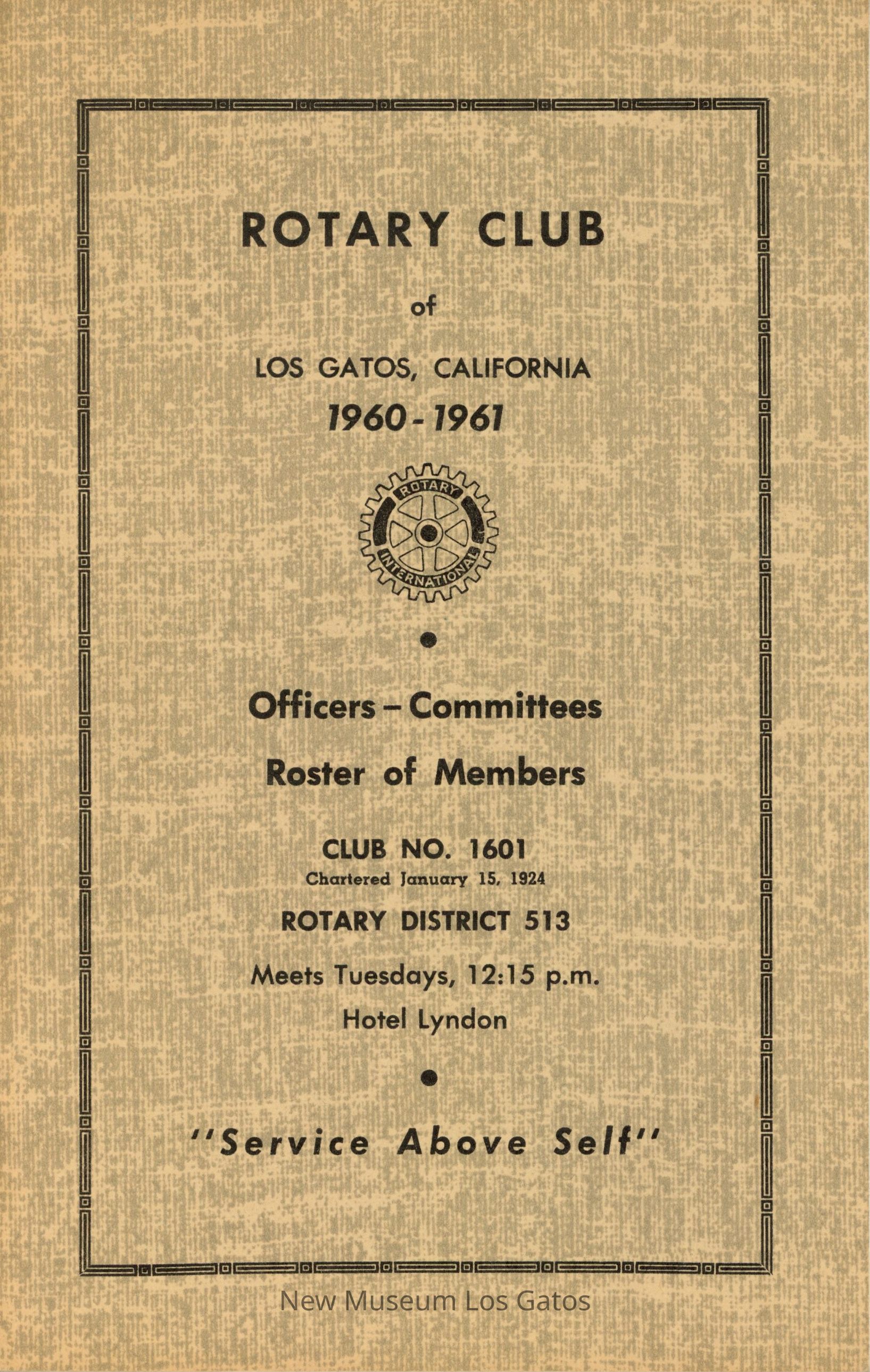 A mottled brown and tan pamphlet, detailing the officers, committee members, and at-large members of the Rotary Club of Los Gatos for 1960-1961.Collection
