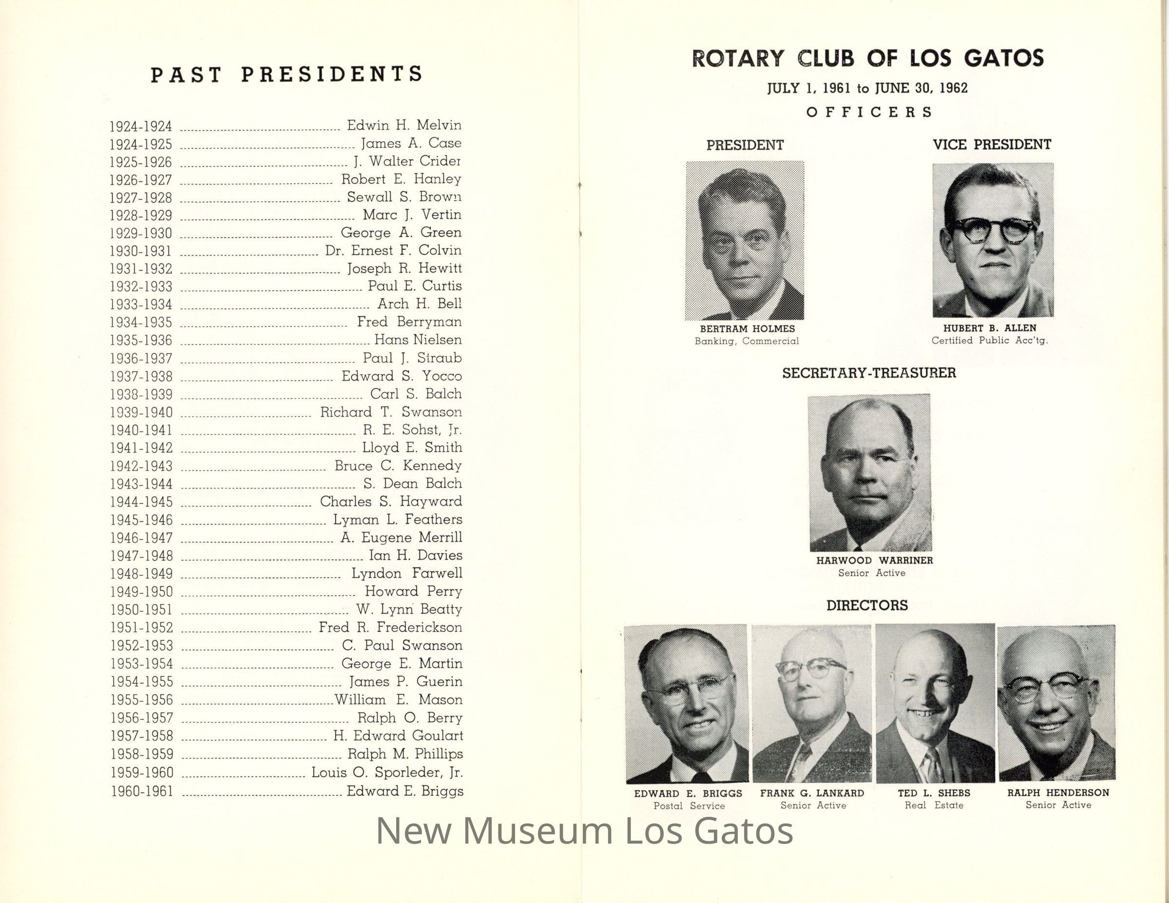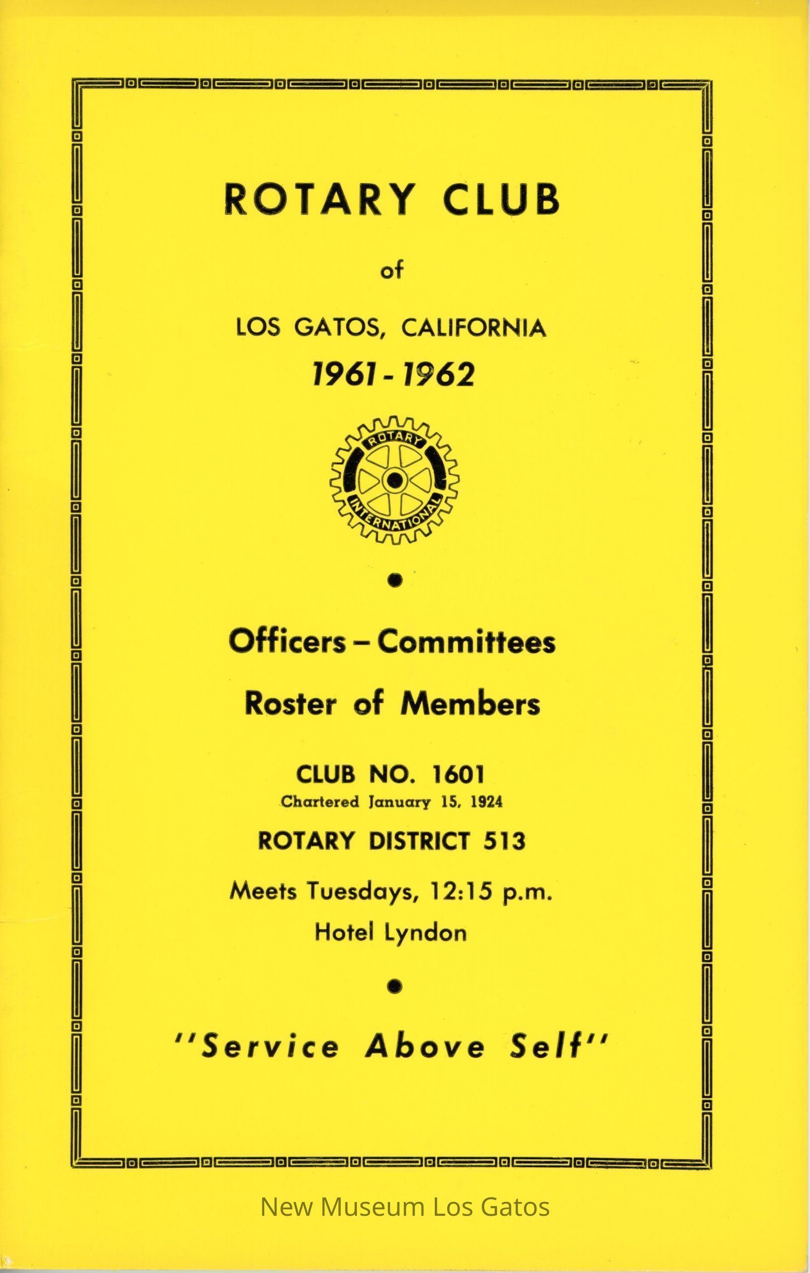 A yellow booklet, detailing the officers, committee members, and at-large members of the Rotary Club of Los Gatos for 1961-1962.Collection