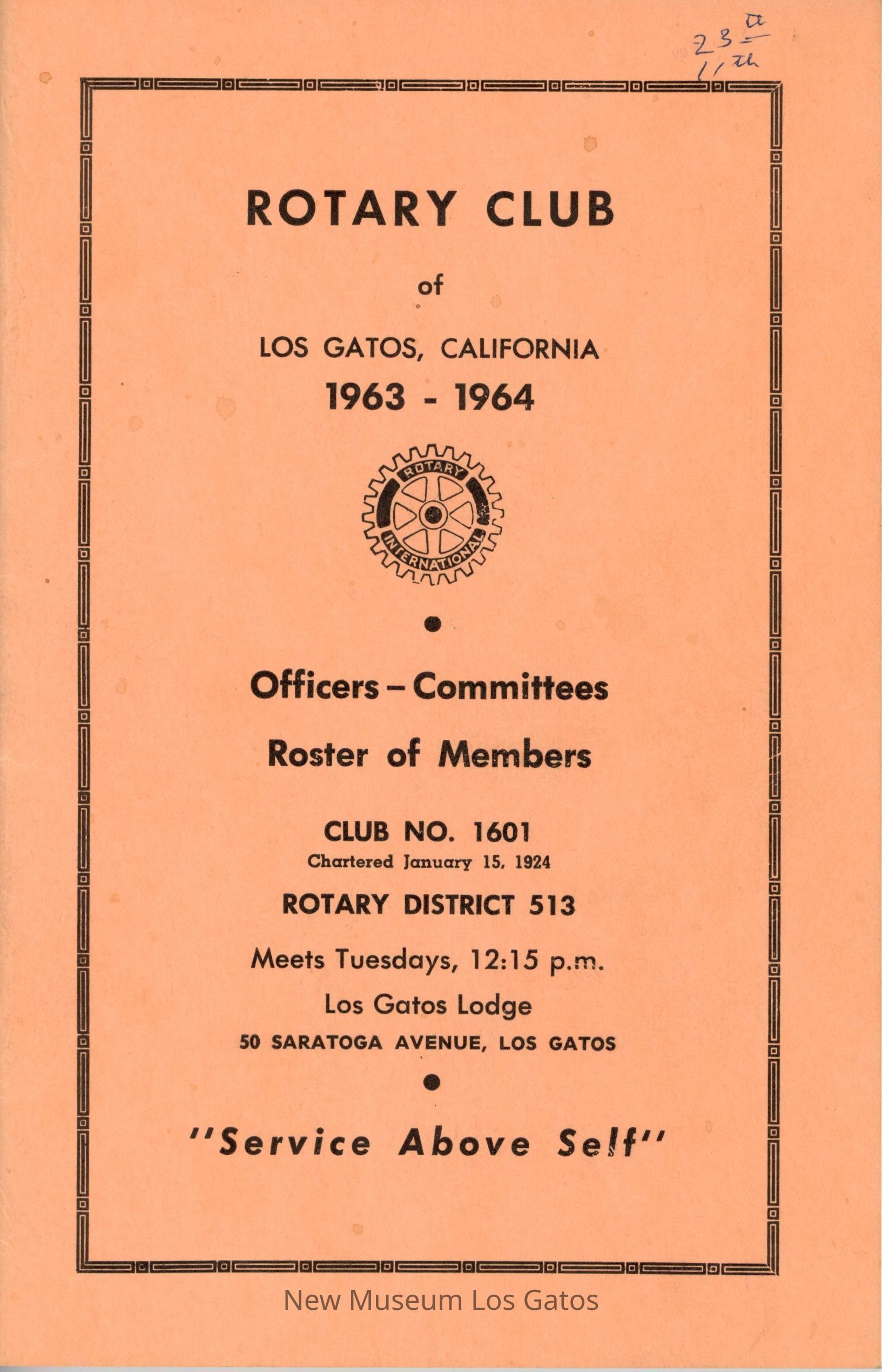 A peach/pink booklet, detailing the officers, committee members, and at-large members of the Rotary Club of Los Gatos for 1963-1964.Collection