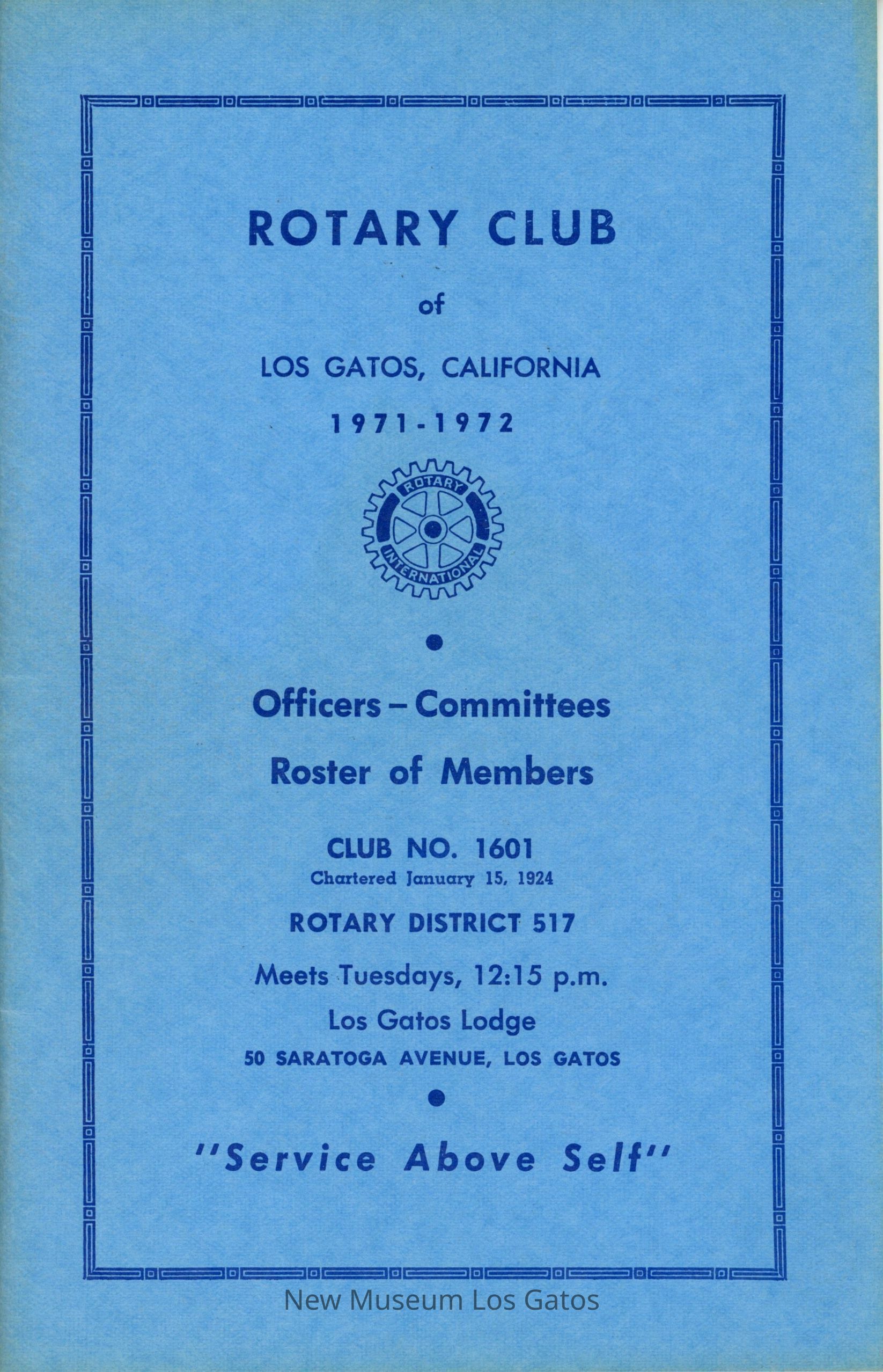 A blue booklet, detailing the officers, committee members, and at-large members of the Rotary Club of Los Gatos for 1971-1972.Collection