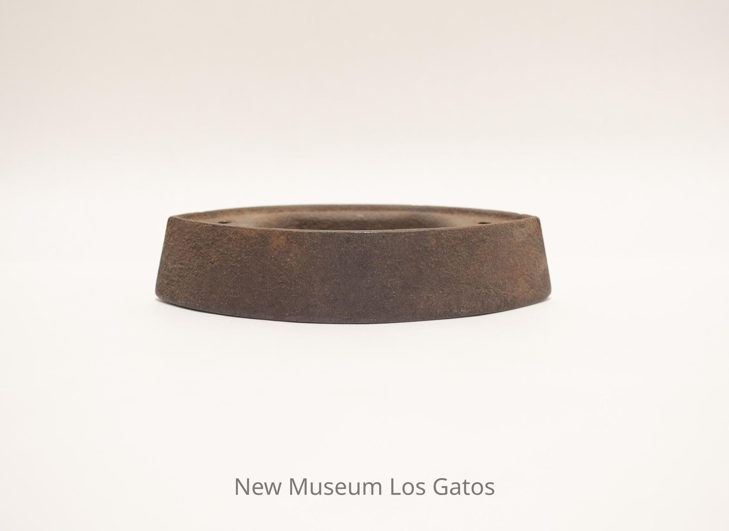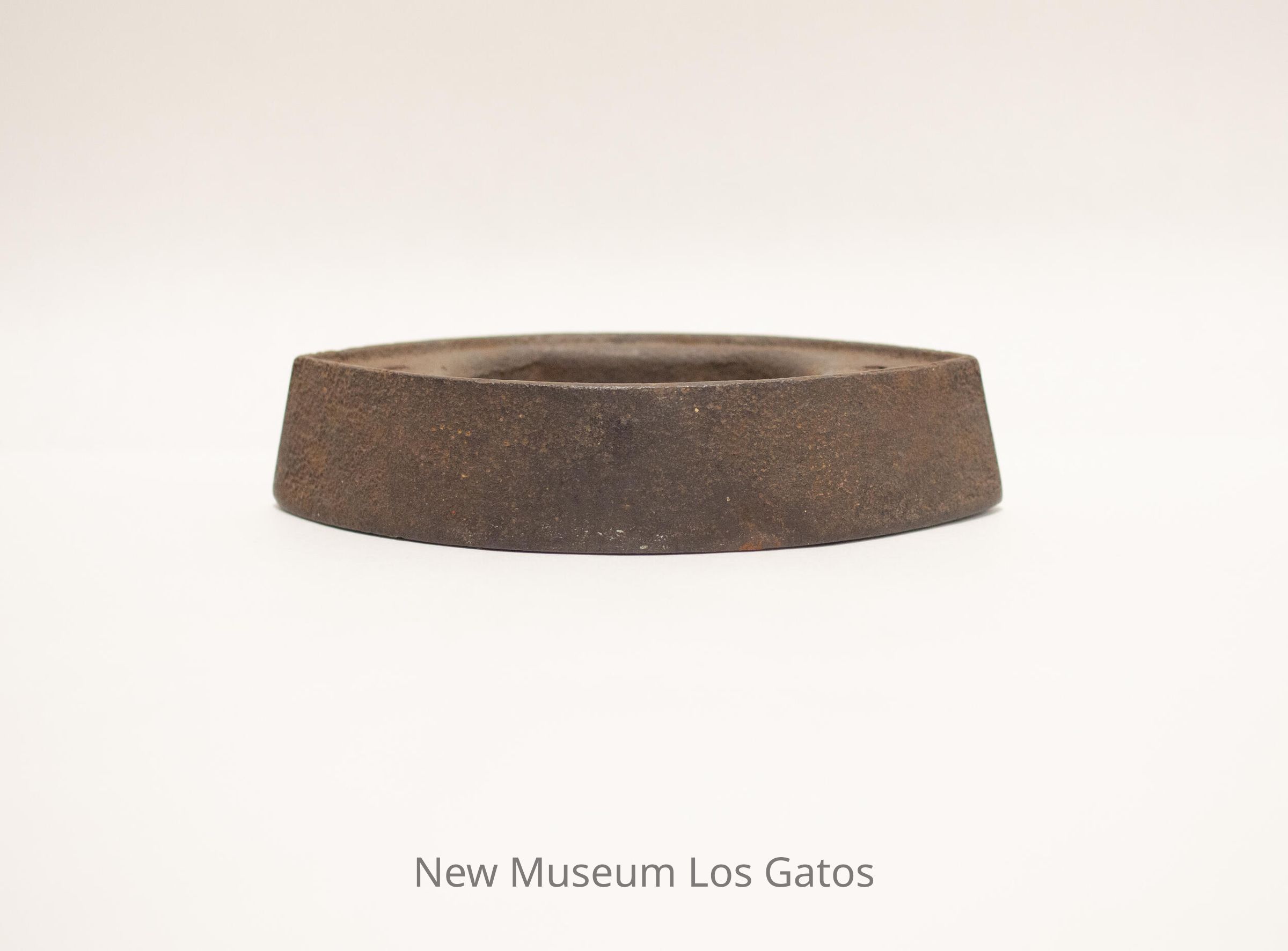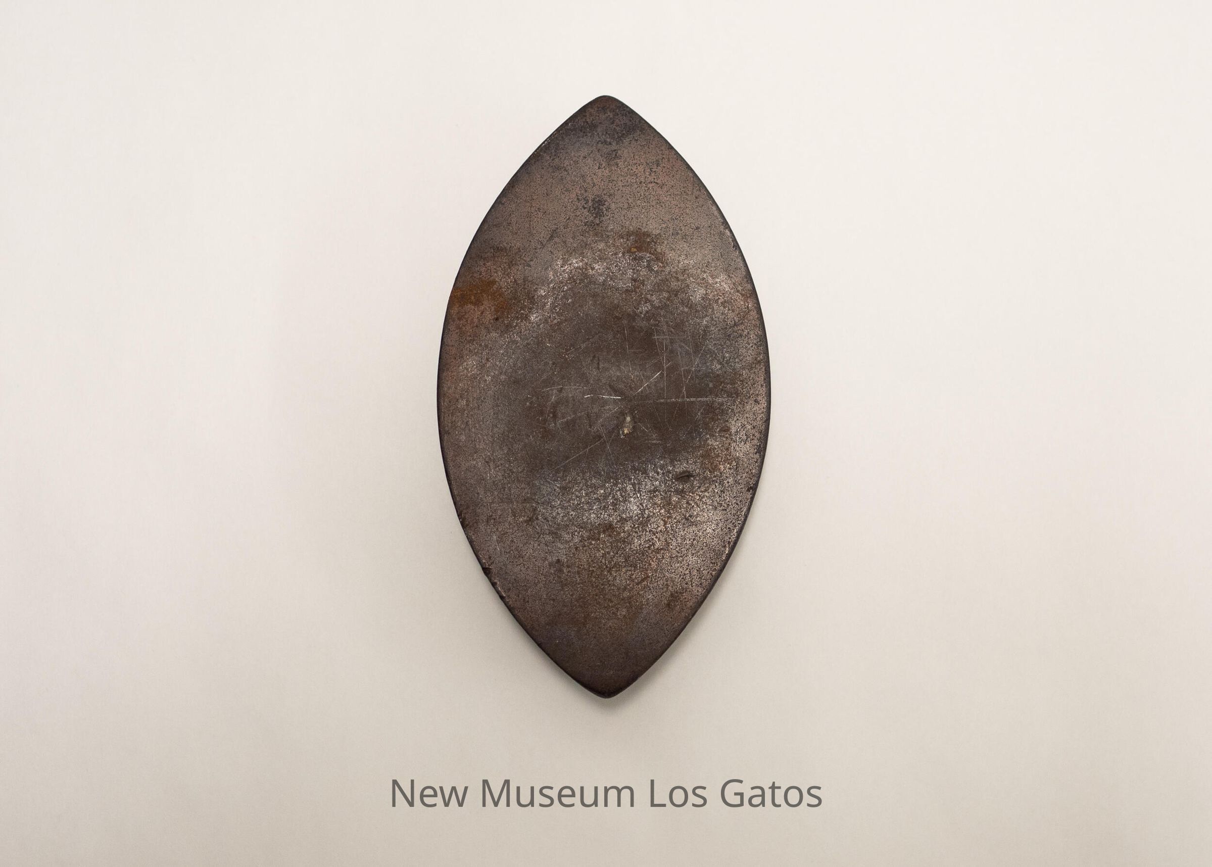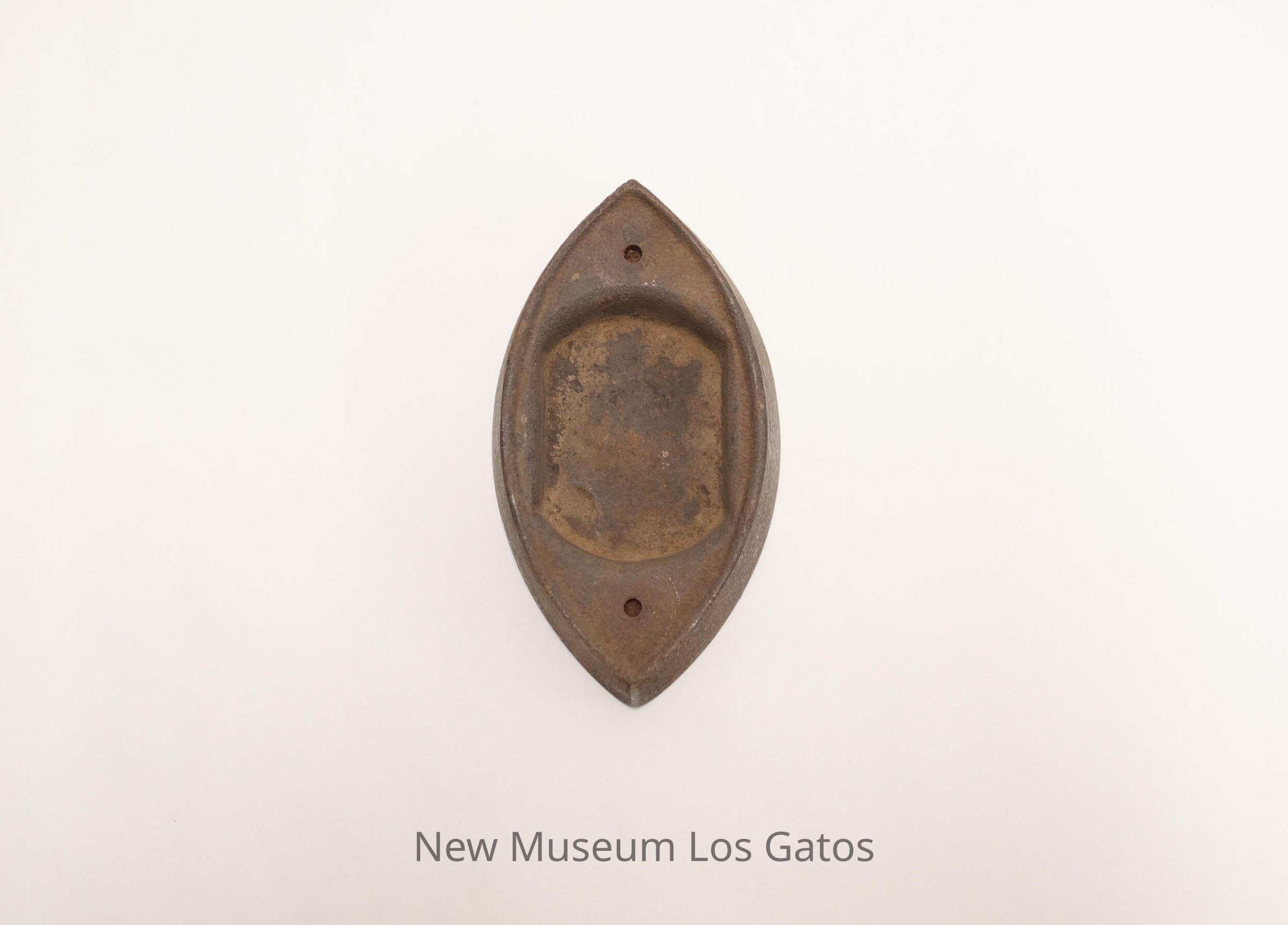 Metal iron, with an oval cavity in the center and two small holes at each end, where the handle would attach.