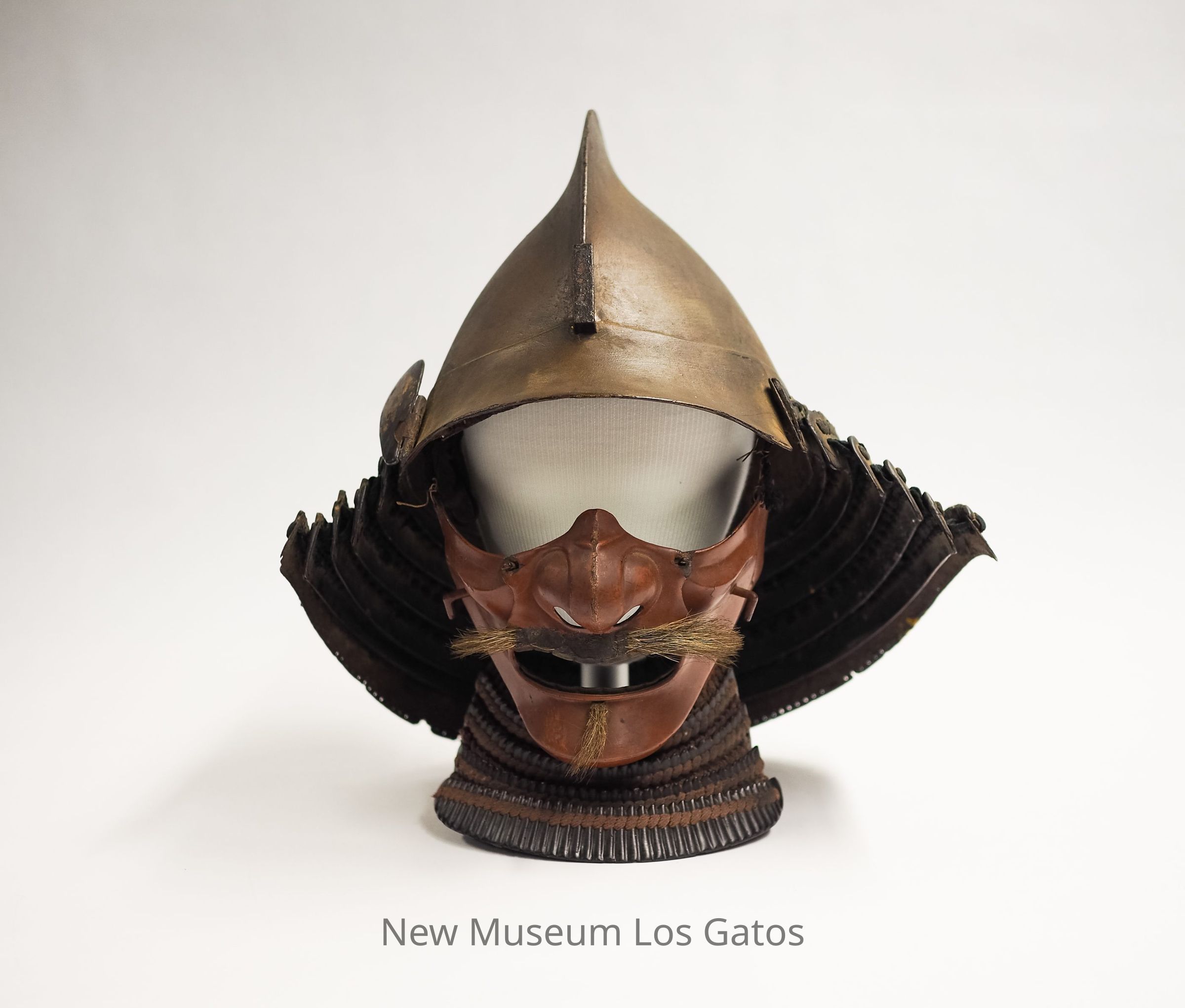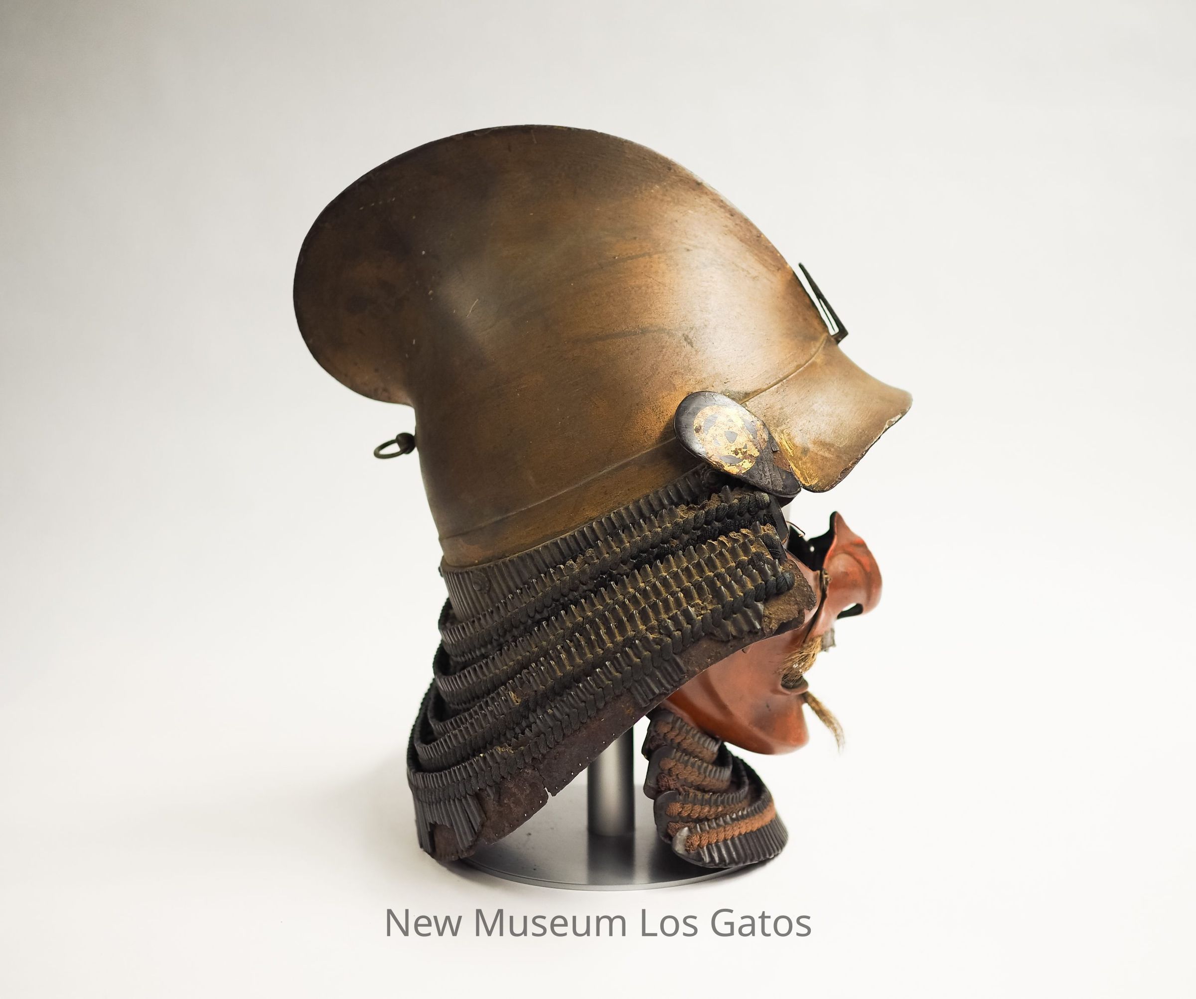 A samurai battle helmet, known as a kabuto. The iron helmet is domed and curved, and has a plain hook on the front, where a crest (usually an animal) would go. Attached around the back of the helmet is a neck guard, consisting of six tiers of metal with braided fabric. Attached to the front of the helmet is a metal face guard, or menpo, shaped like the face of a man, that has been painted red and has faux mustache and goatee hair. Attached below the face is an additional neck guard, that features four tiers of metal and braided fabric.Collection