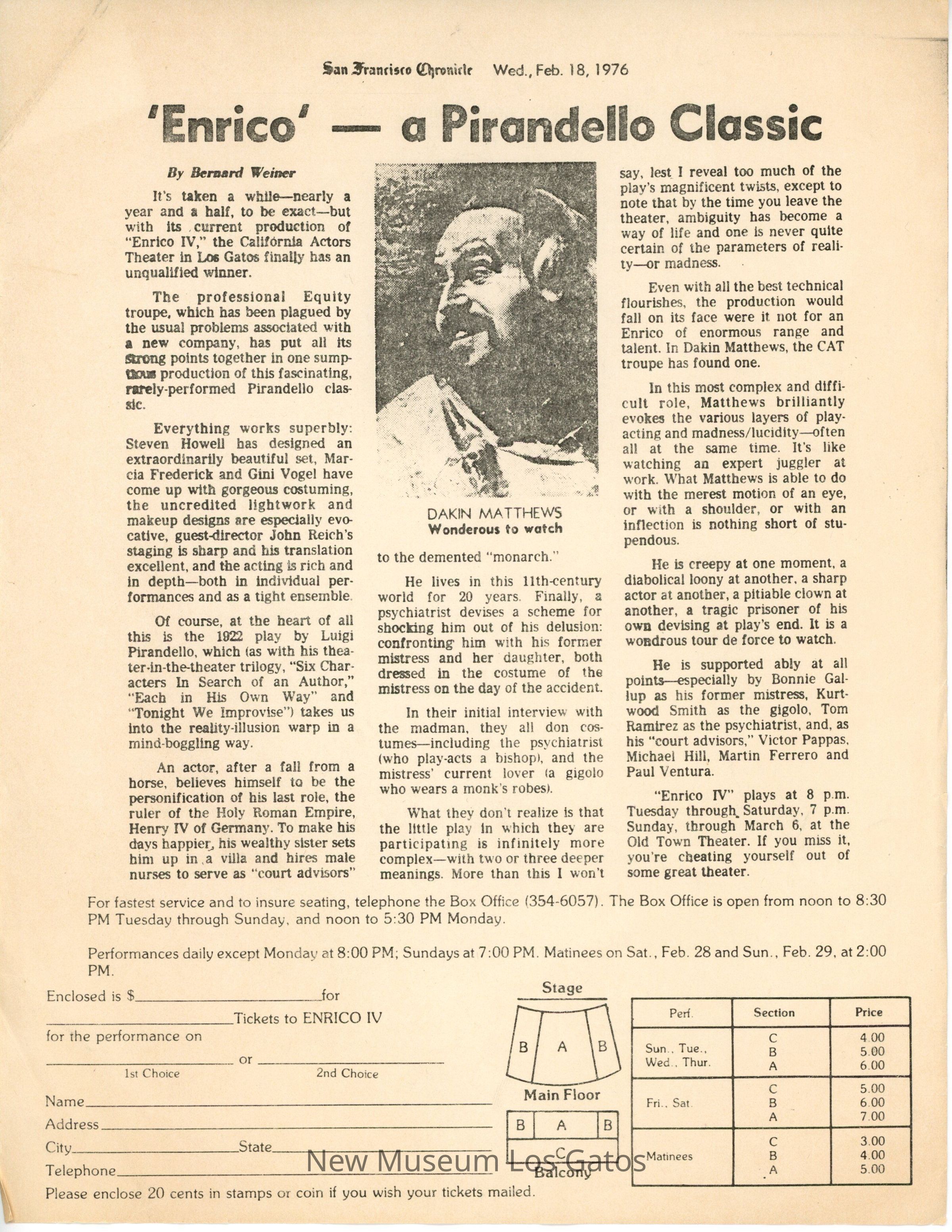 A photocopy of an article in the San Francisco Chronicle, reviewing the California Actors Theatre's 1976 production of "Enrico IV."