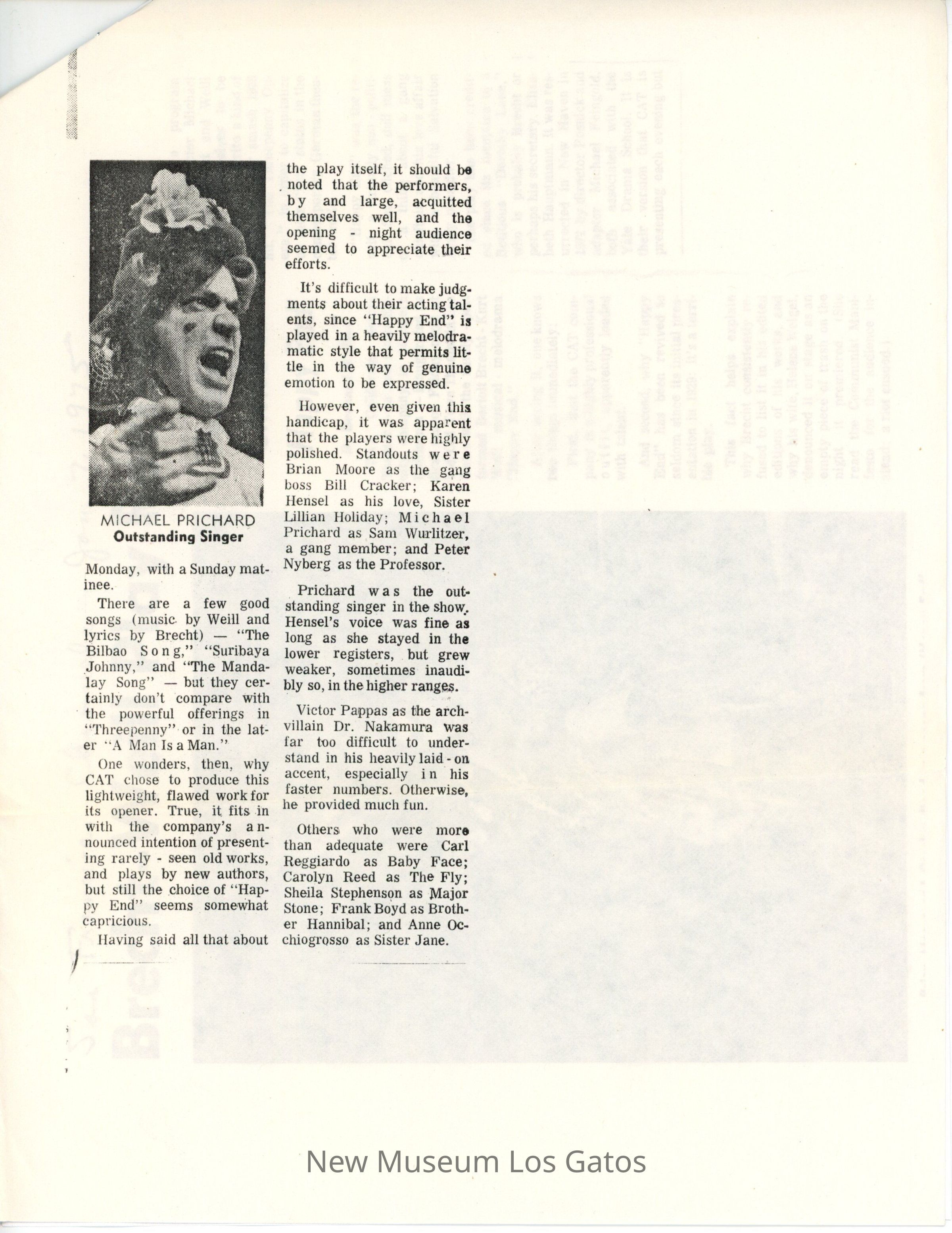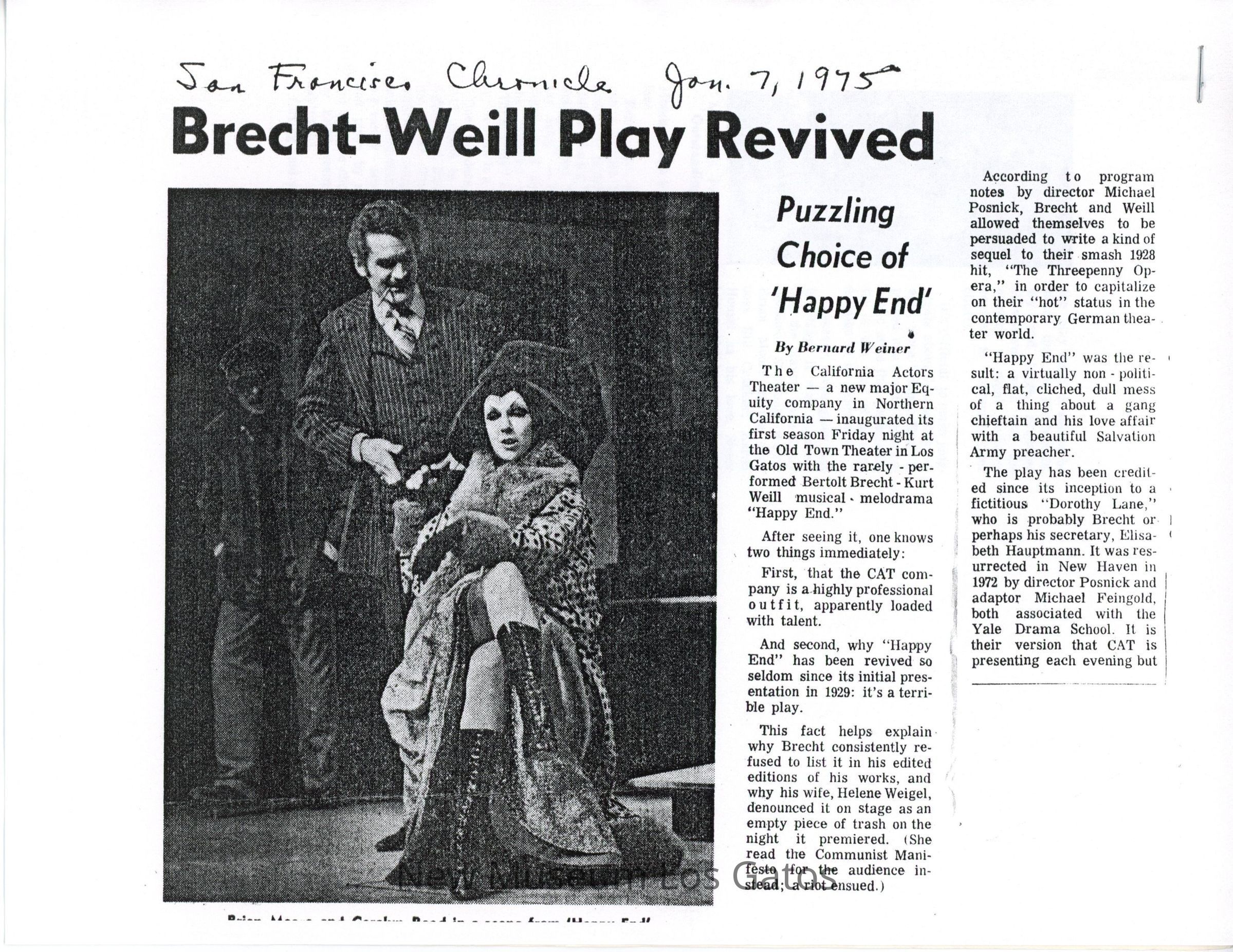 A photocopy of a newspaper article from the San Francisco Chronicle, reviewing CAT's inaugural production of "Happy End."