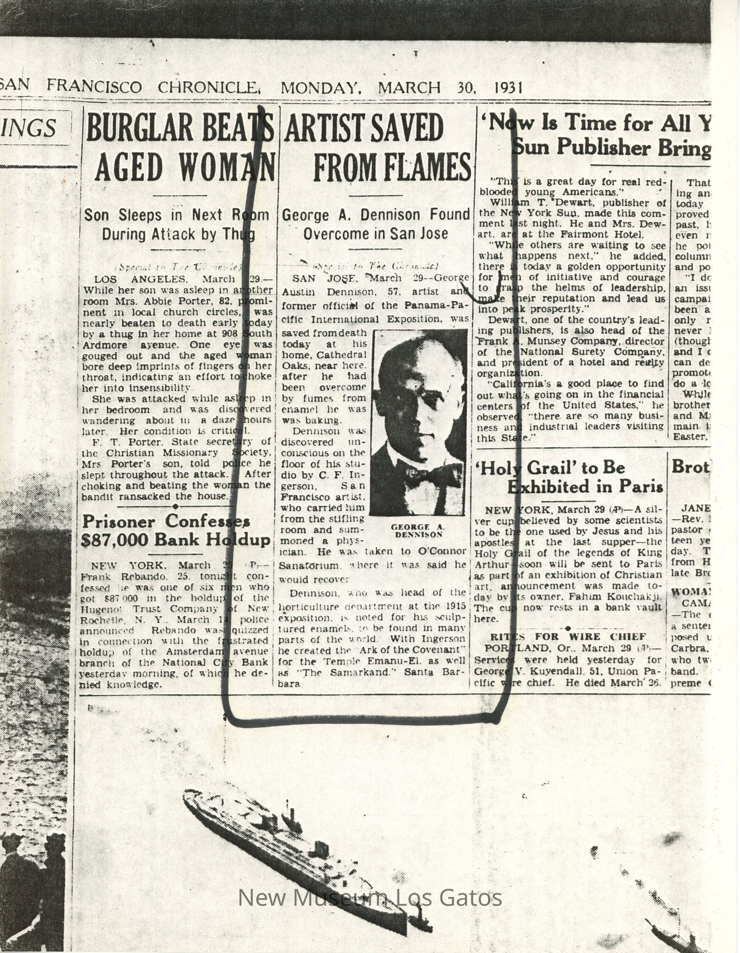 Black and white photocopy of an article in the San Francisco Chronicle, Monday March 30th, 1931. The article details Frank Ingerson saving George Dennison from being suffocated by fumes from enamel baking in their studio at Cathedral Oaks. The article has a photograph of George. The article is encircled by marker.Collection