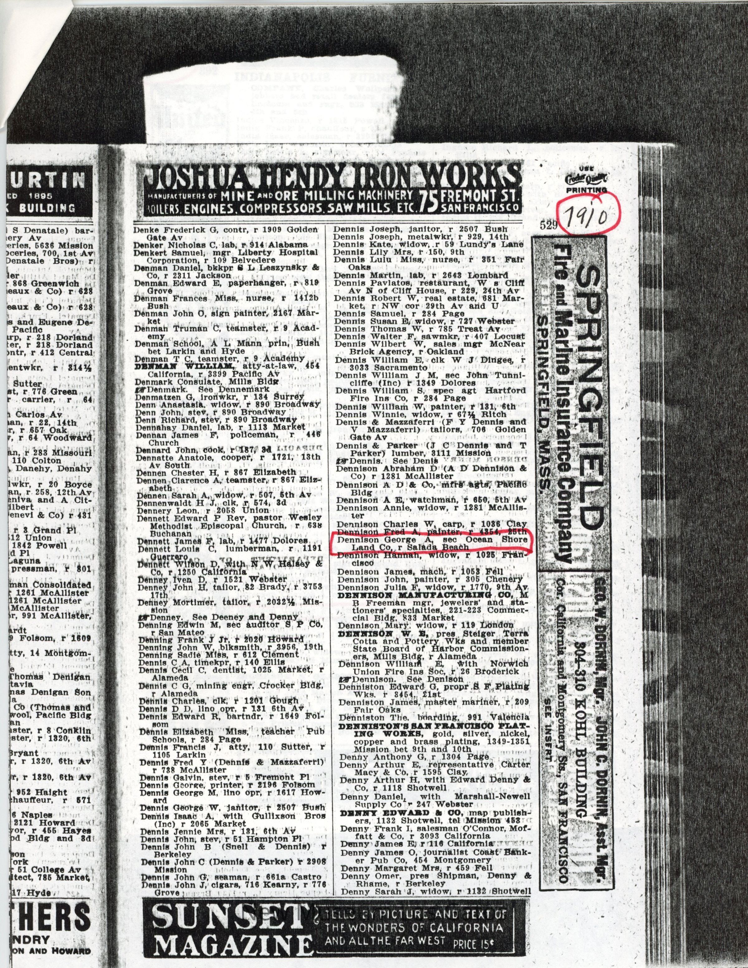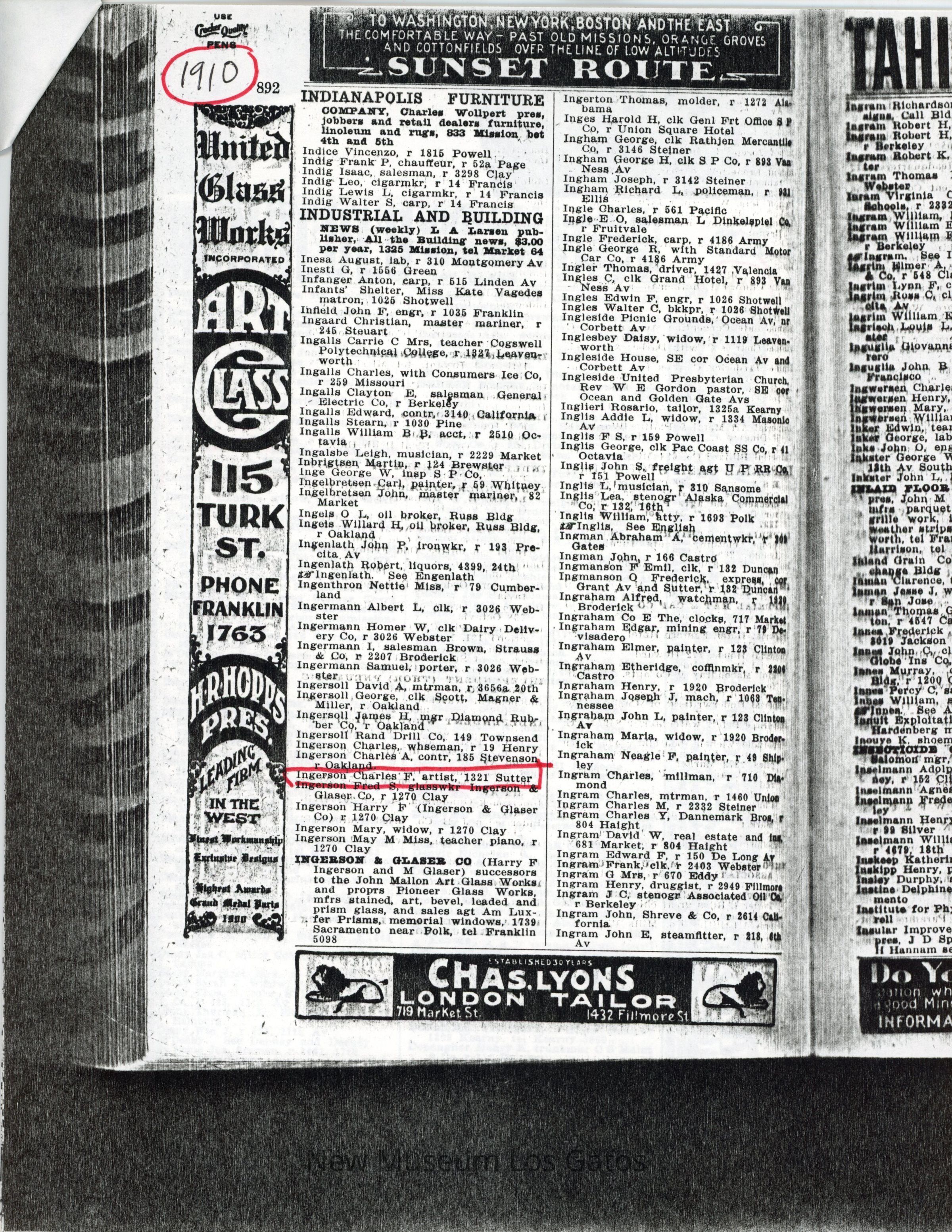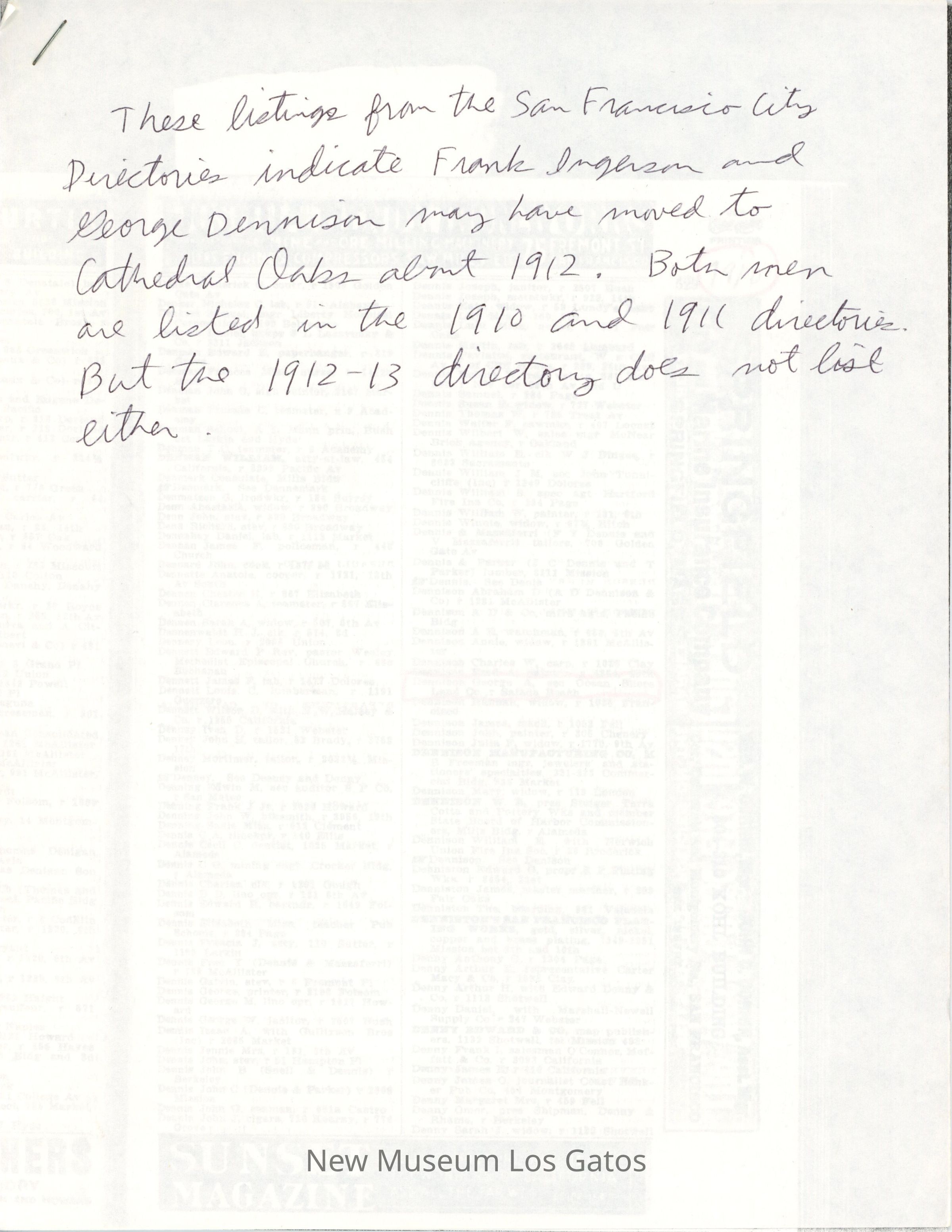 Copies of the San Francisco directory from 1910-1913. These documents show that Frank and George moved to Cathedral Oaks in 1912 as their names do not appear in the 1912-13 directory.