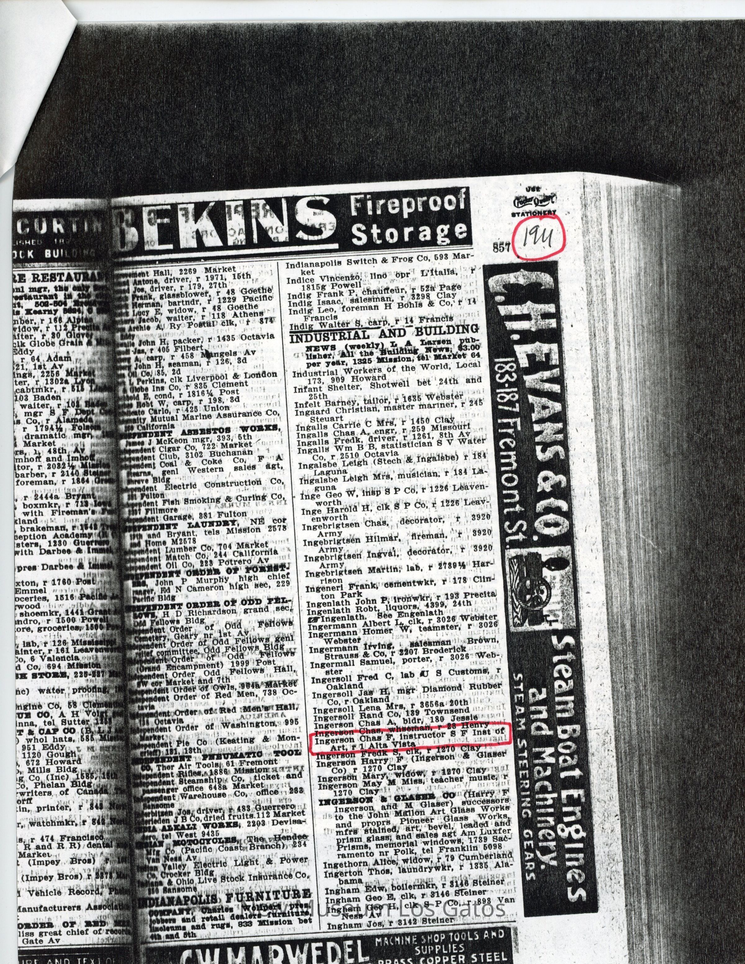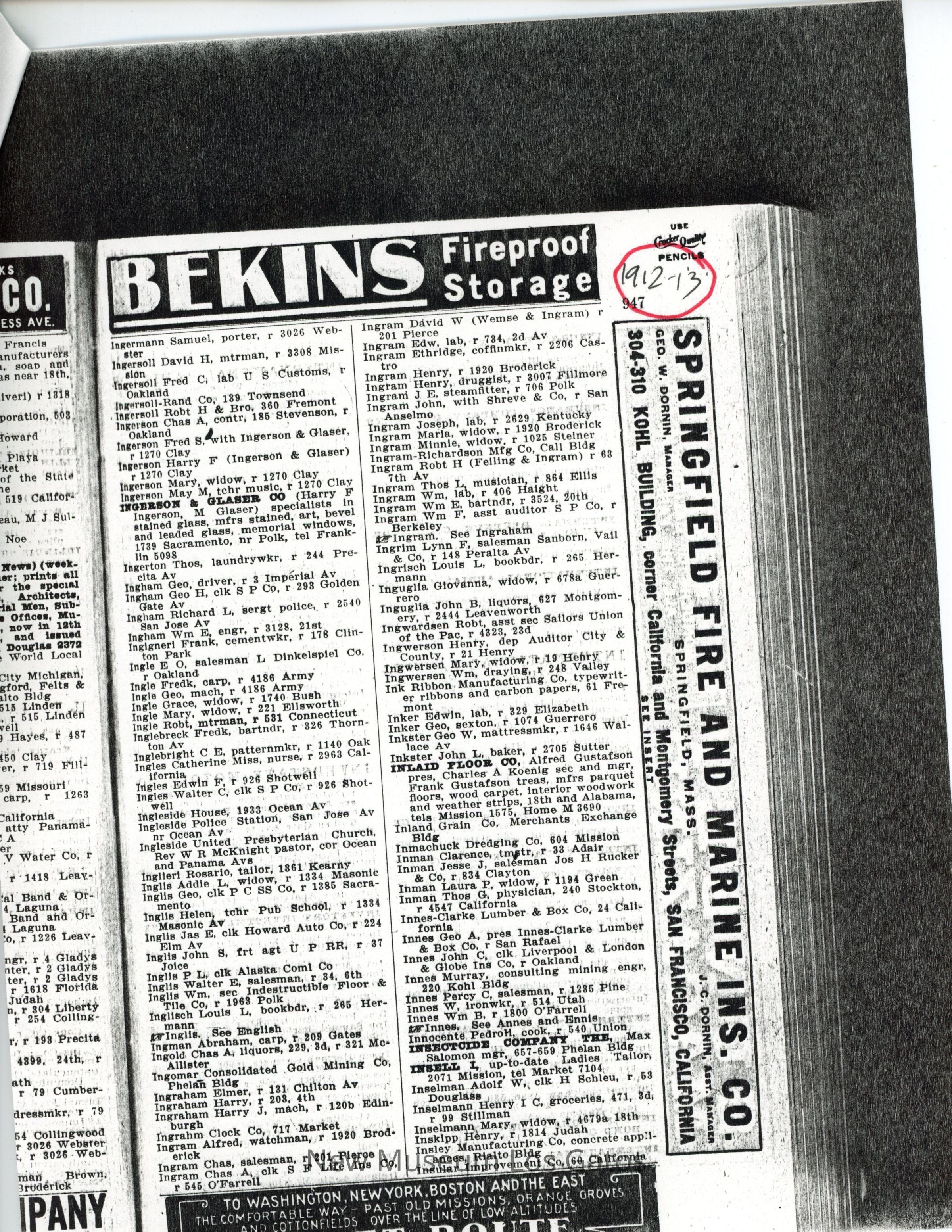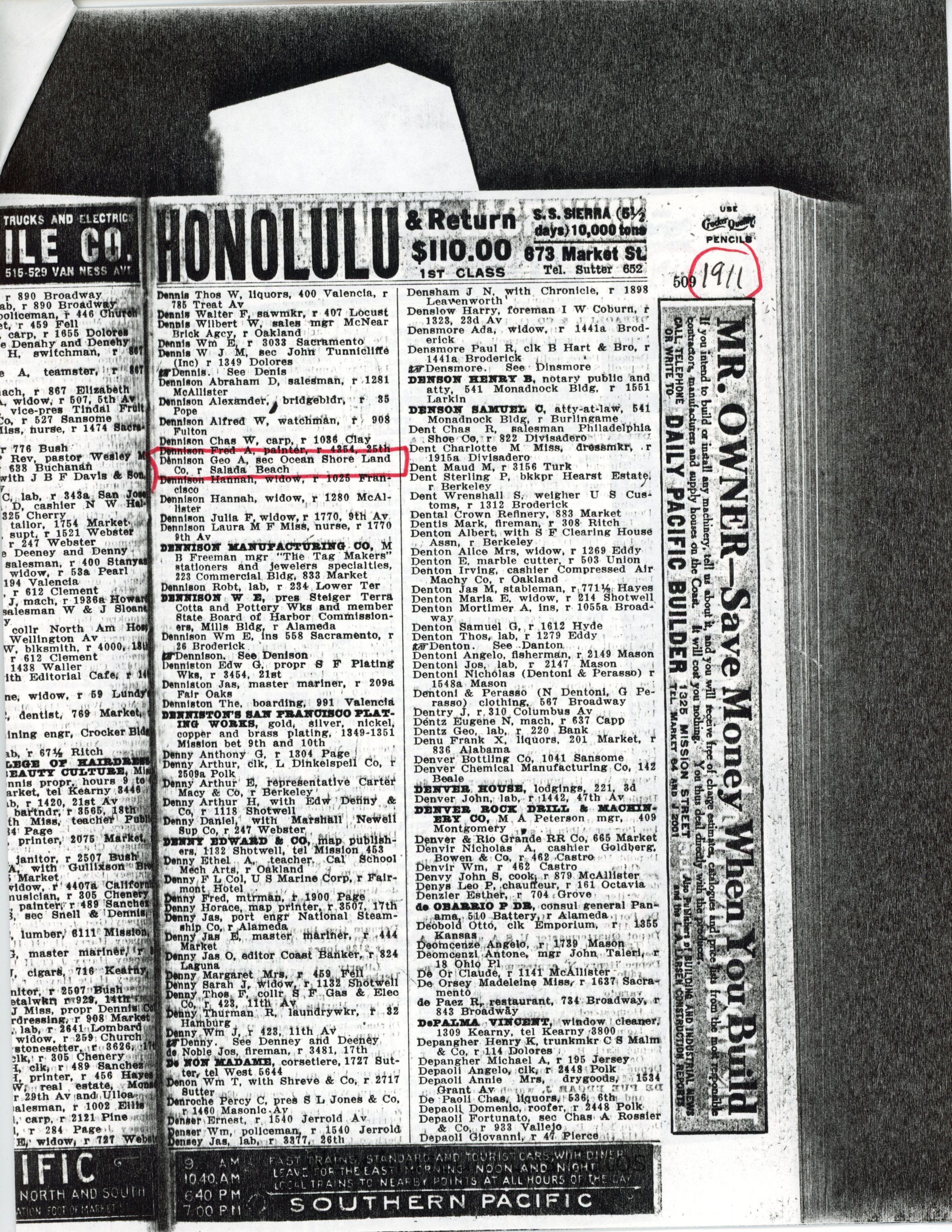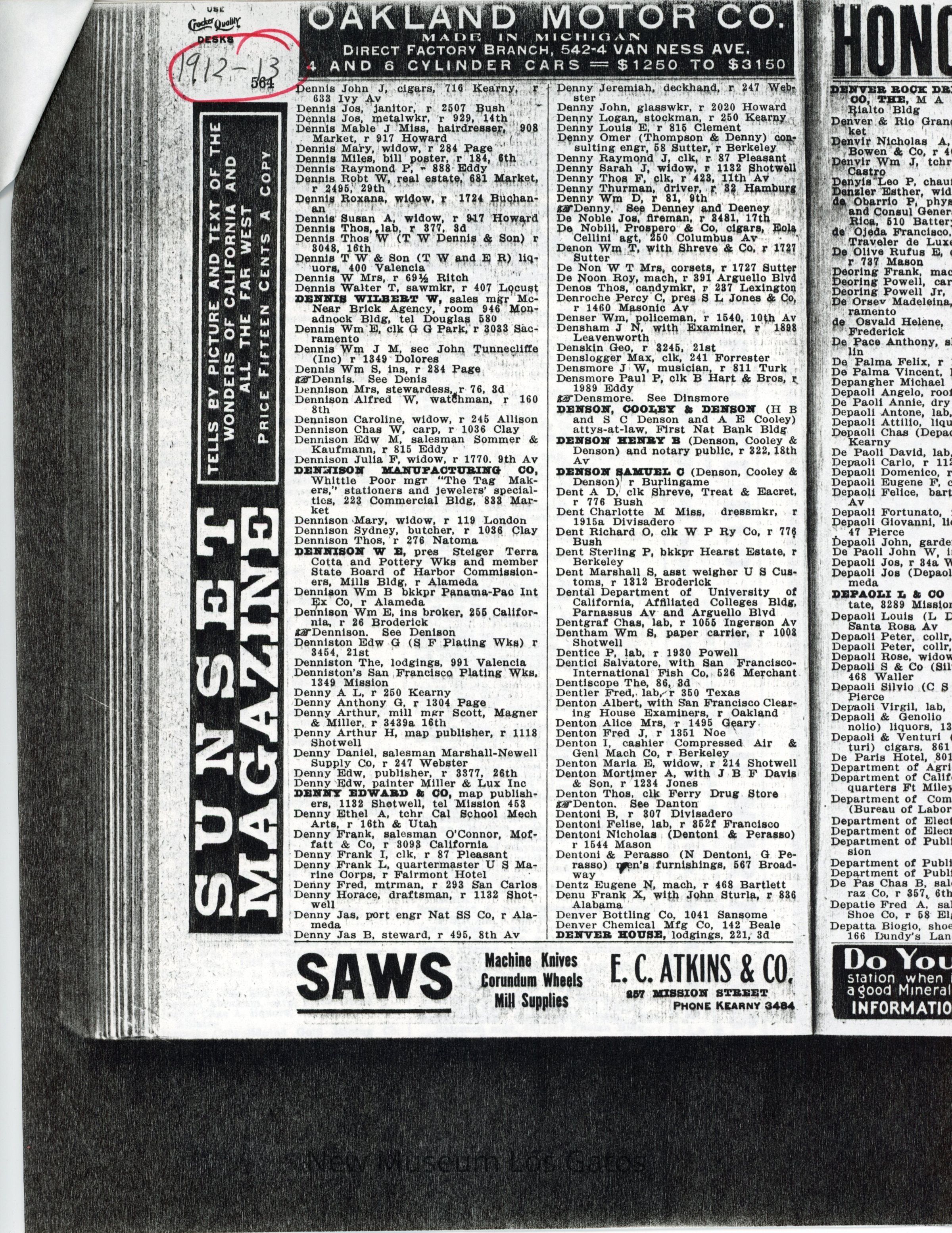 Copies of the San Francisco directory from 1910-1913. These documents show that Frank and George moved to Cathedral Oaks in 1912 as their names do not appear in the 1912-13 directory.