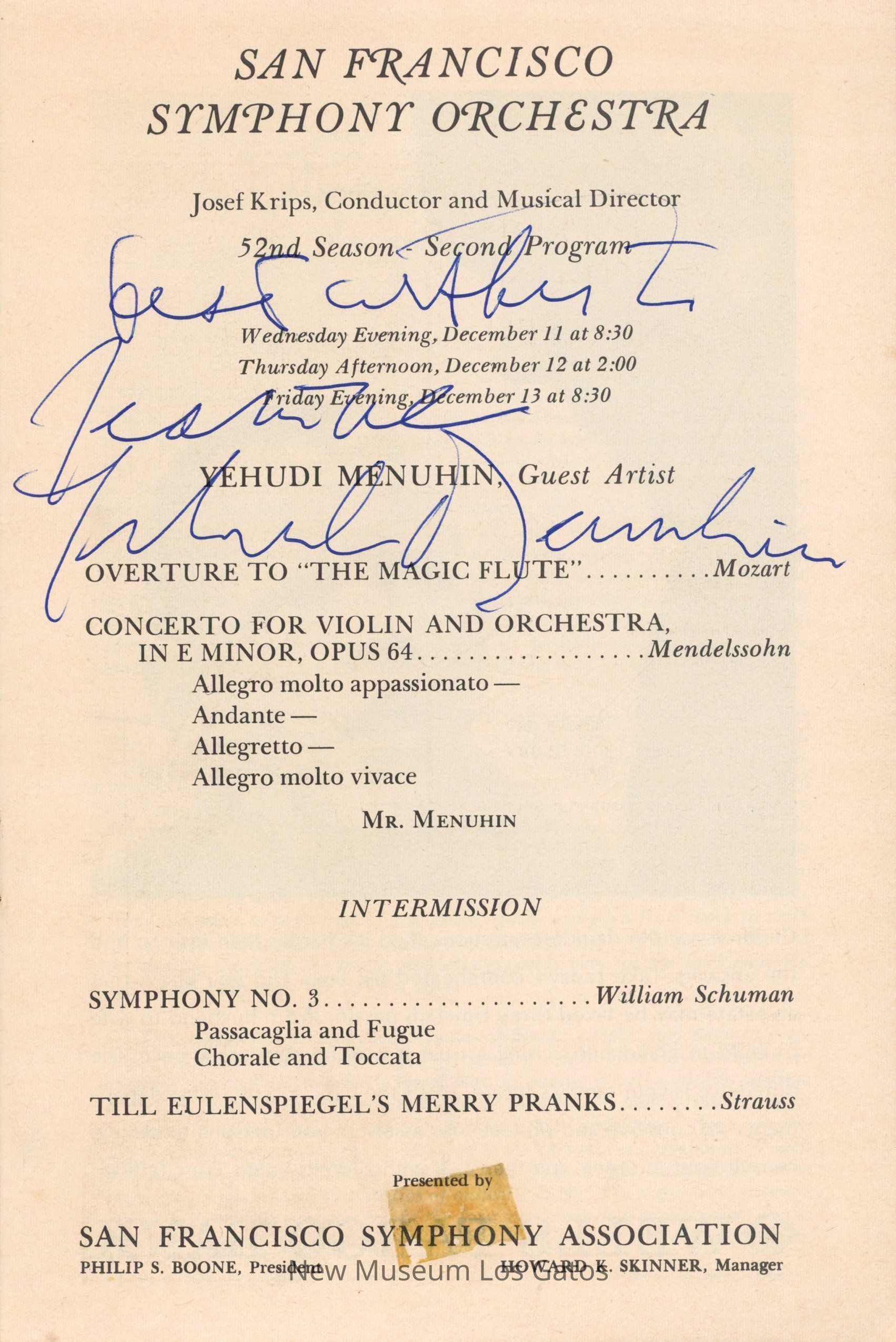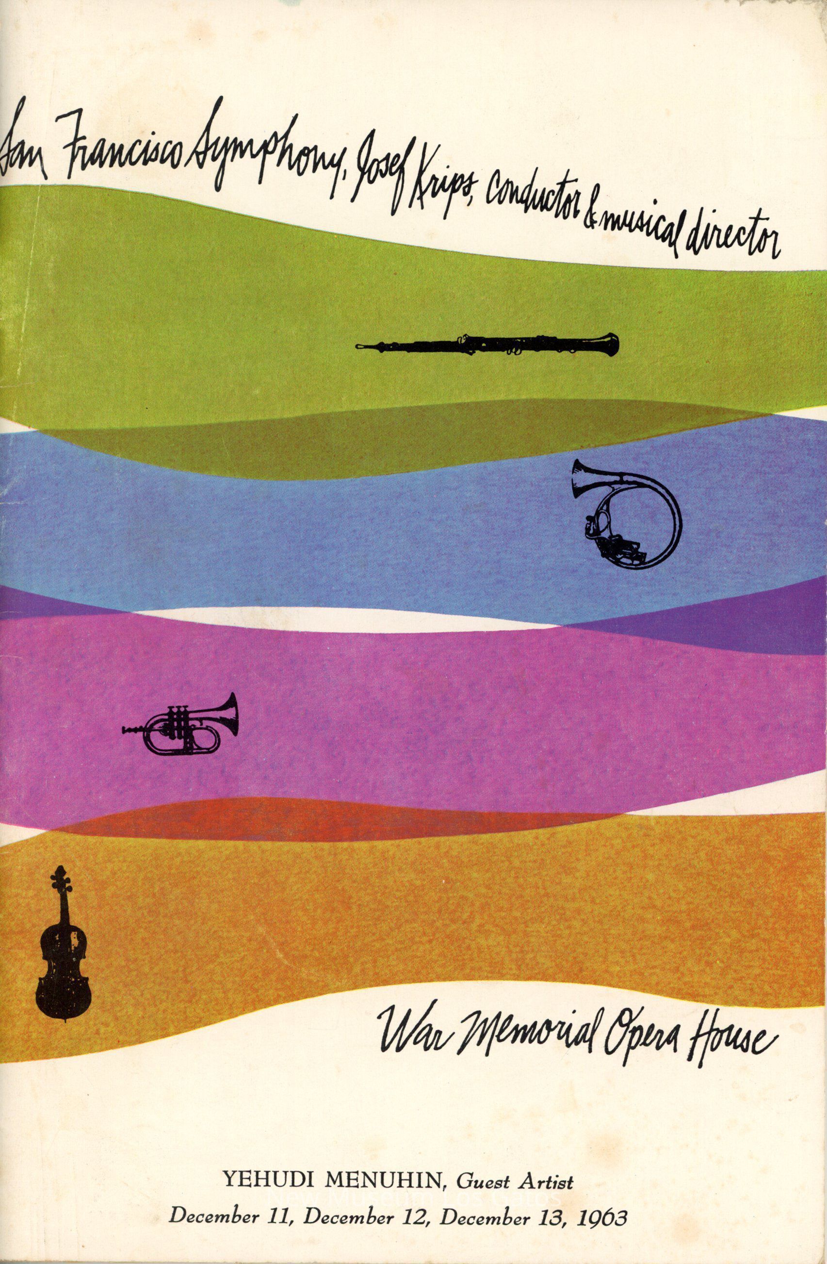 Booklet with program information for the San Francisco Symphony Orchestra. The booklet is white with green, blue, pink, and orange stripes on the cover. The booklet is signed by Yehudi Menuhin on the inside. The booklet is dated December, 1963.Collection
