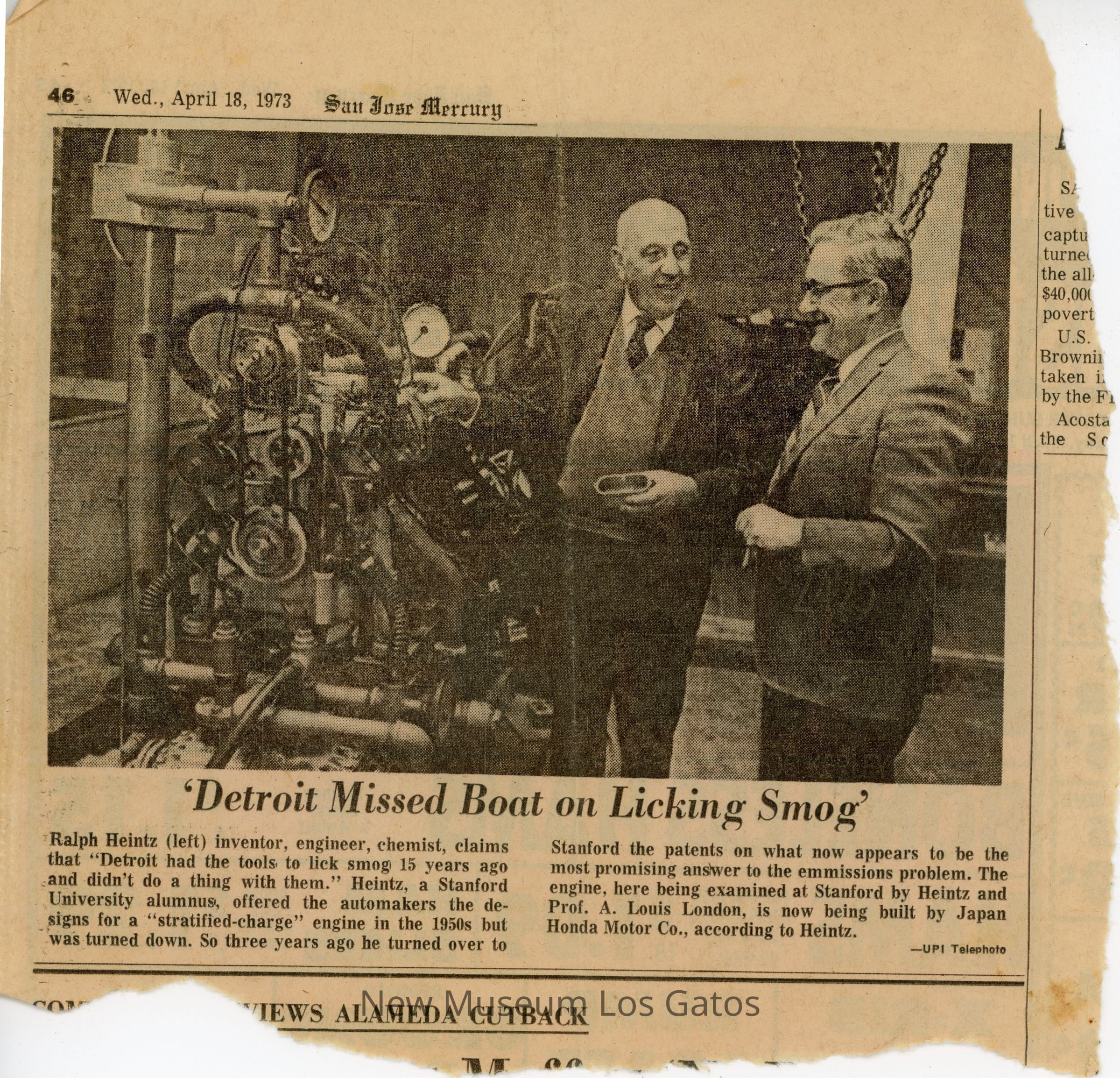 A clipping from the San Jose Mercury, published Wednesday, April 18, 1973. The clipping is about Ralph Heintz, inventor, engineer, and chemist, designed an engine to help with smog. Heintz offered Detroit automakers his design and they declined. The engine design was then given to Honda Motor Co.Collection