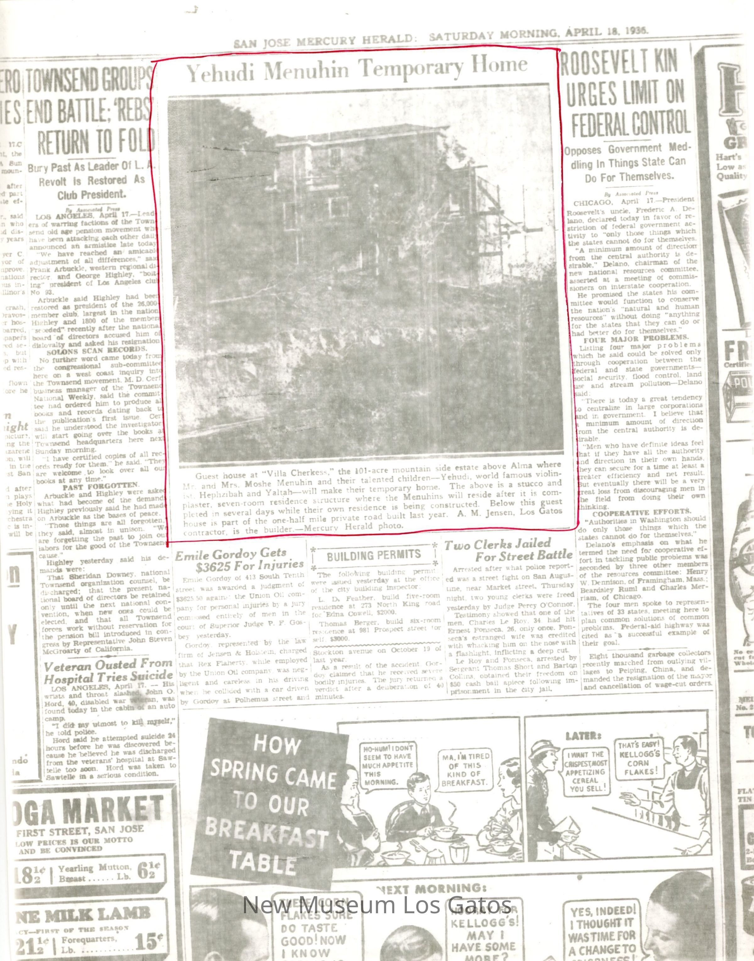 Photocopy of San Jose Mercury Herald newspaper from the morning edition of April 18th, 1936. Relevant article circled in red ink regards violinist Yehudi Menuhin and family staying at a guesthouse during the construction of their home in Los Gatos, CA.Collection