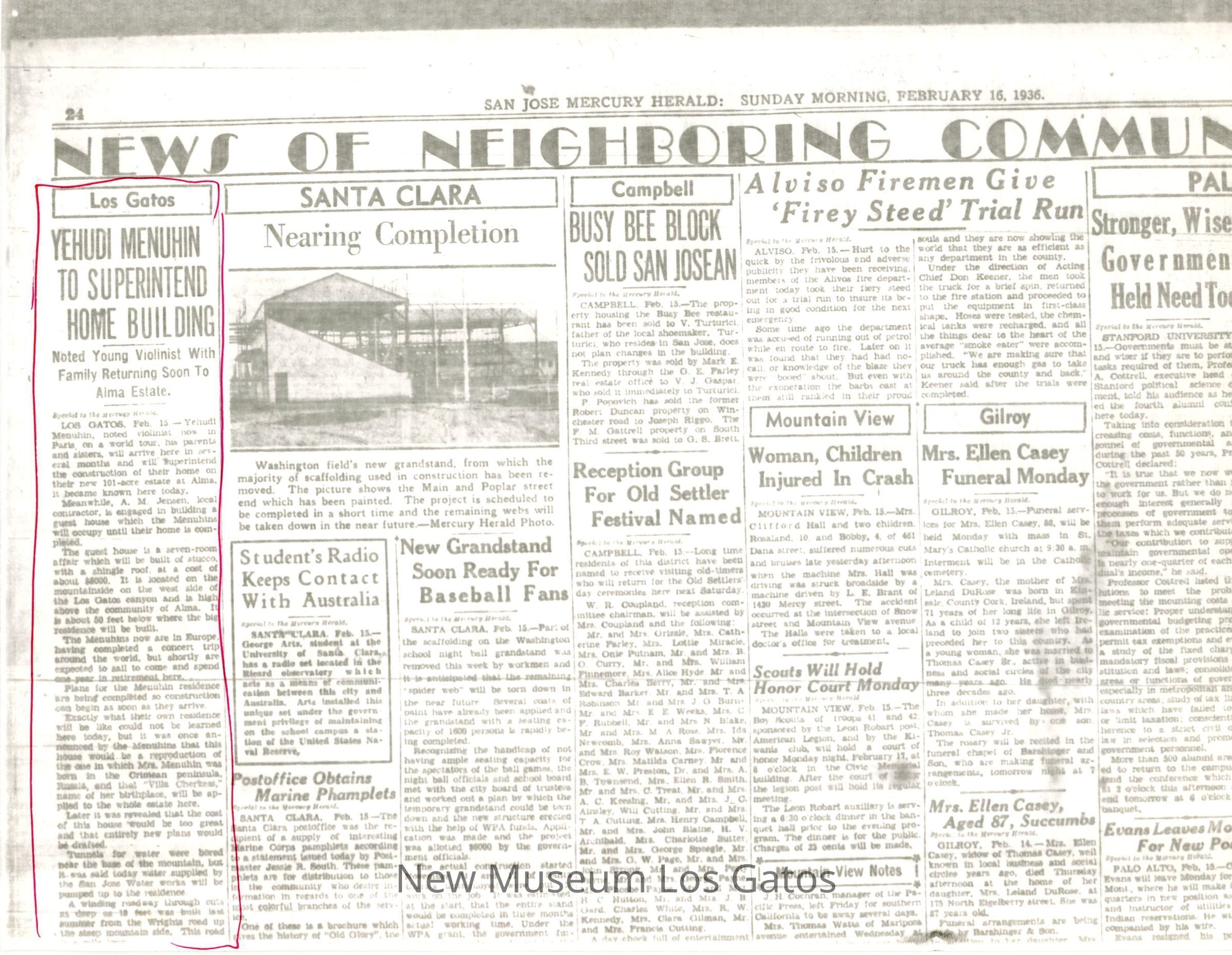Photocopy of San Jose Mercury Herald newspaper from the morning edition of February 16th, 1936. Relevant article circled in red ink regards violinist Yehudi Menuhin overseeing the construction of his family home in Los Gatos.Collection