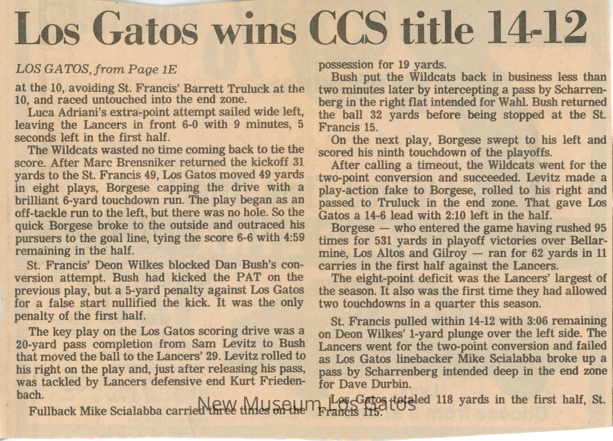 Two newspaper clippings, from the sports section of the San Jose Mercury News, about the LGHS football team winning CCS in 1985.Collection