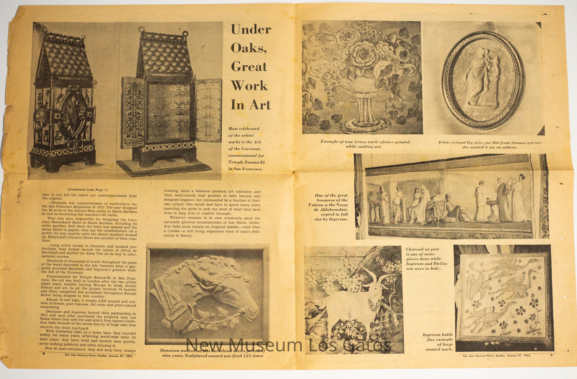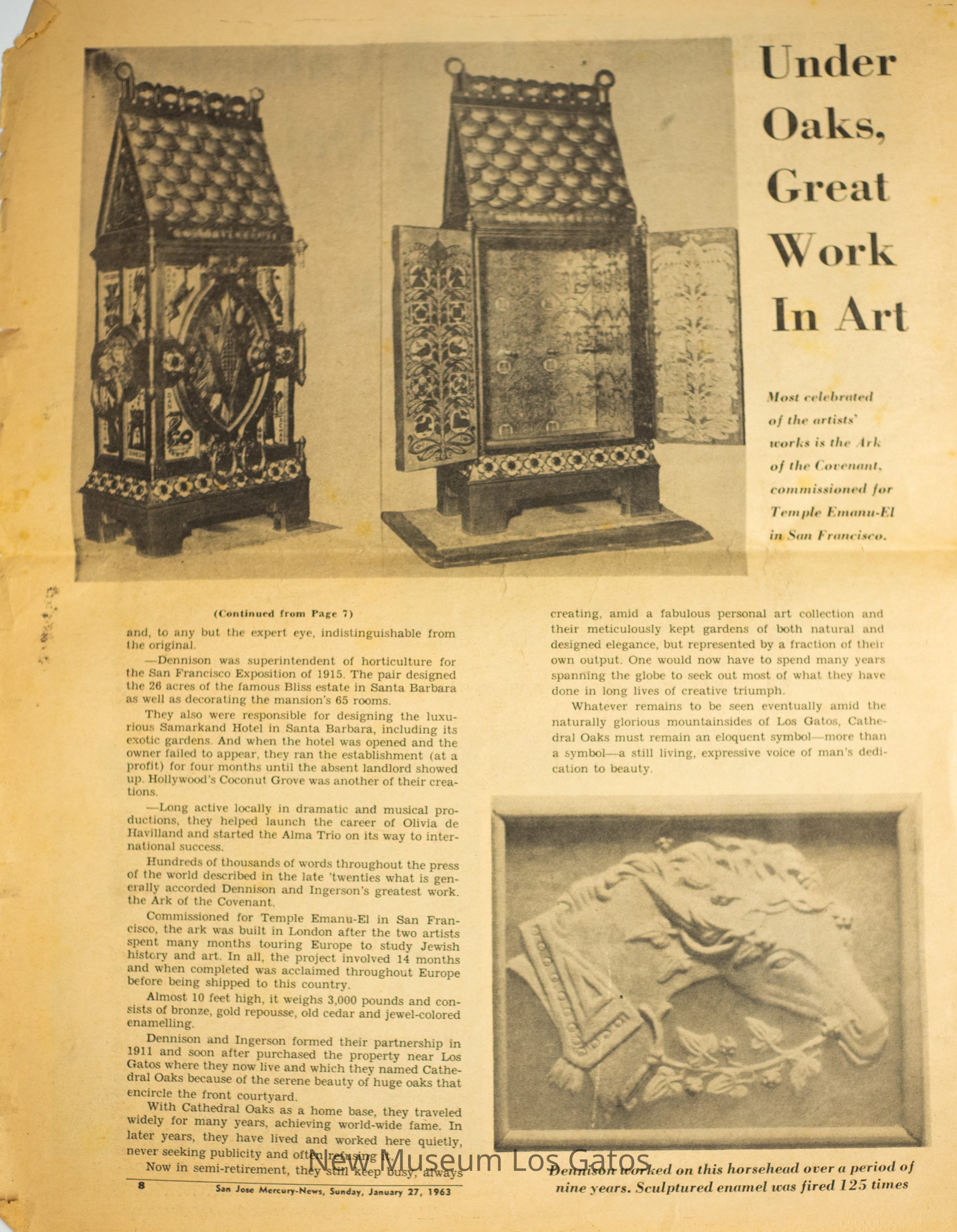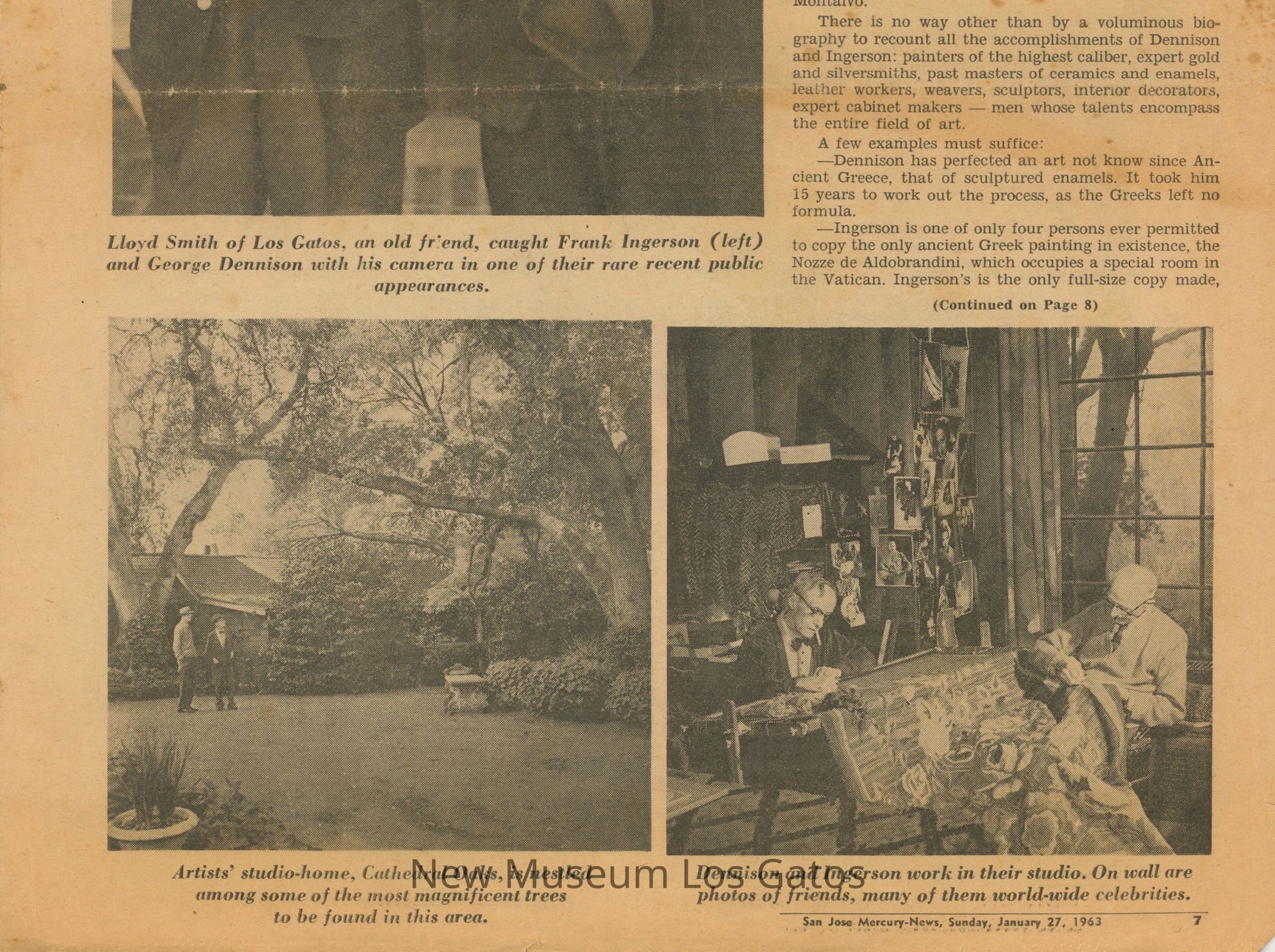 Pages 7-10 from the San Jose Mercury News, Sunday January 27th, 1963. The saved article details information on the home of Frank Ingerson and George Dennison, also known as Cathedral Oaks.Collection