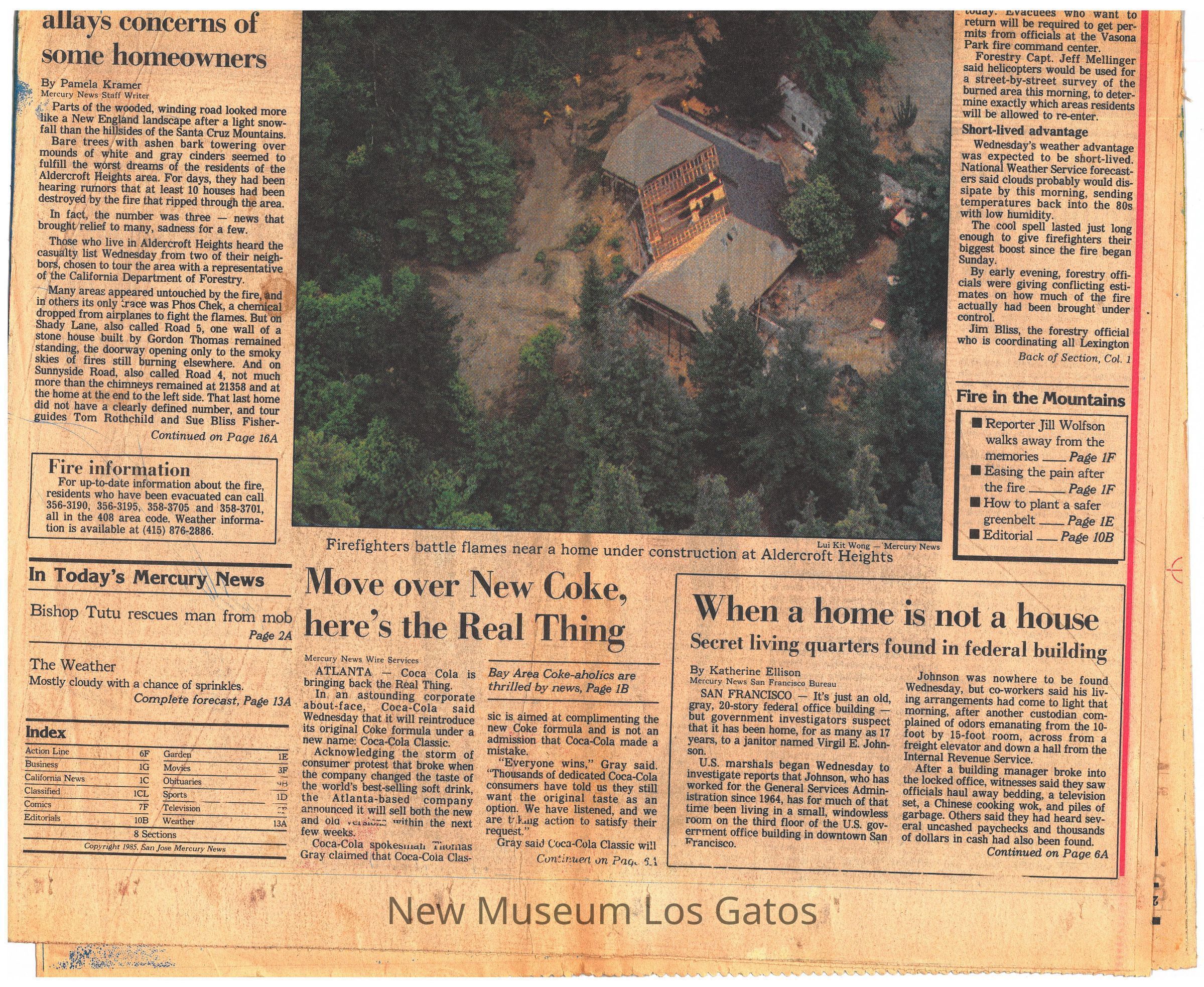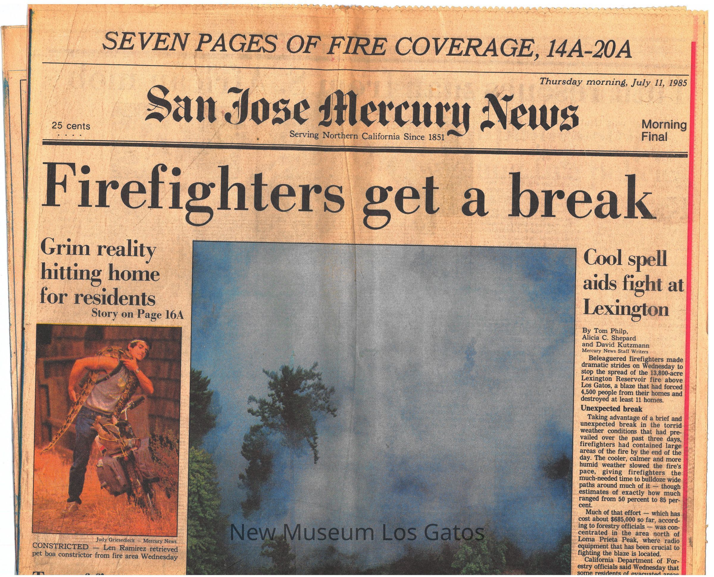 Pages 14A-20A from a San Jose Mercury News publication describing local firefighters' response to the Los Gatos fire of 1985 near Lexington Reservoir.Collection