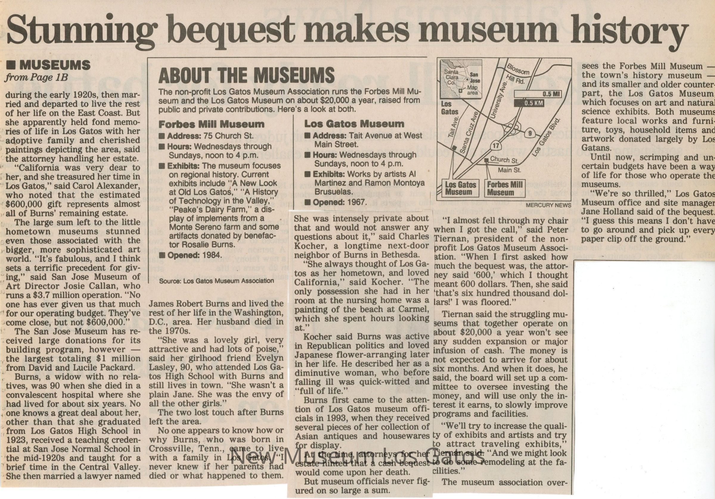 Three newspaper clippings featuring a single story about the transformative bequest of Rosalie Burns in 1996. The first two clippings have been glued to a piece of black construction paper, while the third clipping is loose.Collection