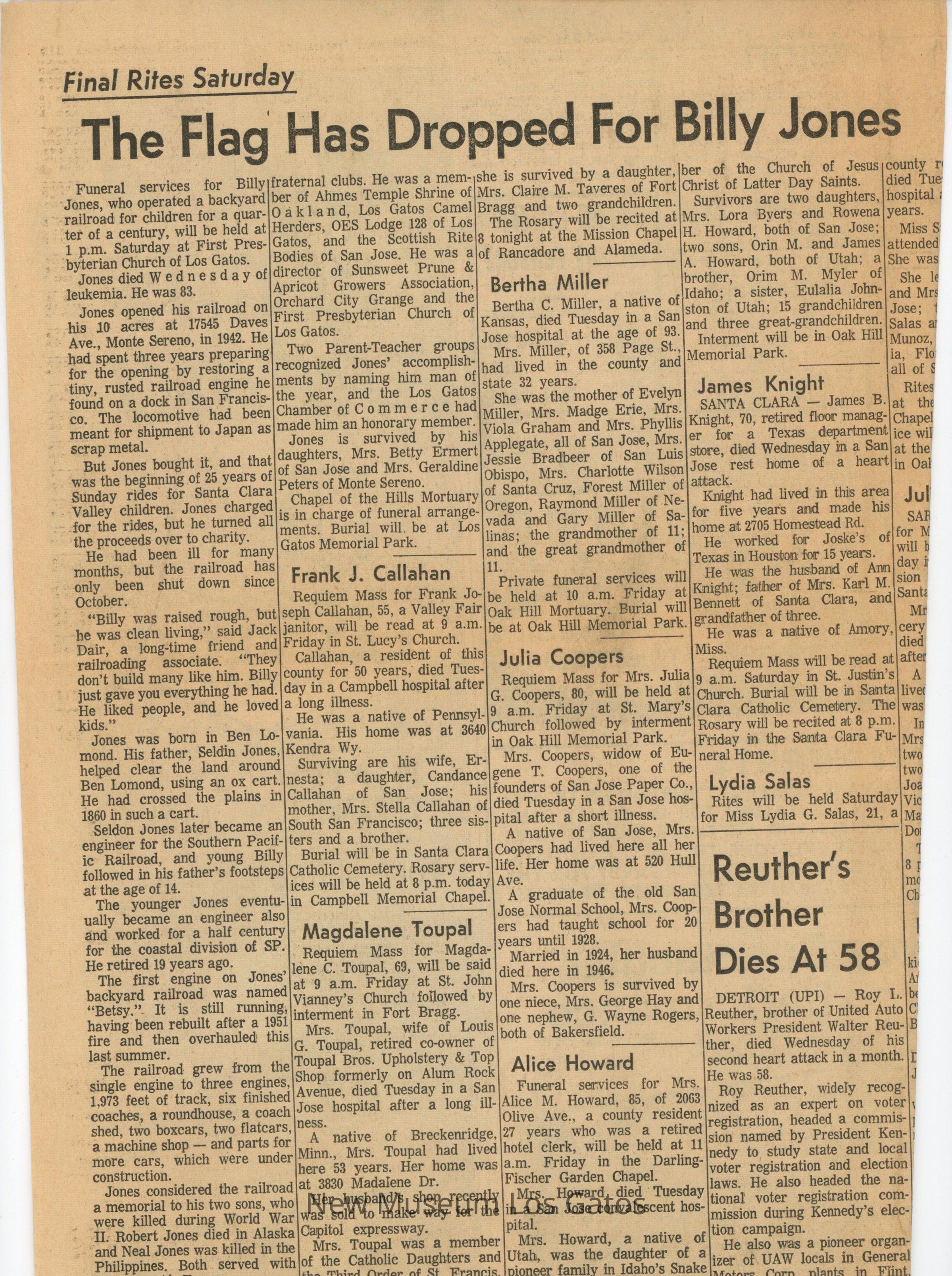 A page from the San Jose News, which has the obituary for Billy Jones, who died the previous day of leukemia.Collection