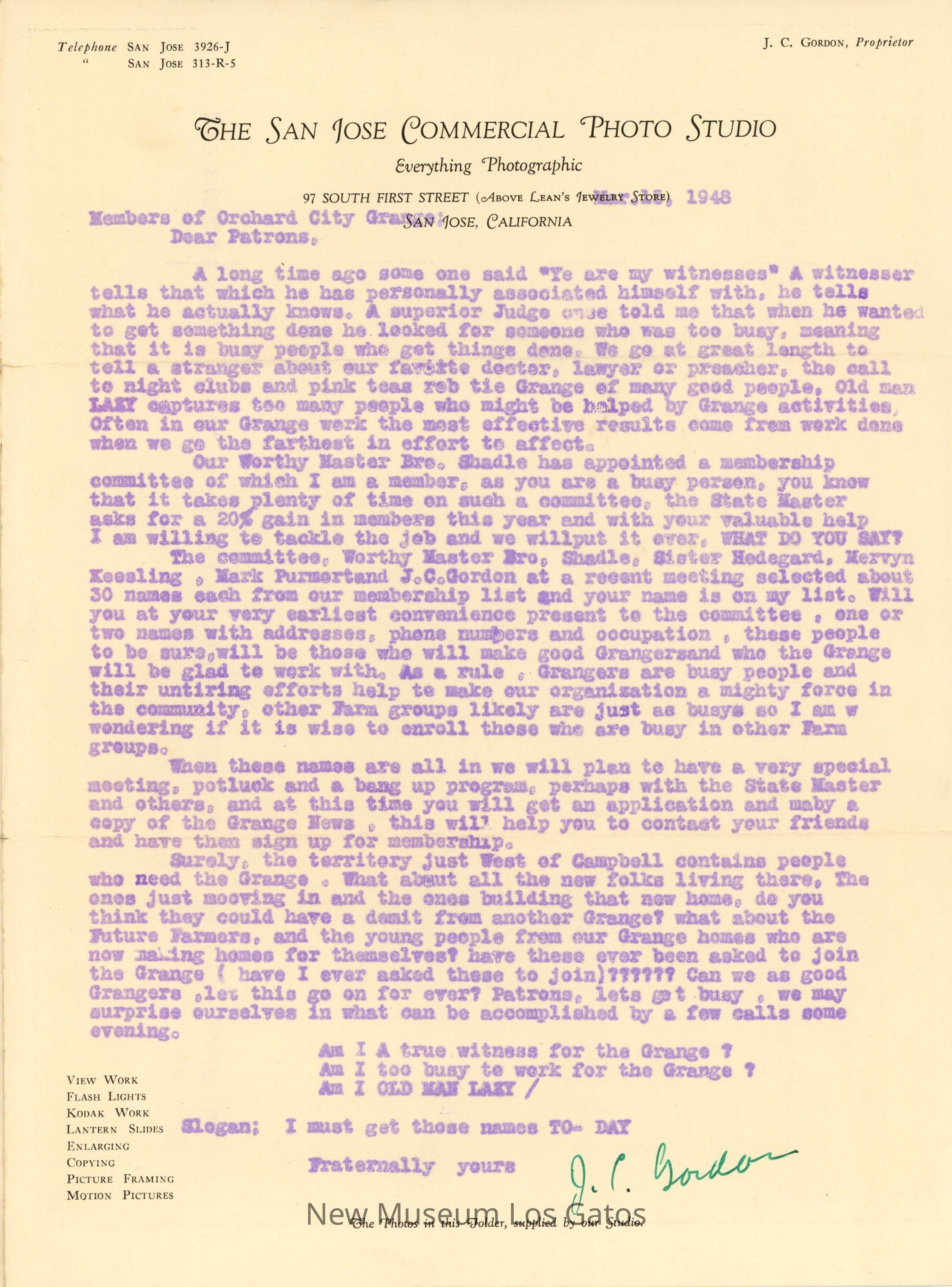 Yellowed advertising pamphlet for The San Jose Commercial Photo Studio, with a typed inscription from the proprietor regarding membership to The Grange society. The covers and inside pages have labelled photographs taken by the studio's proprietor.Collection