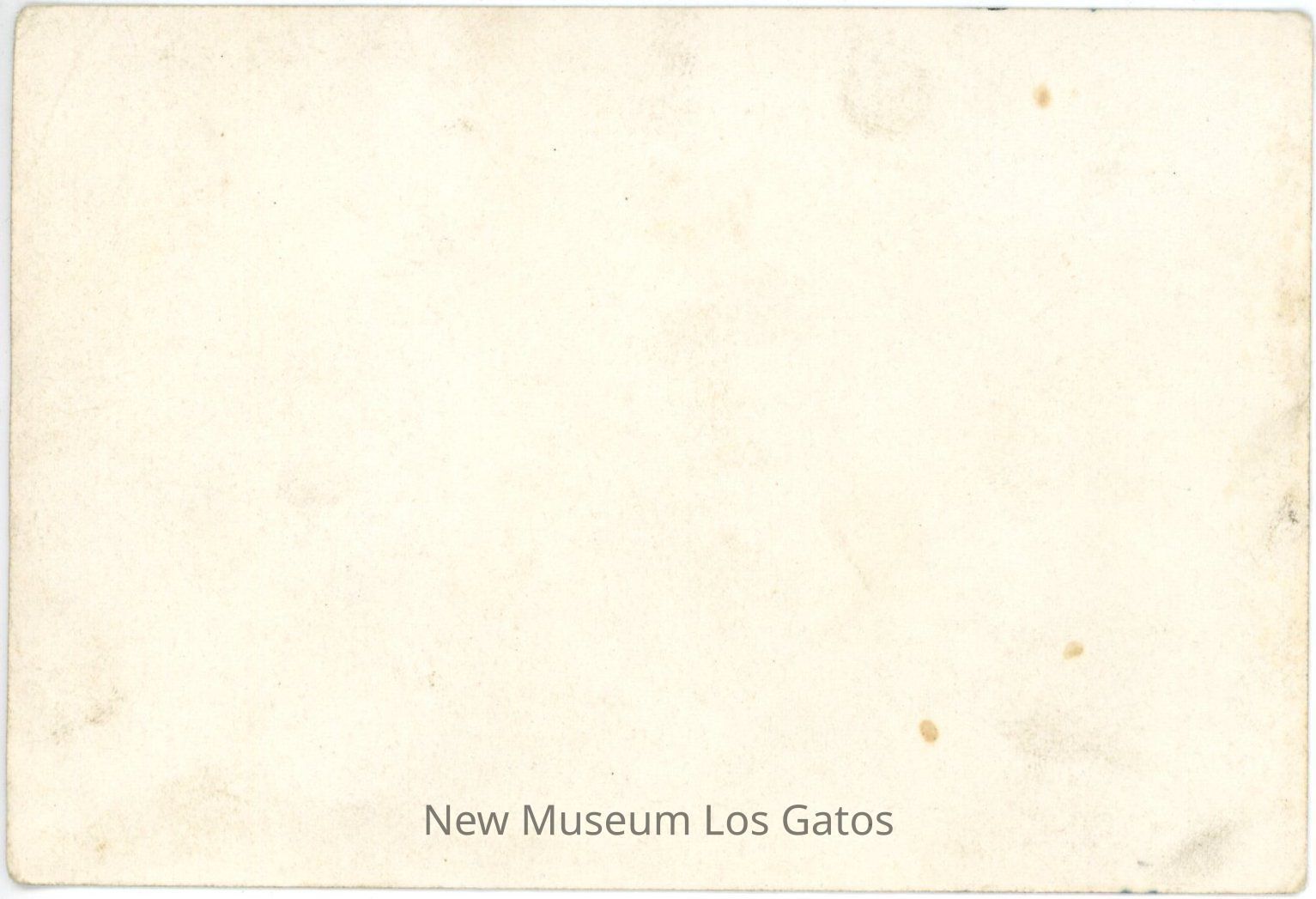 A black and white photograph featuring a San Jose Railroad Club train. The steam engine is attached to at least two passenger cars. There are buildings and trailers behind the train. There is a man, most likely Billy Jones, in a dark suit standing to the side of the engine. The image is surrounded by a white border.Photograph Details