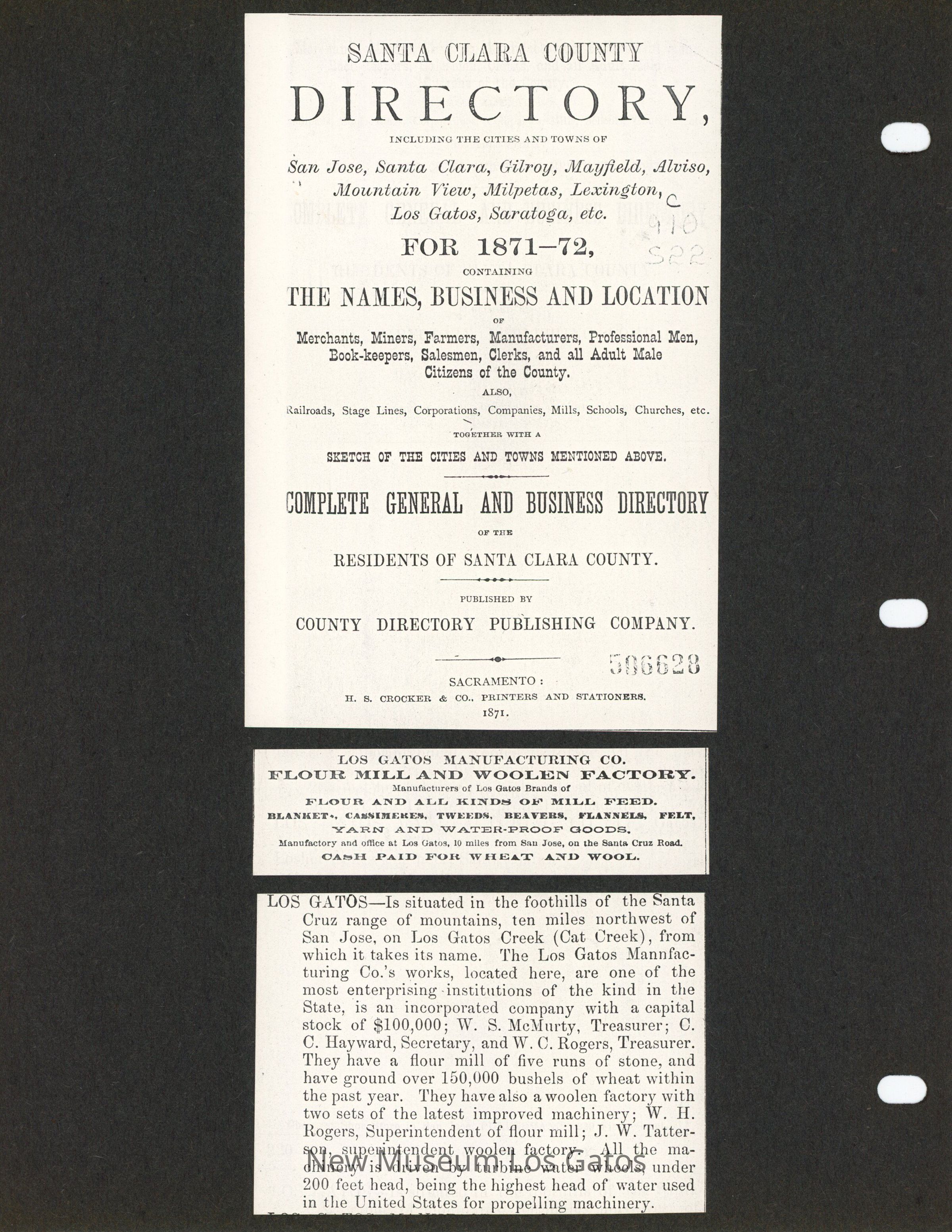 A directory for Santa Clara County cities and towns, as well as the businesses, schools, and other sites of interest. The excerpt is in three pieces, and highlights the sections on Los Gatos. All three pieces are glued to a piece of black construction paper.Collection