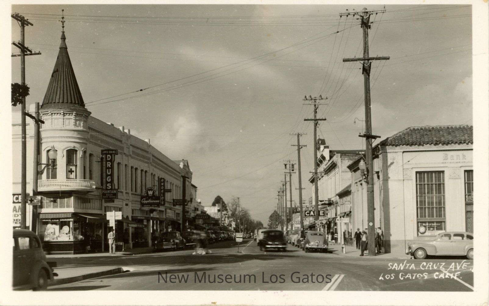 A postcard featuring a black and white photograph of Santa Cruz Ave., at the corner of Main St., in Los Gatos, California. There is a white border surrounding the photograph.Subject Place