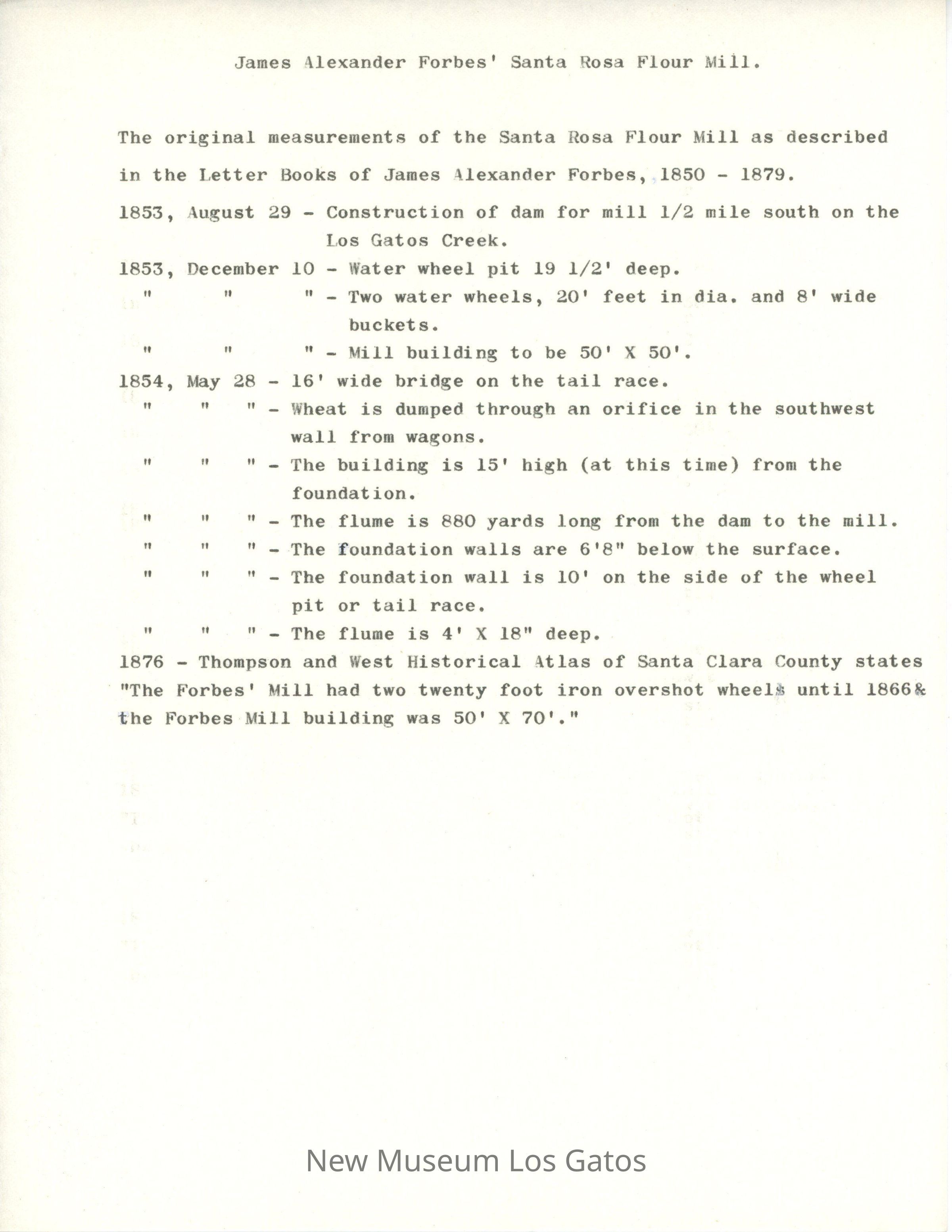 Details the original measurements of Forbes Mill