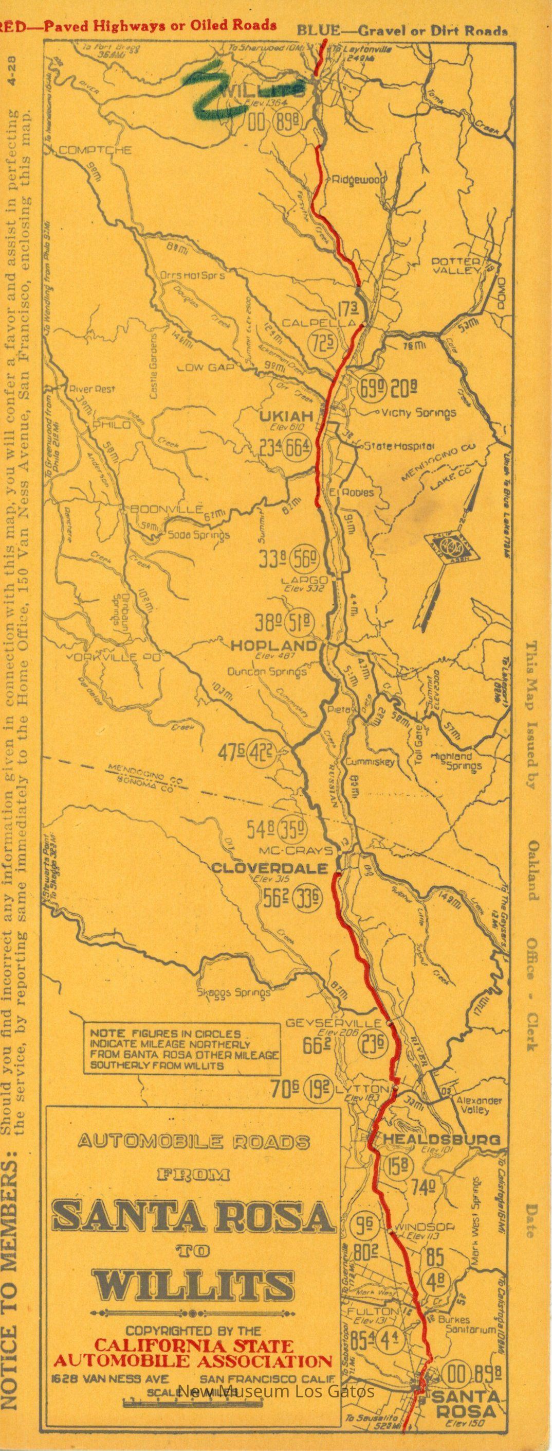 A small, single-sheeted cardstock map, depicting the highways and roads, both paved and unpaved, that go from Willits to Garberville. There is also information about approved service stations and hotels in that area.Collection